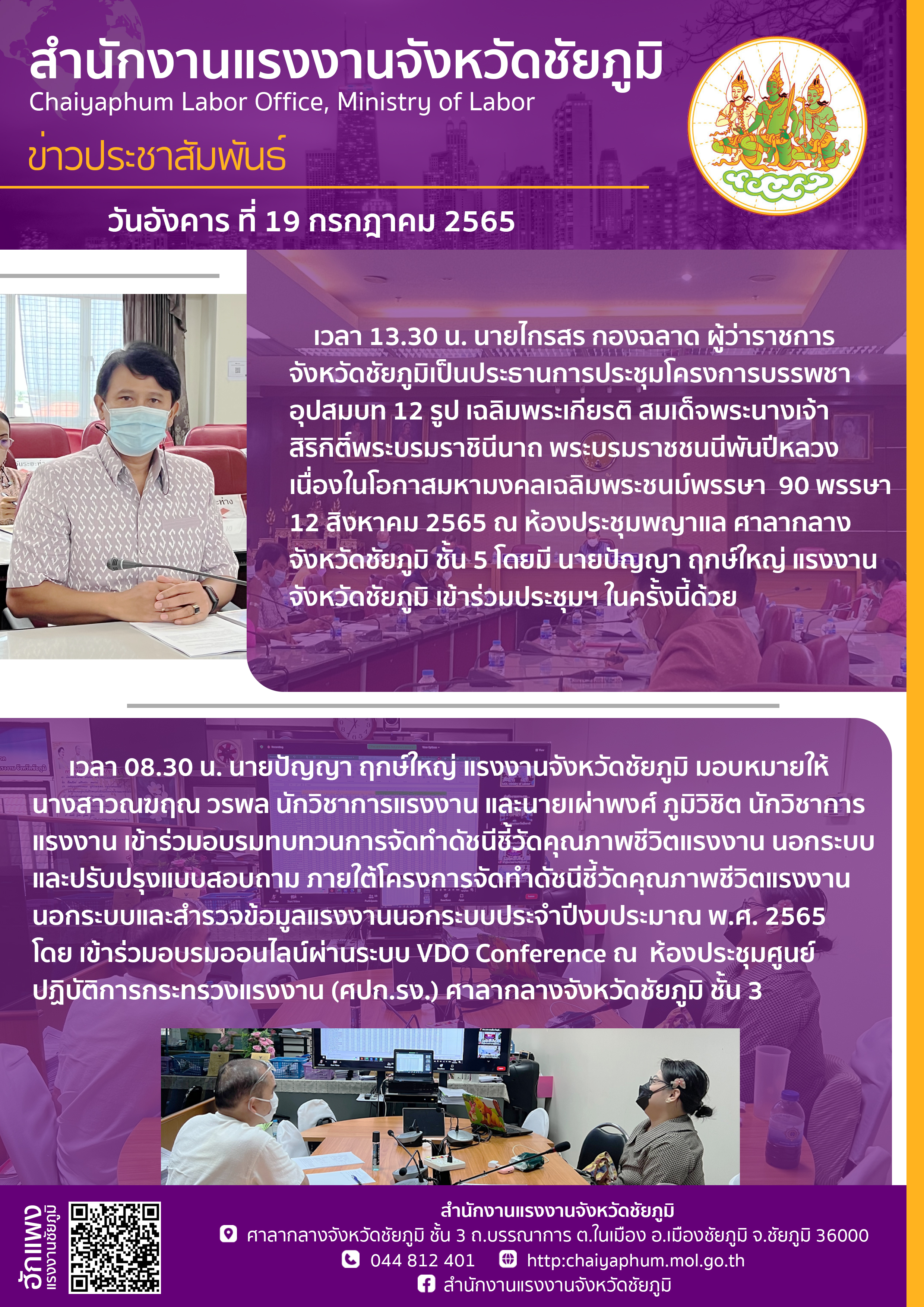 -เวลา 08.30 น. นายปัญญา ฤกษ์ใหญ่ แรงงานจังหวัดชัยภูมิ มอบหมายให้ นางสาวณฆฤณ วรพล นักวิชาการแรงงาน และนายเผ่าพงศ์ ภูมิวิชิต นักวิชาการแรงงาน เข้าร่วมอบรมทบทวนการจัดทำดัชนีชี้วัดคุณภาพชีวิตแรงงานนอกระบบและปรับปรุงแบบสอบถามภายใต้โครงการจัดทำดัชนีชี้วัดคุณภาพชีวิตแรงงานนอกระบบและสำรวจข้อมูลแรงงานนอกระบบประจำปีงบประมาณ พ.ศ. 2565 โดย เข้าร่วมอบรมออนไลน์ผ่านระบบ VDO Conference ณ ห้องประชุมศูนย์ปฏิบัติการกระทรวงแรงงาน (ศปก.รง.) ศาลากลางจังหวัดชัยภูมิ ชั้น 3