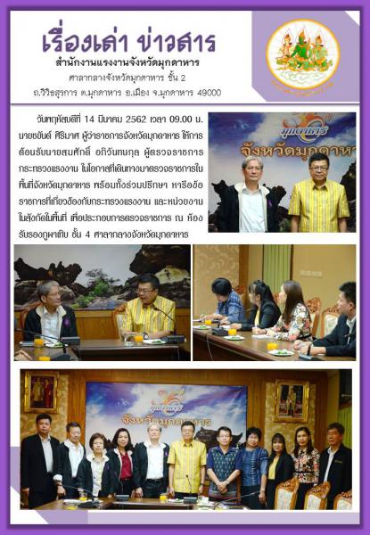 ผู้ว่าราชการจังหวัดมุกดาหาร ให้การต้อนรับนายสมศักดิ์ อภิวันทนกุล ผู้ตรวจราชการกระทรวงแรงงาน ในการเดินทางตรวจราชการในพื้นที่จังหวัดมุกดาหาร