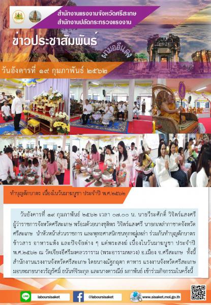 ผู้ว่าราชการจังหวัดศรีสะเกษ ร่วมทำบุญตักบาตร เนื่องในวันมาฆบูชา ประจำปี พ.ศ. 2562