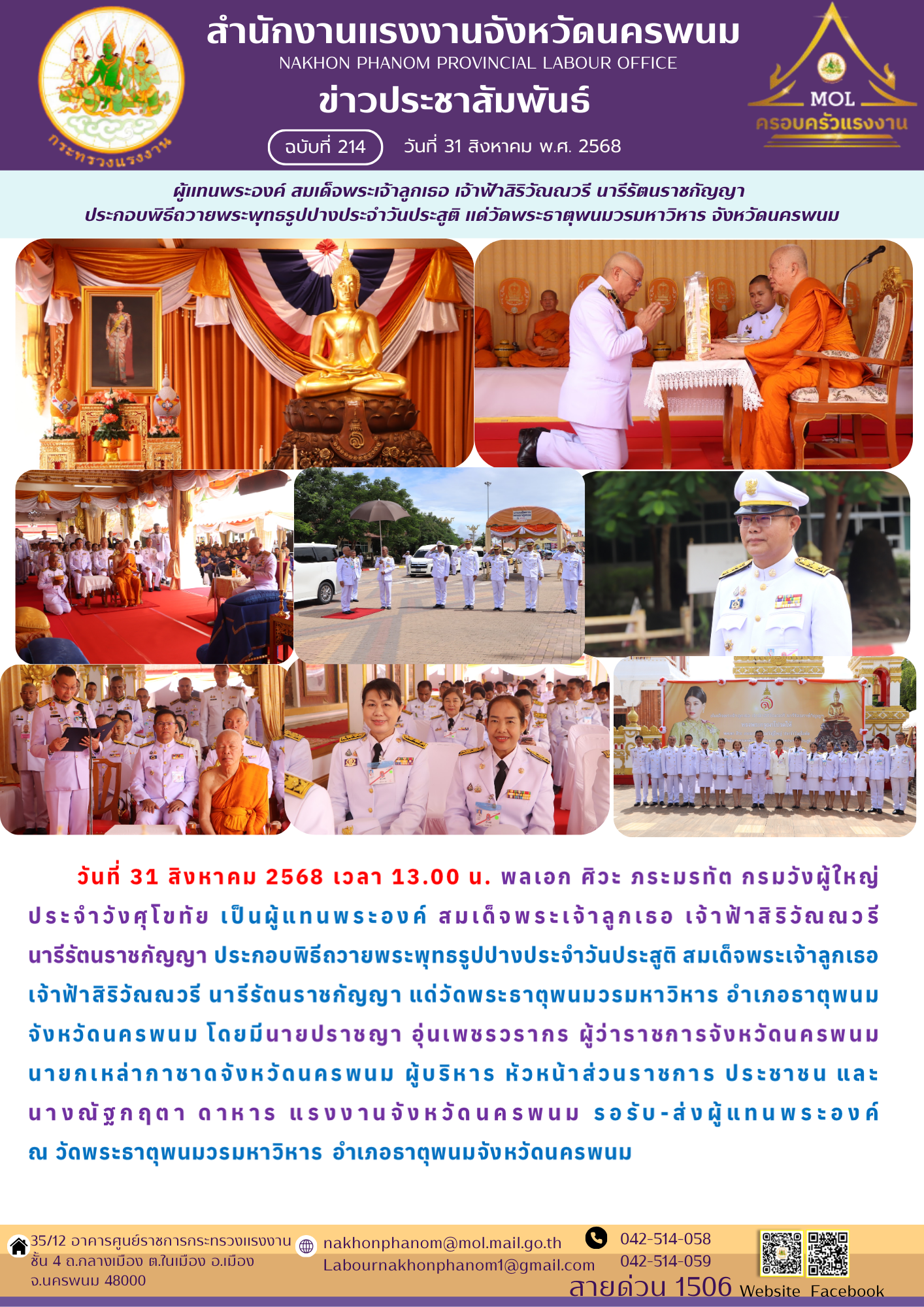 ผู้แทนพระองค์ สมเด็จพระเจ้าลูกเธอ เจ้าฟ้าสิริวัณณวรี นารีรัตนราชกัญญา ประกอบพิธีถวายพระพุทธรูปปางประจำวันประสูติ แด่วัดพระธาตุพนมวรมหาวิหาร จังหวัดนครพนม