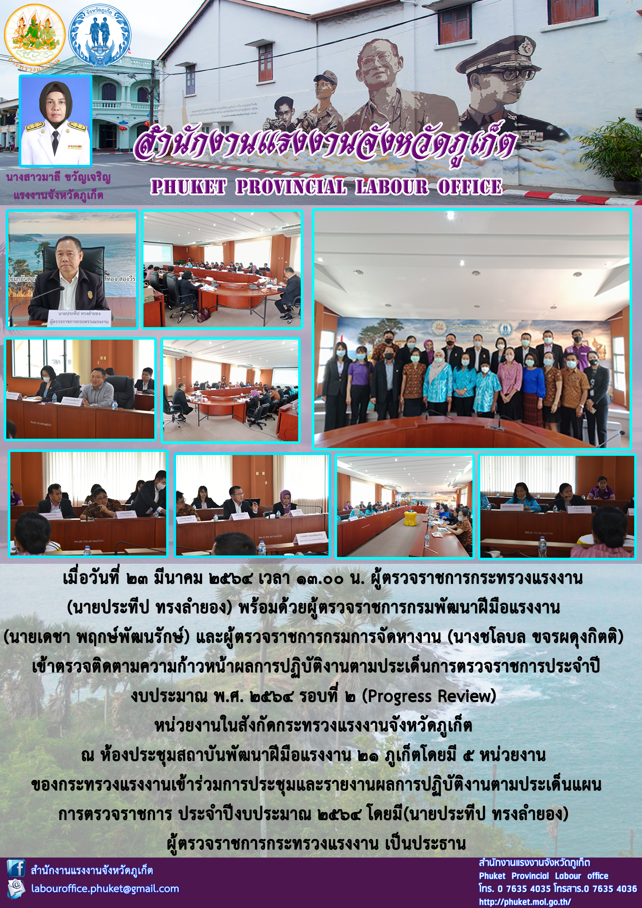 ผู้ตรวจราชการกระทรวงแรงงาน (นายประทีป ทรงลำยอง) พร้อมด้วยผู้ตรวจราชการกรมพัฒนาฝีมือแรงงาน (นายเดชา พฤกษ์พัฒนรักษ์) และผู้ตรวจราชการกรมการจัดหางาน (นางชโลบล ขจรผดุงกิตติ) เข้าตรวจติดตามความก้าวหน้าผลการปฏิบัติงานตามประเด็นการตรวจราชการประจำปี งบประมาณ พ.ศ. 2564 รอบที่ 2 (Progress Review) หน่วยงานในสังกัดกระทรวงแรงงานจังหวัดภูเก็ต