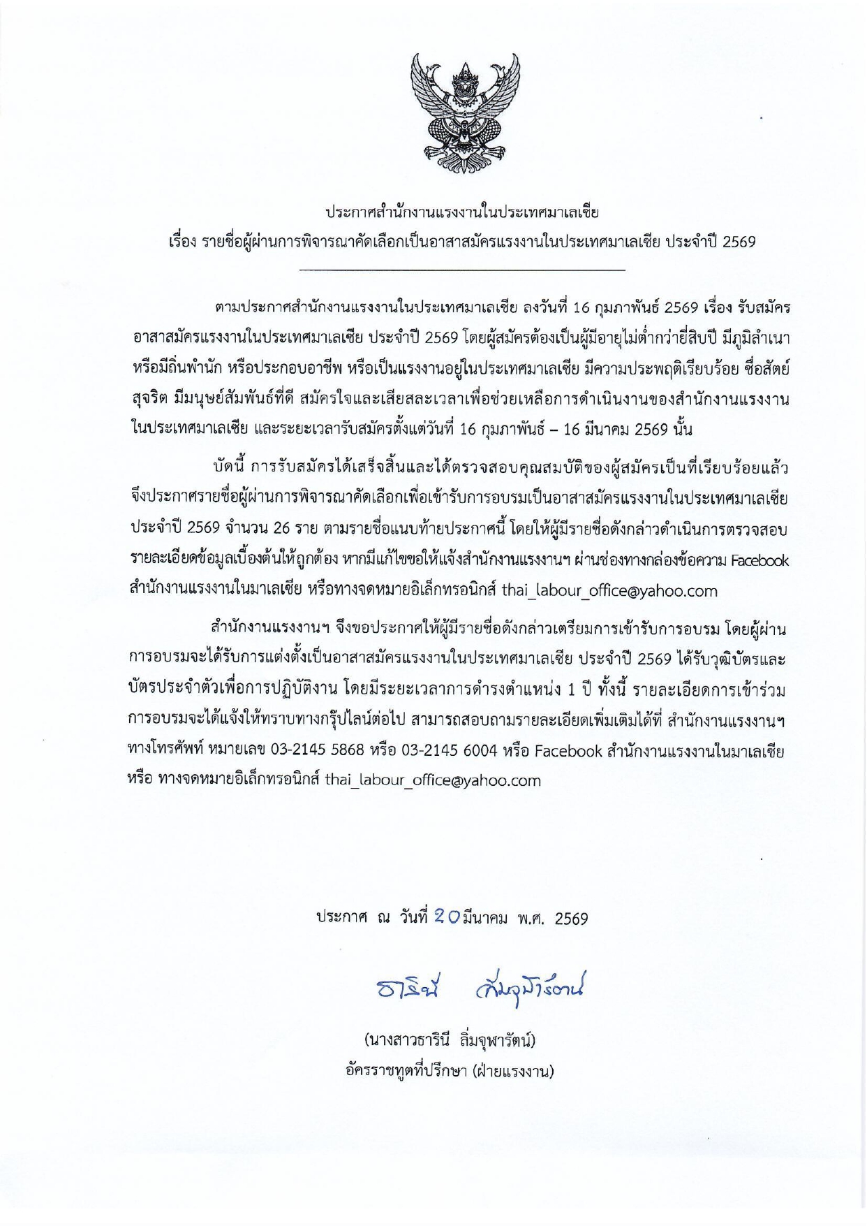 ประกาศ รายชื่อผู้ผ่านการพิจารณาคัดเลือกเป็นอาสาสมัครแรงงานในประเทศมาเลเซีย ประจำปี 2569