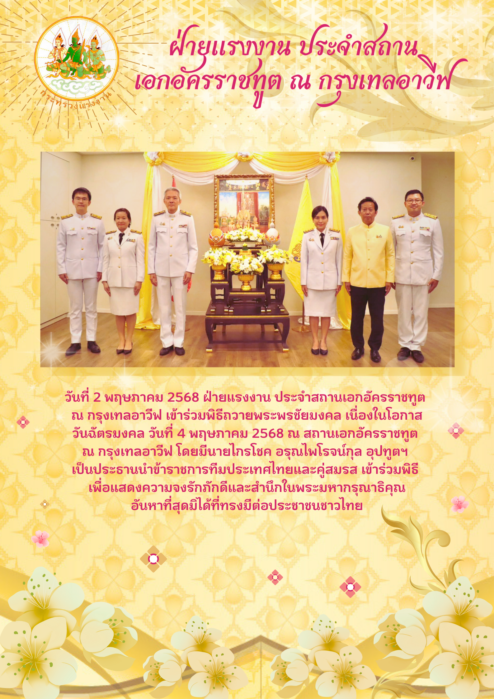 ฝ่ายแรงงาน ประจำสถานเอกอัครราชทูต ณ กรุงเทลอาวีฟ เข้าร่วมพิธีถวายพระพรชัยมงคล เนื่องในโอกาสวันฉัตรมงคล วันที่ 4 พฤษภาคม 2568 ณ สถานเอกอัครราชทูต ณ กรุงเทลอาวีฟ