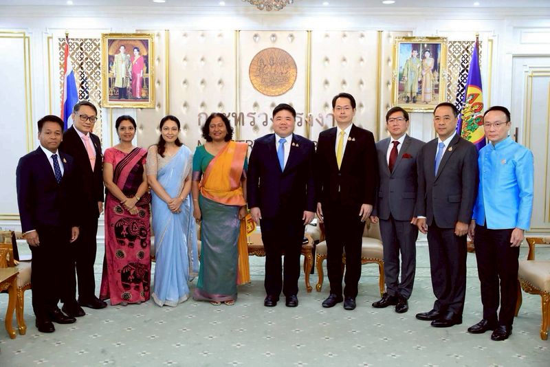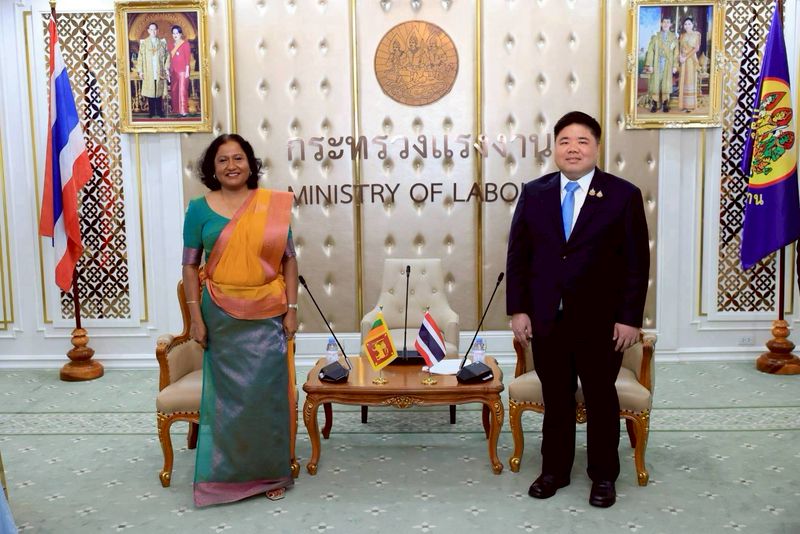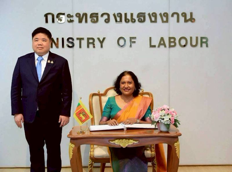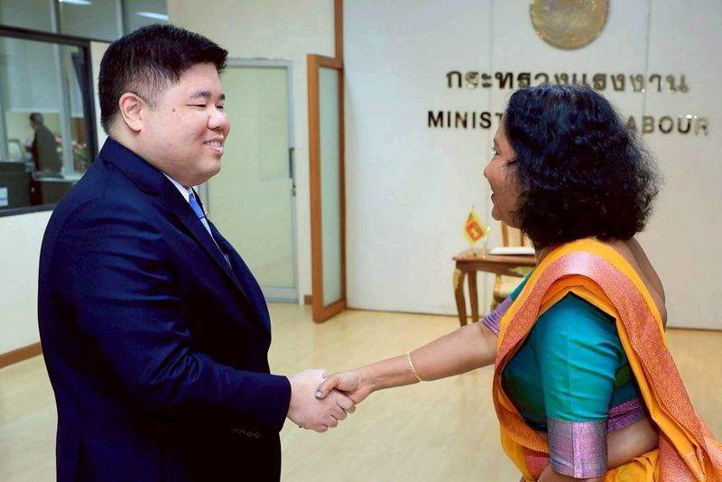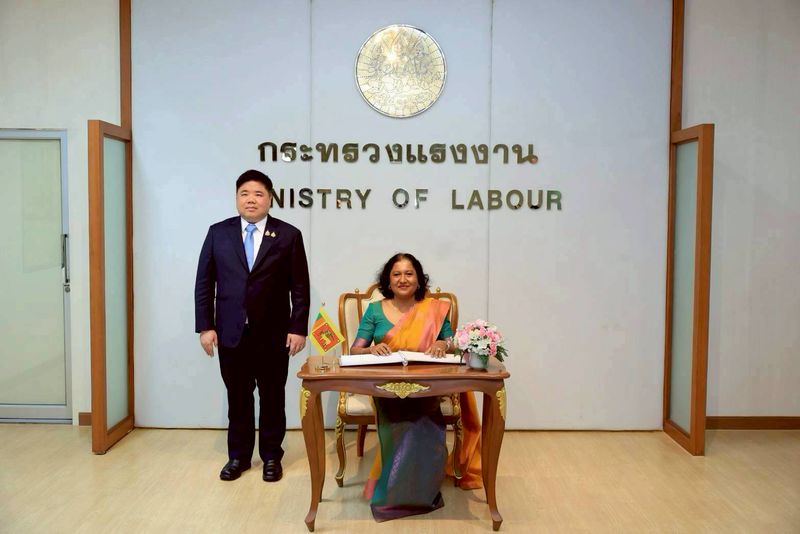 วันที่ 7 สิงหาคม 2568 เวลา 09.30 น. นายพงศ์กวิน จึงรุ่งเรืองกิจ รัฐมนตรีว่าการกระทรวงแรงงาน ให้การต้อนรับ นางเอทิริสิงเห อารัจจิลาเค ศรียานี วิชยันติ เอทิริสิงเห (H.E. Mrs. Edirisinghe Arachchilage Sriyani Wijayanthi Edirisinghe) เอกอัครราชทูตวิสามัญผู้มีอำนาจเต็ม แห่งสาธารณรัฐสังคมนิยมประชาธิปไตยศรีลังกาประจำประเทศไทย และคณะ ในโอกาสเข้าพบเพื่อกระชับความสัมพันธ์ เสริมสร้างความร่วมมือด้านแรงงาน โดยมี นายกิตติพล รวยฟูพันธ์ รองประธานคณะที่ปรึกษารัฐมนตรีว่าการกระทรวงแรงงาน นาวาตรี วิทวัส กู้ประเสริฐ คณะที่ปรึกษารัฐมนตรีว่าการกระทรวงแรงงาน นายสมาสภ์ ปัทมะสุคนธ์ รองปลัดกระทรวงแรงงาน นายสมชาย มรกตศรีวรรณ อธิบดีกรมการจัดหางาน เรือเอก สาโรจน์ คมคาย อธิบดีกรมสวัสดิการและคุ้มครองแรงงาน นายภัทรวุธ เภอแสละ รองอธิบดีกรมพัฒนาฝีมือแรงงาน และผู้บริหารกระทรวงแรงงาน ร่วมหารือ ณ ห้องจัตุมงคล ชั้น 6 อาคารกระทรวงแรงงาน