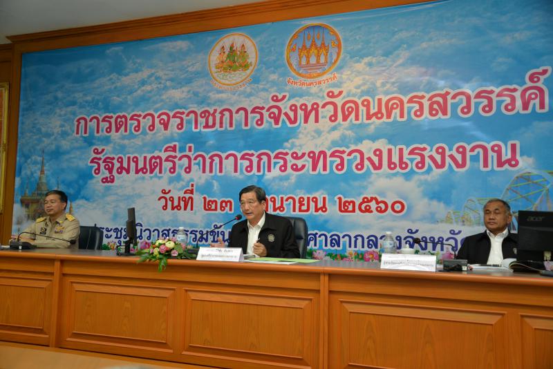 เมื่อวันที่ 23 มิถุนายน 2560 เวลา 09.30 น.พลเอก ศิริชัย ดิษฐกุล รัฐมนตรีว่าการกระทรวงแรงงาน เป็นประธานการประชุมติดตามผลการดำเนินงานด้านแรงงานตามนโยบายรัฐบาล พร้อมรับฟังประเด็นปัญหา อุปสรรค และข้อเสนอแนะจากภาคเอกชน และหน่วยงานที่เกี่ยวข้อง โดยมี หม่อมหลวงปุณฑริก สมิติ ปลัดกระทรวงแรงงาน และผู้บริหารกระทรวงแรงงาน ให้คำชี้แจงในเรื่องต่างฯณ ห้องประชุมศาลากลางจังหวัด ชั้น 5 ศาลากลางจังหวัดนครสวรรค์ อำเภอเมือง จังหวัดนครสวรรค์ การประชุมในวันนี้ เพื่อติดตามและผลักดันงานด้านแรงงานตามนโยบายรัฐบาลและกระทรวงแรงงานให้บรรลุผลเป็นรูปธรรม ในจังหวัดนครสวรรค์ มีหน่วยงานในสังกัดกระทรวงแรงงานหลายหน่วยงาน การดำเนินงานมีความสอดคล้องต่อศักยภาพที่โดดเด่นของจังหวัดและตอบสนองกับความต้องการของพื้นที่ ภารกิจด้านแรงงาน อาทิ การบริหารจัดการแรงงานนอกระบบการฝึกพัฒนาทักษะฝีมือและการยกระดับฝีมือแรงงานการดูแลคุ้มครองแรงงานให้ได้รับสิทธิประโยชน์ การดูแลด้านอาชีวะอนามัยและความปลอดภัยในการทำงานเพื่อให้แรงงานมีคุณภาพชีวิตที่ดี ข้าราชการกระทรวงแรงงานไม่สามารถทำงานได้ตามลำพังต้องได้รับความร่วมมือจากทุกภาคส่วนทั้งสภาอุตสาหกรรม สภาหอการค้า และส่วนราชการที่เกี่ยวข้องรวมทั้งผู้มีส่วนได้ส่วนเสียที่เกี่ยวข้องด้านแรงงาน