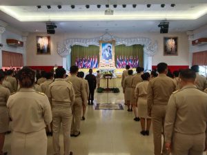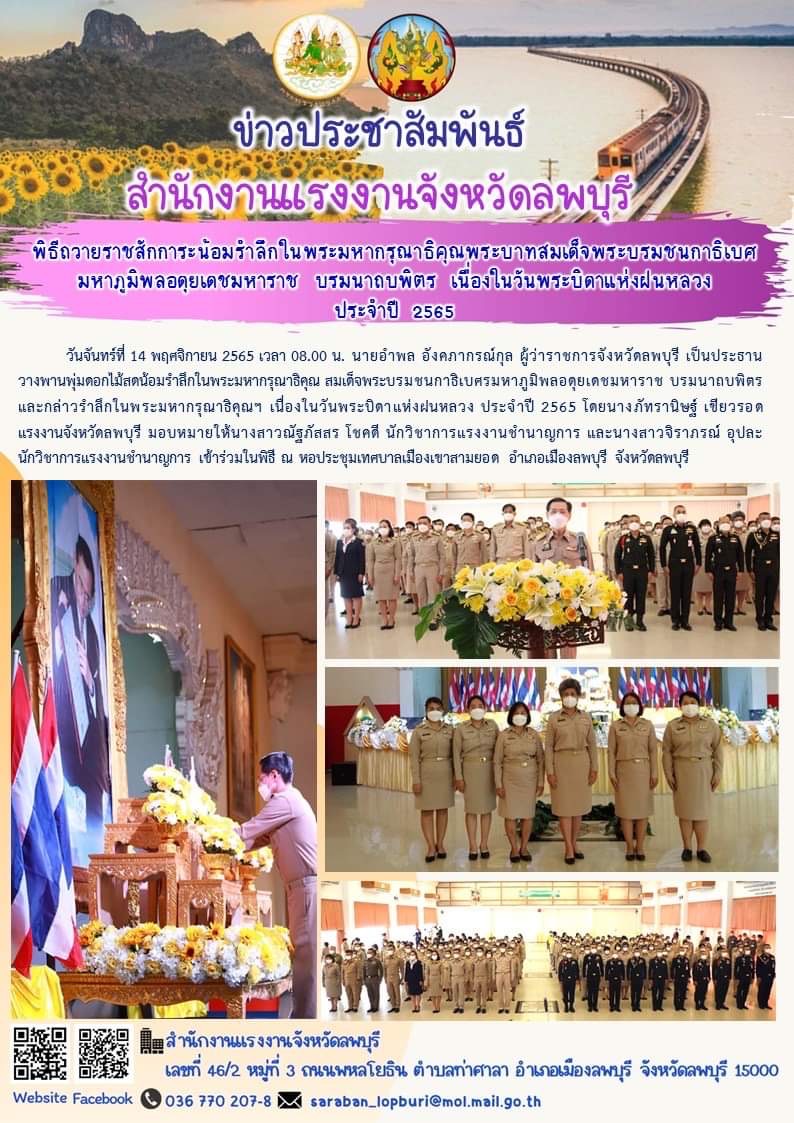 วันจันทร์ที่ 14 พฤศจิกายน 2565 เวลา 08.00 น. นายอำพล อังคภากรณ์กุล ผู้ว่าราชการจังหวัดลพบุรี เป็นประธาน วางพานพุ่มดอกไม้สดน้อมรำลึกในพระมหากรุณาธิคุณ สมเด็จพระบรมชนกาธิเบศรมหาภูมิพลอดุยเดชมหาราช บรมนาถบพิตรและกล่าวรำลึกในพระมหากรุณาธิคุณฯ เนื่องในวันพระบิดาแห่งฝนหลวง ประจำปี 2565 โดยนางภัทรานิษฐ์ เขียวรอด แรงงานจังหวัดลพบุรี มอบหมายให้นางสาวณัฐภัสสร โชคดี นักวิชาการแรงงานชำนาญการ และนางสาวจิราภรณ์ อุปละ นักวิชาการแรงงานชำนาญการ เข้าร่วมในพิธี ณ หอประชุมเทศบาลเมืองเขาสามยอด อำเภอเมืองลพบุรี จังหวัดลพบุรี