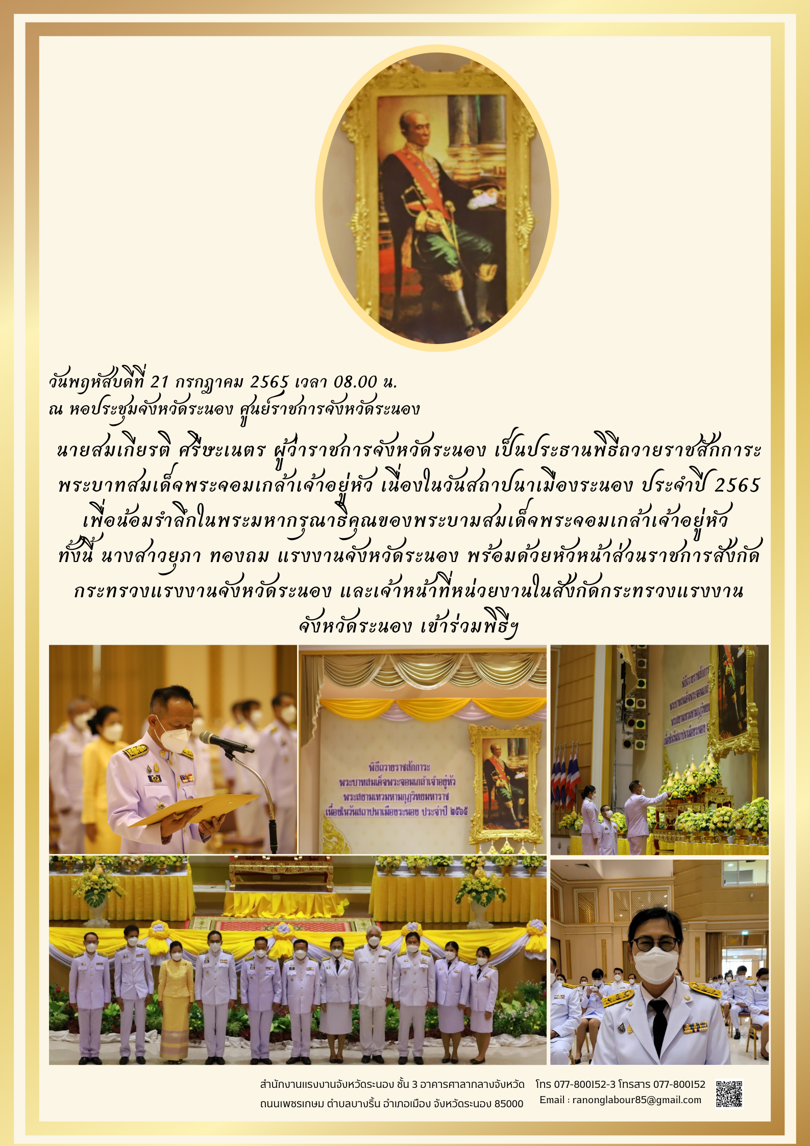 พิธีถวายราชสักการะพระบาทสมเด็จพระจอมเกล้าเจ้าอยู่หัว เนื่องในวันสถาปนาเมืองระนอง ประจำปี 2565