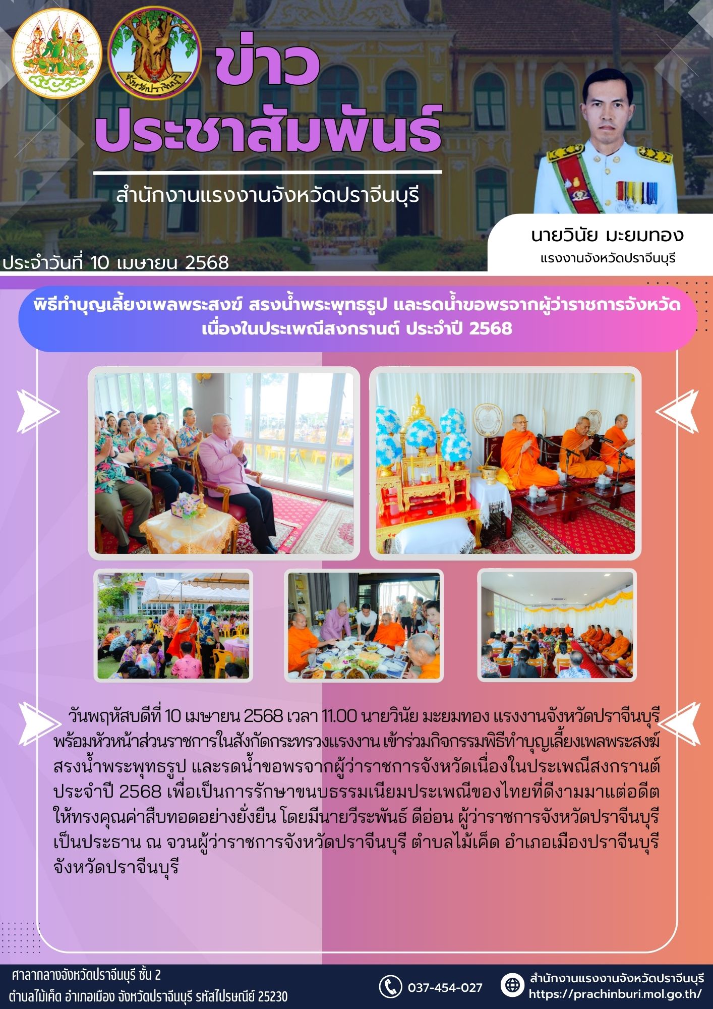 วันพฤหัสบดีที่ 10 เมษายน 2568 เวลา 11.00 นายวินัย มะยมทอง แรงงานจังหวัดปราจีนบุรี พร้อมหัวหน้าส่วนราชการในสังกัดกระทรวงแรงงาน เข้าร่วมกิจกรรมพิธีทำบุญเลี้ยงเพลพระสงฆ์ สรงน้ำพระพุทธรูป และรดน้ำขอพรจากผู้ว่าราชการจังหวัดเนื่องในประเพณีสงกรานต์ ประจำปี 2568 เพื่อเป็นการรักษาขนบธรรมเนียมประเพณีของไทยที่ดีงามมาแต่อดีต ให้ทรงคุณค่าสืบทอดอย่างยั่งยืน โดยมีนายวีระพันธ์ ดีอ่อน ผู้ว่าราชการจังหวัดปราจีนบุรี เป็นประธาน ณ จวนผู้ว่าราชการจังหวัดปราจีนบุรี ตำบลไม้เค็ด อำเภอเมืองปราจีนบุรี จังหวัดปราจีนบุรี
