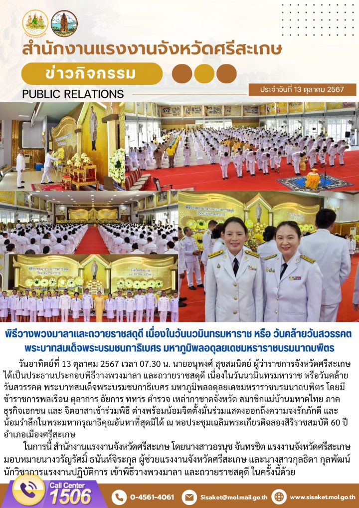วันอาทิตย์ที่ 13 ตุลาคม 2567 เวลา 07.30 น. นายอนุพงศ์ สุขสมนิตย์ ผู้ว่าราชการจังหวัดศรีสะเกษ ได้เป็นประธานประกอบพิธีวางพวงมาลา และถวายราชสดุดี เนื่องในวันนวมินทรมหาราช หรือวันคล้ายวันสวรรคต พระบาทสมเด็จพระบรมชนกาธิเบศร มหาภูมิพลอดุลยเดชมหราราชบรมนาถบพิตร โดยมีข้าราชการพลเรือน ตุลาการ อัยการ ทหาร ตำรวจ เหล่ากาชาดจังหวัด สมาชิกแม่บ้านมหาดไทย ภาคธุรกิจเอกชน และ จิตอาสาเข้าร่วมพิธี ต่างพร้อมน้อมจิตตั้งมั่นร่วมแสดงออกถึงความจงรักภักดี และ น้อมรำลึกในพระมหากรุณาธิคุณอันหาที่สุดมิได้ ณ หอประชุมเฉลิมพระเกียรติฉลองสิริราชสมบัติ 60 ปีอำเภอเมืองศรีสะเกษ