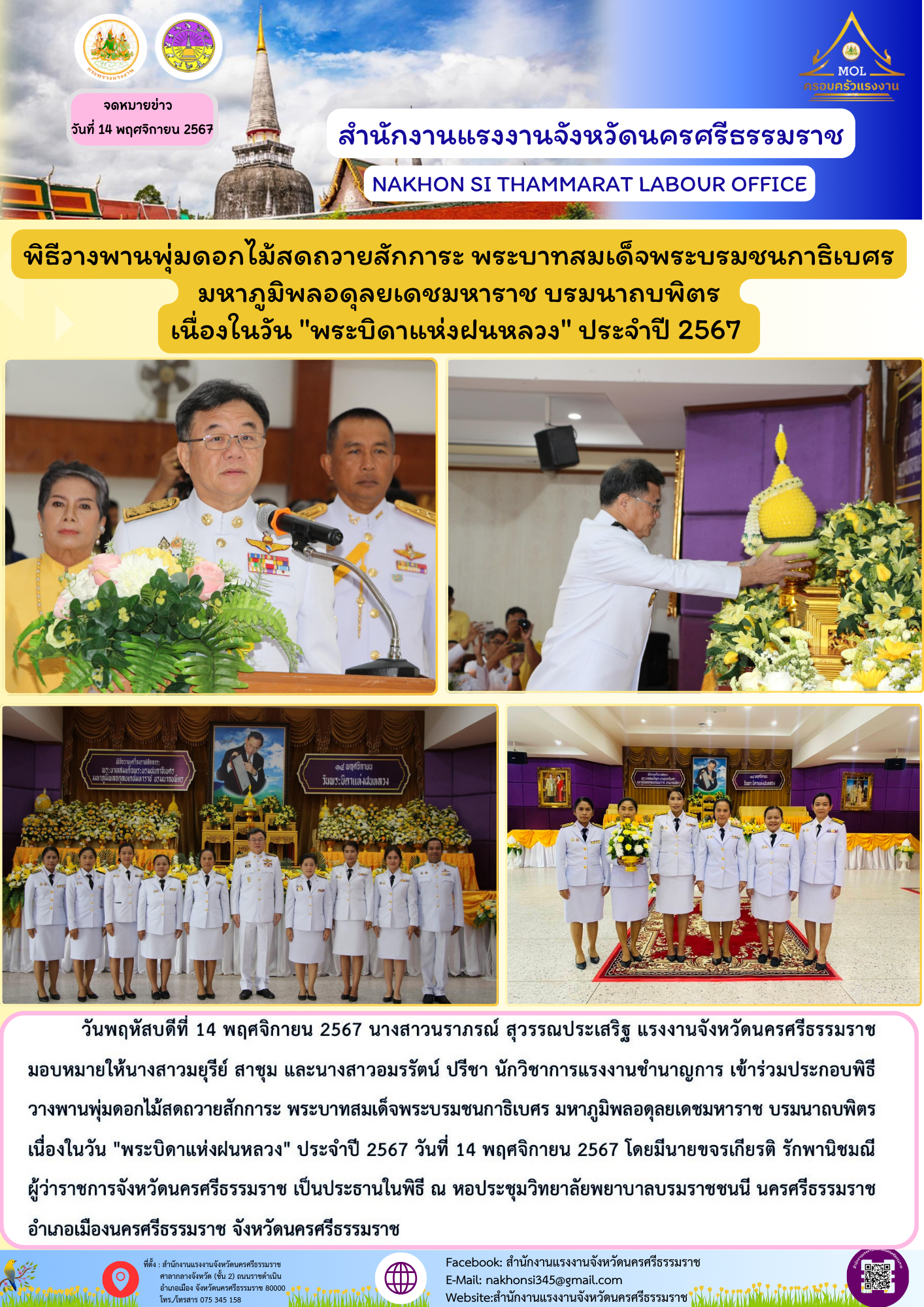 สรจ.นครศรีธรรมราช พิธีวางพานพุ่มดอกไม้สดถวายสักการะ พระบาทสมเด็จพระบรมชนกาธิเบศร มหาภูมิพลอดุลยเดชมหาราช บรมนาถบพิตร เนื่องในวัน “พระบิดาแห่งฝนหลวง” ประจำปี 2567