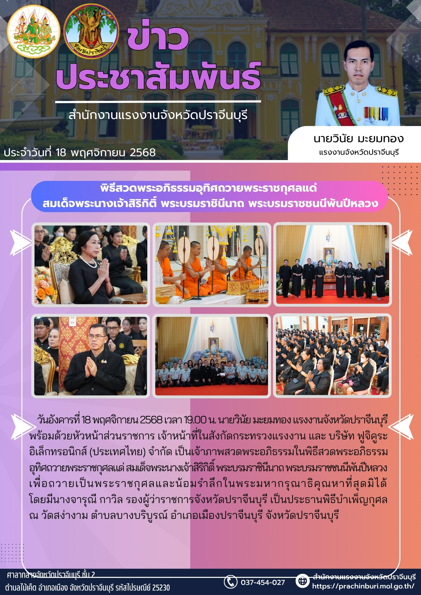 วันอังคารที่ 18 พฤศจิกายน 2568 เวลา 19.00 น. นายวินัย มะยมทอง แรงงานจังหวัดปราจีนบุรี พร้อมด้วยหัวหน้าส่วนราชการ เจ้าหน้าที่ในสังกัดกระทรวงแรงงาน และ บริษัท ฟูจิคูระ อิเล็กทรอนิกส์ (ประเทศไทย) จำกัด เป็นเจ้าภาพสวดพระอภิธรรมในพิธีสวดพระอภิธรรมอุทิศถวายพระราชกุศลแด่ สมเด็จพระนางเจ้าสิริกิติ์ พระบรมราชินีนาถ พระบรมราชชนนีพันปีหลวง เพื่อถวายเป็นพระราชกุศลและน้อมรำลึกในพระมหากรุณาธิคุณหาที่สุดมิได้ โดยมีนางจารุณี กาวิล รองผู้ว่าราชการจังหวัดปราจีนบุรี เป็นประธานพิธีบำเพ็ญกุศล ณ วัดสง่างาม ตำบลบางบริบูรณ์ อำเภอเมืองปราจีนบุรี จังหวัดปราจีนบุรี