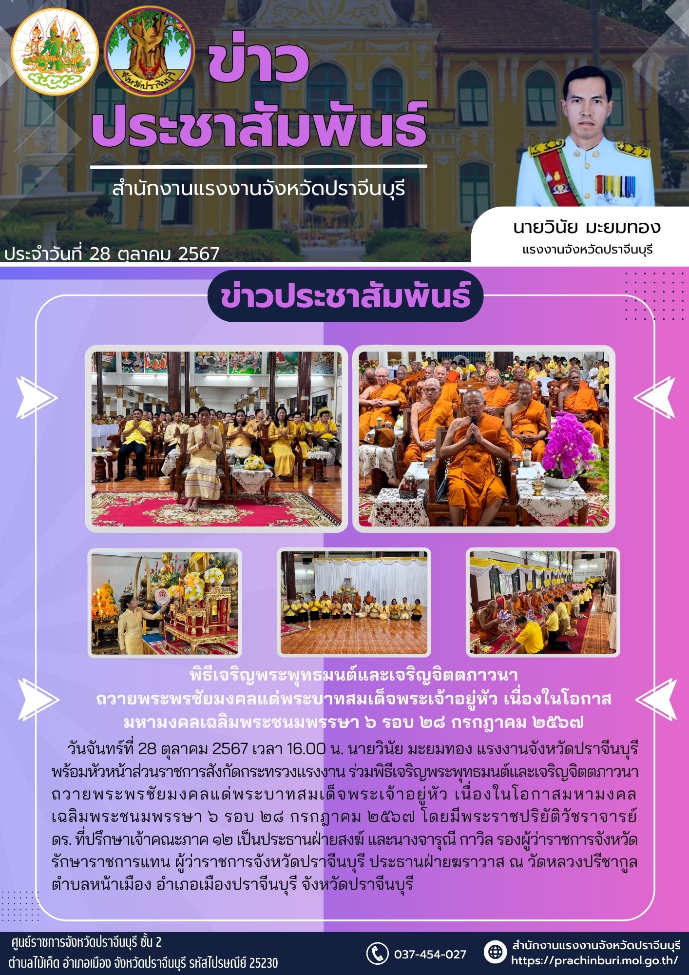 วันจันทร์ที่ 28 ตุลาคม 2567 เวลา 16.00 น. นายวินัย มะยมทอง แรงงานจังหวัดปราจีนบุรี พร้อมหัวหน้าส่วนราชการสังกัดกระทรวงแรงงาน ร่วมพิธีเจริญพระพุทธมนต์และเจริญจิตตภาวนา