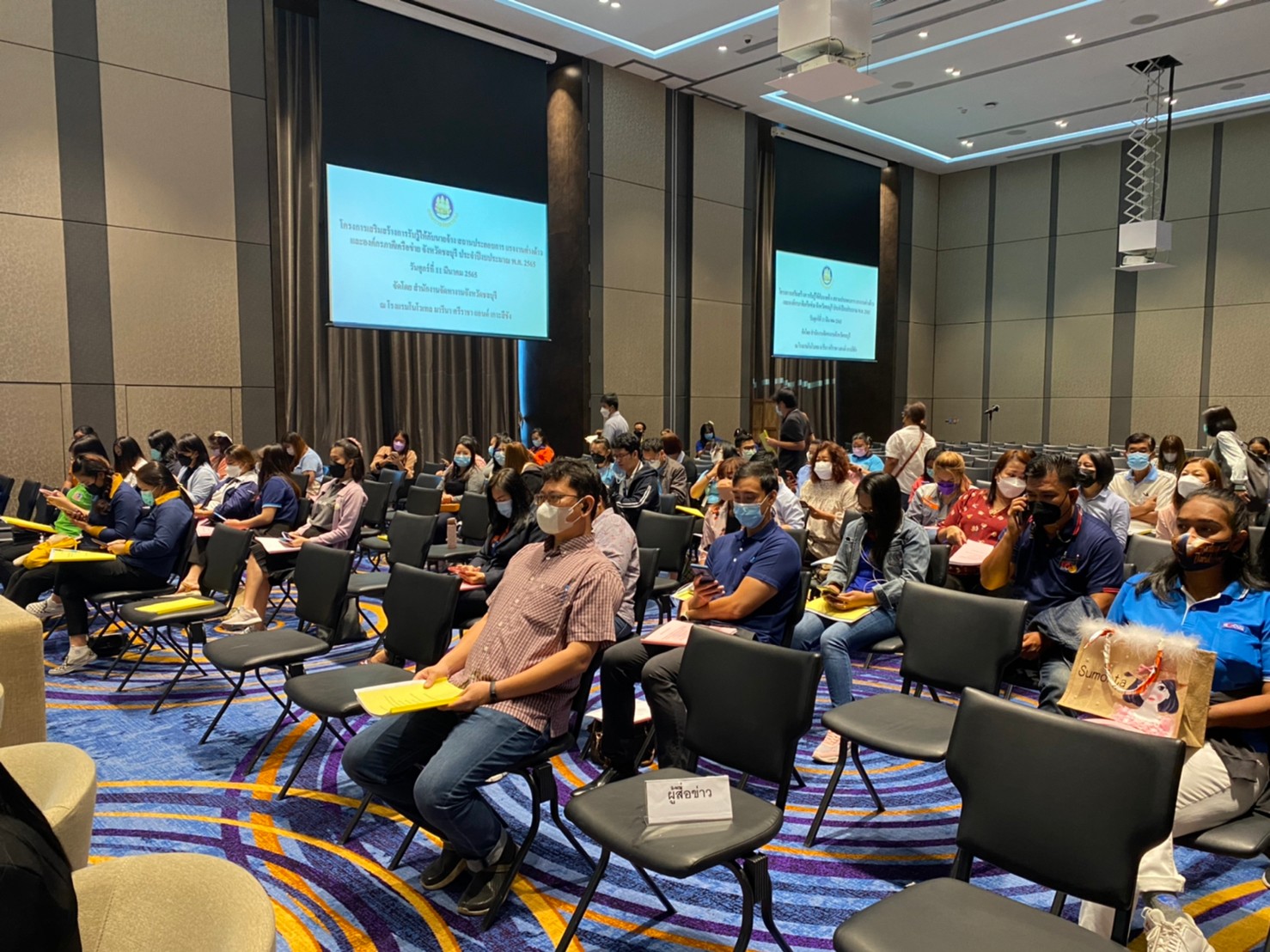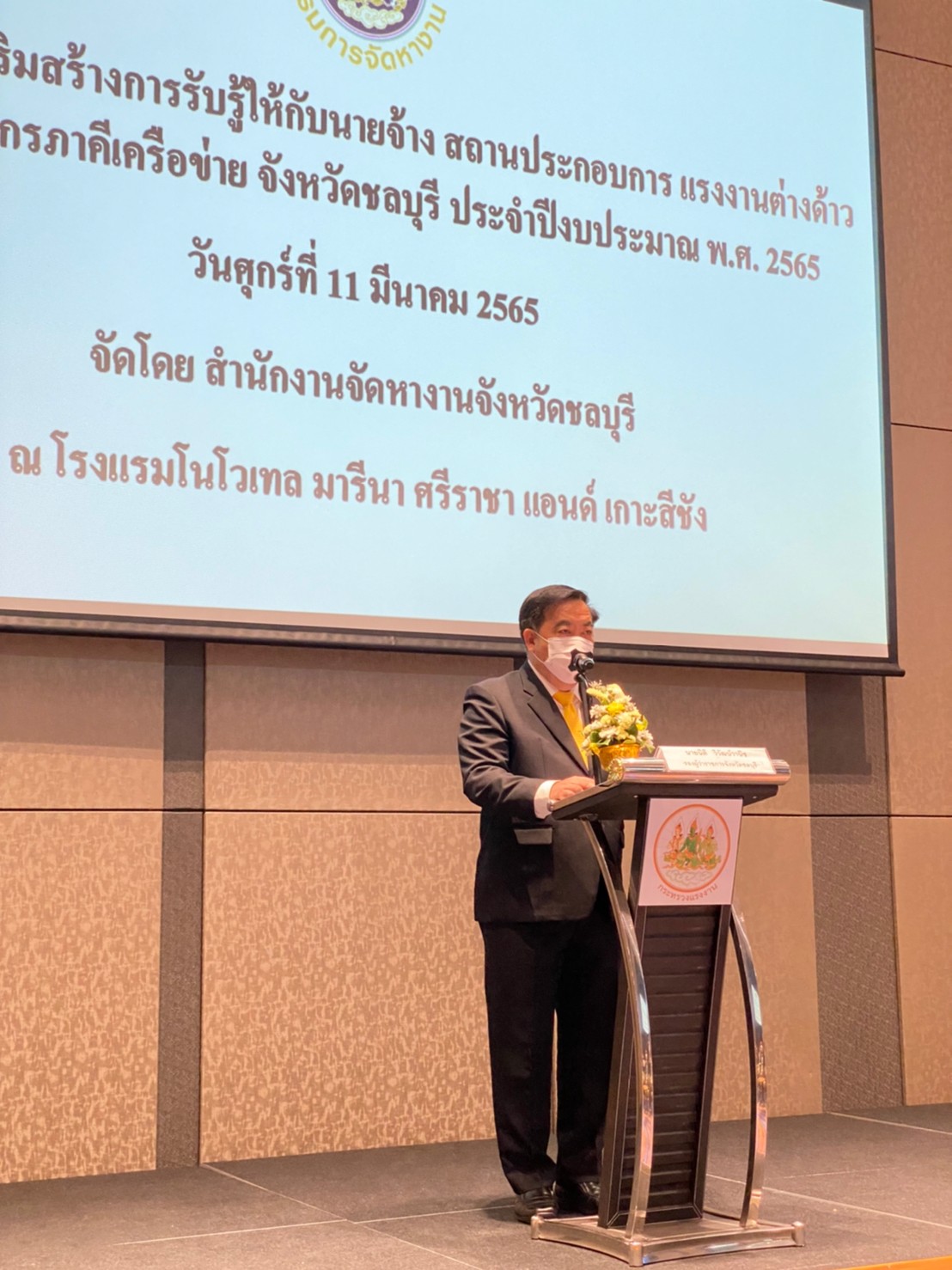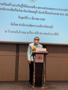 วันศุกร์ที่ 11 มีนาคม 2565 เวลา 09.30น. นางสาวกรจิรัฏฐ์ พงจันทร์ศธร แรงงานจังหวัดชลบุรี มอบหมายให้ นางสาวสุทธญาณ์ อาจโนนเปลือย นักวิชาการแรงงานชำนาญการ ร่วมเป็นเกียรติในพิธีเปิดการอบรมตามโครงการเสริมสร้างการรับรู้ให้กับนายจ้าง สถานประกอบการ แรงงานต่างด้าว และองค์กรภาคีเครือข่าย จังหวัดชลบุรี ประจำปีงบประมาณ พ.ศ.2565 โดยมี นายสุรชัย ชัยตระกูลทอง ผู้ช่วยรัฐมนตรีประจำกระทรวงแรงงาน เป็นประธานในพิธีเปิดการอบรมฯ นายนิติ วิวัฒน์วานิช รองผู้ว่าราชการจังหวัดชลบุรี กล่าวต้อนรับ พร้อมด้วย นายสิบหมื่นชัย โพธิสินธุ์ ผู้ตรวจราชการกรม กรมจัดหางาน เป็นผู้กล่าวรายงาน ณ โรงแรมโนโวเทล มารีน่า ศรีราชา แอนด์ เกาะสีชัง จังหวัดชลบุรี