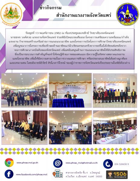 วันพุธที่ 13 พฤศจิกายน 2562 ณ ห้องประชุมมเหสักข์ วิทยาลัยเทคนิคแพร่ นายขจร วงศ์สวย แรงงานจังหวัดแพร่ ร่วมพิธีเปิดอบรมสัมมนาโครงการเตรียมความพร้อมแก่กำลังแรงงาน กิจกรรมสร้างเครือข่ายการแนะแนวอาชีพ และโครงการเปิดโลกการศึกษาวิทยาลัยเทคนิคแพร่ เพื่อบูรณาการโครงการเพิ่มทักษะด้านอาชีพแก่นักเรียนครอบครัวยากจนที่ไม่ได้เรียนต่อหลังจากจบการศึกษาภาคบังคับของจังหวัดแพร่ เพื่อสนับสนุนด้านการแนะแนวอาชีพให้มีประสิทธิภาพ ซึ่งเป็นกระบวนการสำคัญที่จะทำให้คนรู้ศักยภาพของตนเอง มีความรู้ในทิศทางตลาดแรงงาน และโลกอาชีพ เพื่อให้มีความสามารถในการวางแผนการศึกษา หรือประกอบอาชีพได้อย่างถูกต้องและเหมาะสม โดยมีนายนิธิวัชร์ ศิรโภคาวิโรจน์ รองผู้ว่าราชการจังหวัดแพร่เป็นประธานในพิธีดังกล่าว