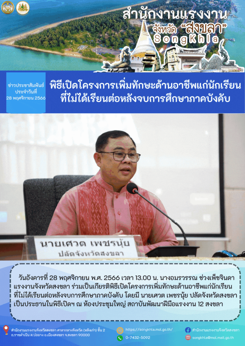 วันอังคารที่ 28 พฤศจิกายน พ.ศ. 2566 เวลา 13.00 น. นางอมรวรรณ ช่วงเพ็ชจินดา แรงงานจังหวัดสงขลา ร่วมเป็นเกียรติพิธีเปิดโครงการเพิ่มทักษะด้านอาชีพแก่นักเรียนที่ไม่ได้เรียนต่อหลังจบการศึกษาภาคบังคับ โดยมี นายเศวต เพชรนุ้ย ปลัดจังหวัดสงขลา เป็นประธานในพิธีเปิดฯ ณ ห้องประชุมใหญ่ สถาบันพัฒนาฝีมือแรงงาน 12 สงขลา