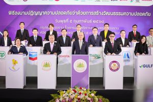 เรือเอก สาโรจน์ คมคาย อธิบดีกรมสวัสดิการและคุ้มครองแรงงาน (กสร.) กล่าวเพิ่มเติมว่า การลงนามปฏิญญาความปลอดภัยฯ ในวันนี้เป็นส่วนหนึ่งของการดำเนินงานตามนโยบายของท่านพิพัฒน์ รัชกิจประการ รัฐมนตรีว่าการกระทรวงแรงงาน โดยมุ่งเน้นสร้างวัฒนธรรมความปลอดภัย ซึ่งกรมสวัสดิการและคุ้มครองแรงงานได้ขับเคลื่อนนโยบาย โดยมอบหมายหน่วยปฏิบัติในพื้นที่ดำเนินกิจกรรม Safety Campaign ประกอบด้วย แคมเปญ Safety Inspection Together เป็นการรณรงค์บูรณาการตรวจเข้มการบังคับใช้กฎหมายร่วมกันกับหน่วยงานที่เกี่ยวข้องในทุกพื้นที่ทั่วประเทศ แคมเปญ Knowing Safety Culture Together เป็นการรณรงค์สร้างการรับรู้ เพื่อการปรับเปลี่ยนพฤติกรรมการทำงานของคนทำงานให้เกิดเป็นวัฒนธรรมความปลอดภัยในทุกองค์กร และแคมเปญ Safety Culture Together in The Workplace เป็นการรณรงค์ให้สถานประกอบกิจการร่วมสร้างวัฒนธรรมความปลอดภัย ดังนั้น ปฏิญญานี้ถือเป็นการประกาศเจตนารมณ์แสดงความมุ่งมั่นร่วมมือกันอย่างจริงจัง ระหว่าง กระทรวงแรงงาน ร่วมกับหน่วยงานรัฐวิสาหกิจและภาคเอกชน 18 หน่วยงาน ที่พร้อมสนับสนุนและร่วมดำเนินกิจกรรม “สร้างวัฒนธรรมความปลอดภัย” ไปด้วยกัน โดยภาครัฐได้ดำเนินการขับเคลื่อนนโยบายผ่านกลไกการบังคับใช้กฎหมาย การสร้างการรับรู้ และพัฒนาเครือข่าย ในส่วนของสถานประกอบกิจการจะได้มีการขยายผลไปยังสาขาเครือข่ายธุรกิจตลอดจนห่วงโซ่อุปทาน โดยเริ่มจากการปรับเปลี่ยนพฤติกรรมการทำงานเสี่ยงของลูกจ้างเป็นพฤติกรรมการทำงานปลอดภัย และหากดำเนินการต่อเนื่องจะกลายเป็นวัฒนธรรมความปลอดภัยในการทำงานขององค์กร จะเป็นแนวทางป้องกันการประสบอันตรายจากการทำงานที่ยั่งยืนในอนาคต และหลังจากนี้จะมีการประชุมหารือร่วมกันเป็นระยะเพื่อแลกเปลี่ยนข้อคิดเห็น และแนวทางการดำเนินงานที่ประสบความสำเร็จในการขับเคลื่อนการสร้างวัฒนธรรมความปลอดภัยเพื่อเป็นแบบอย่างแก่หน่วยงานอื่นต่อไป