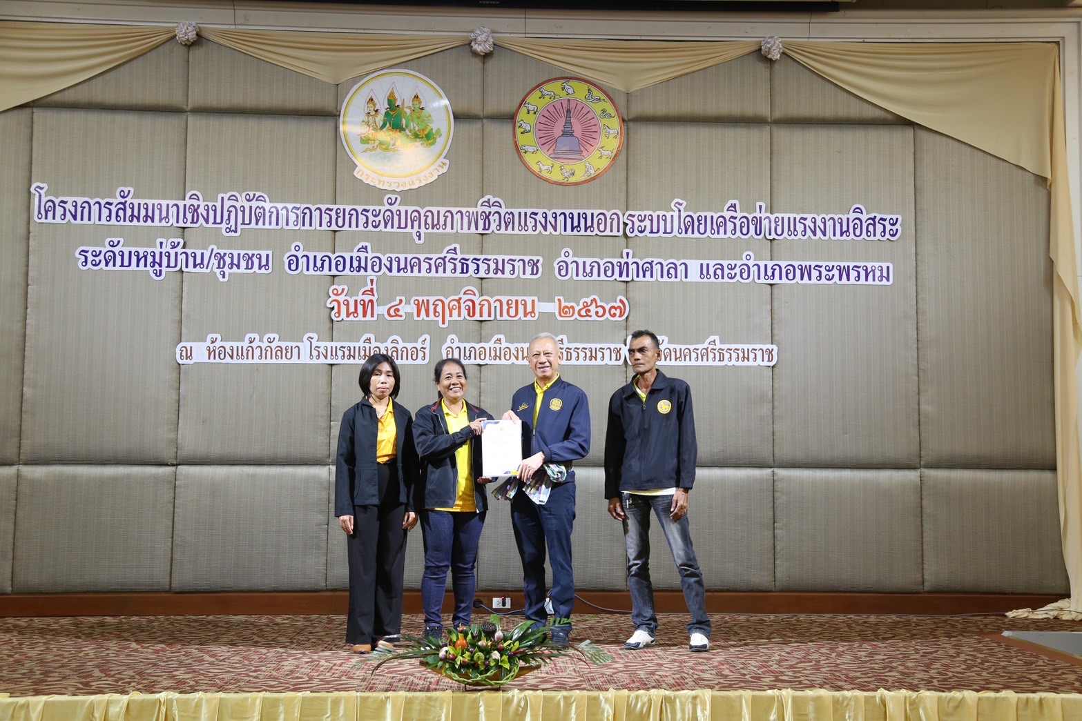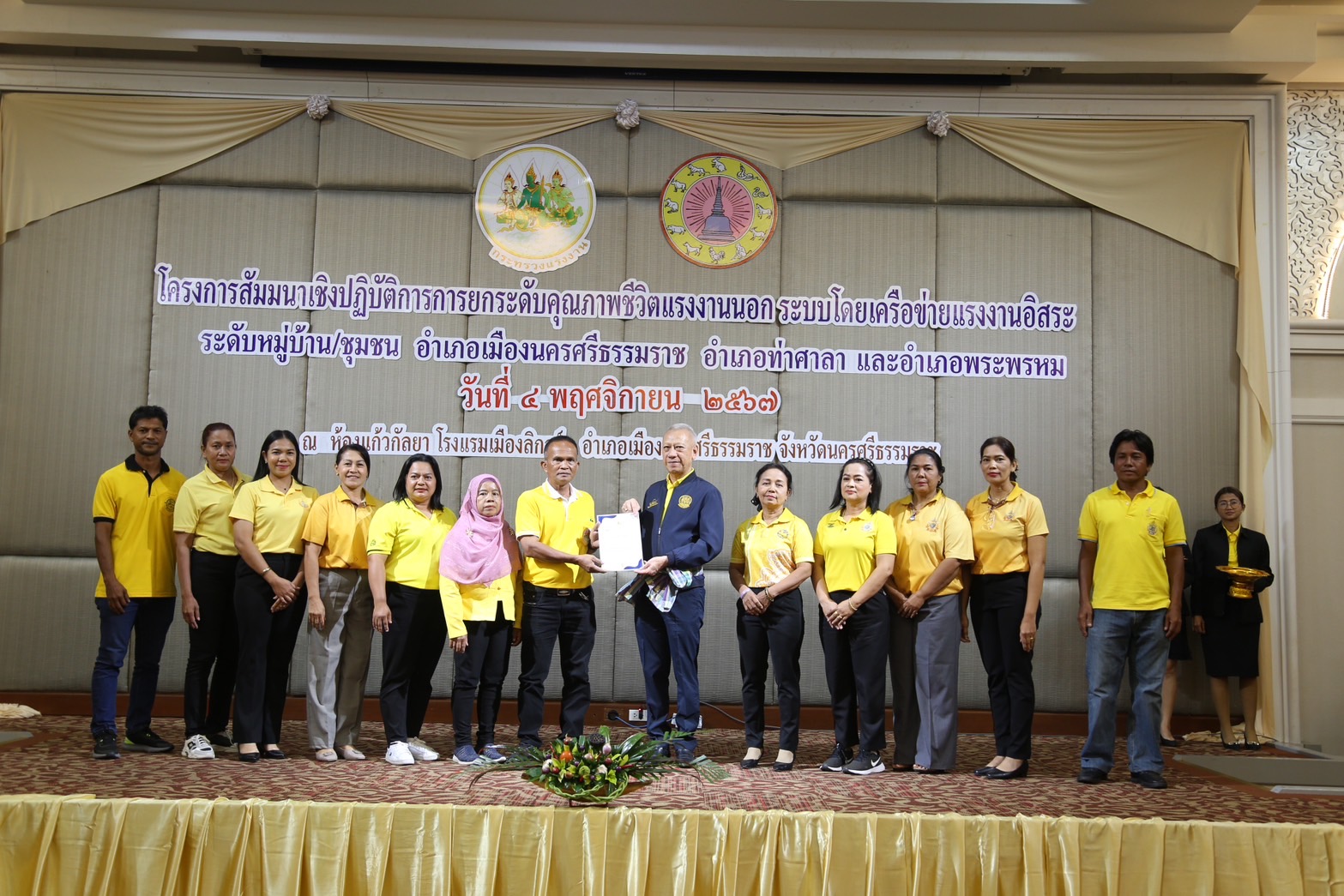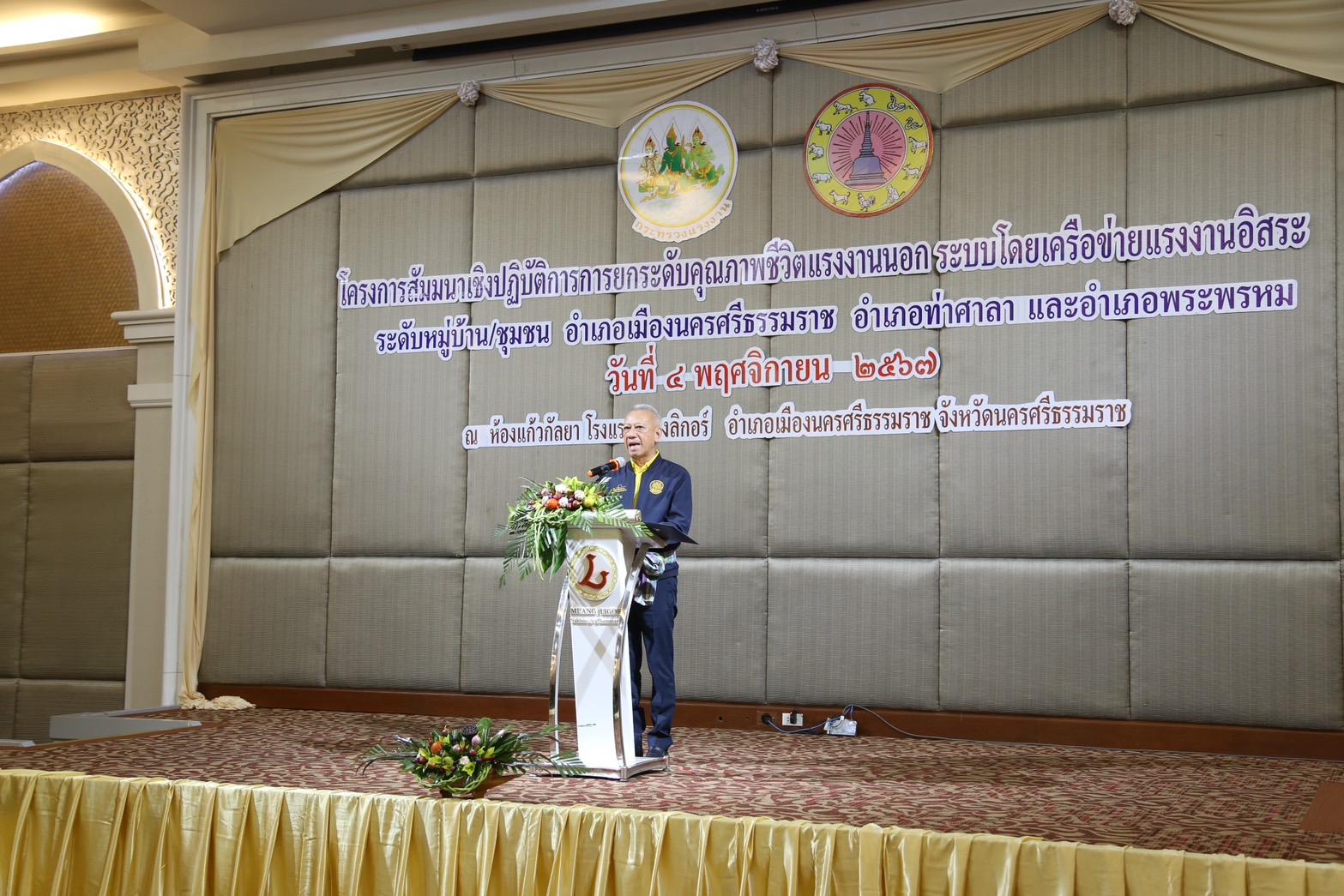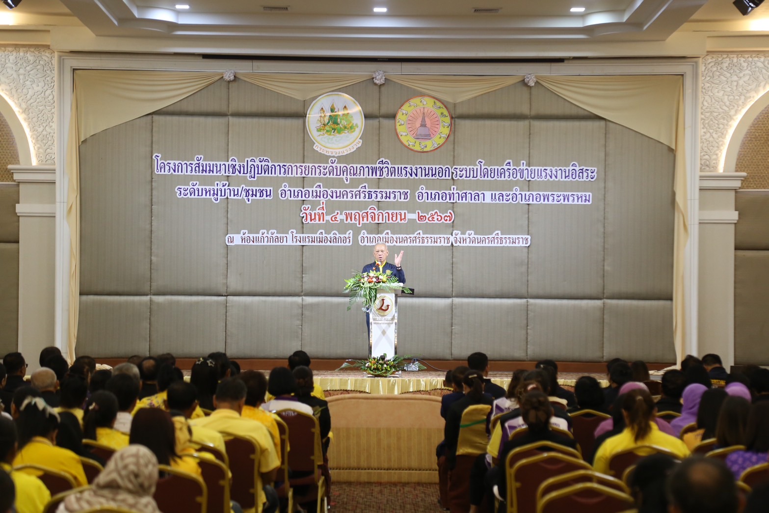 วันที่ 4 พฤศจิกายน 2567 เวลา 13.30 น.นายพิพัฒน์ รัชกิจประการ รัฐมนตรีว่าการกระทรวงแรงงาน เป็นประธานเปิดโครงการสัมมนาเชิงปฏิบัติการการยกระดับคุณภาพชีวิตแรงงานนอกระบบโดยเครือข่ายแรงงานอิสระระดับหมู่บ้าน ชุมชน อำเภอเมืองนครศรีธรรมราช อำเภอท่าศาลา และอำเภอพระพรหม โดยมี นางสาวบุปผา เรืองสุด อธิบดีกรมพัฒนาฝีมือแรงงาน รักษาราชการแทน รองปลัดกระทรวงแรงงาน กล่าวรายงาน พร้อมด้วยผู้บริหารกระทรวงแรงงาน ร่วมเป็นเกียรติ นายศรีธรรม ราชแก้ว รองผู้ว่าราชการจังหวัดนครศรีธรรมราช หัวหน้าส่วนราชการสังกัดกระทรวงแรงงานจังหวัดนครศรีธรรมราช นายอำเภอ ผู้นำชุมชน เครือข่ายแรงงานอิสระ ร่วมให้การต้อนรับ ณ ห้องประชุมแก้วกัลยา ชั้น 2 โรงแรมเมืองลิกอร์ อำเภอเมืองนครศรีธรรมราช จังหวัดนครศรีธรรมราช