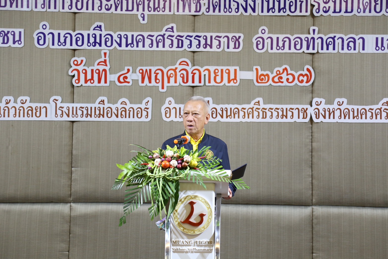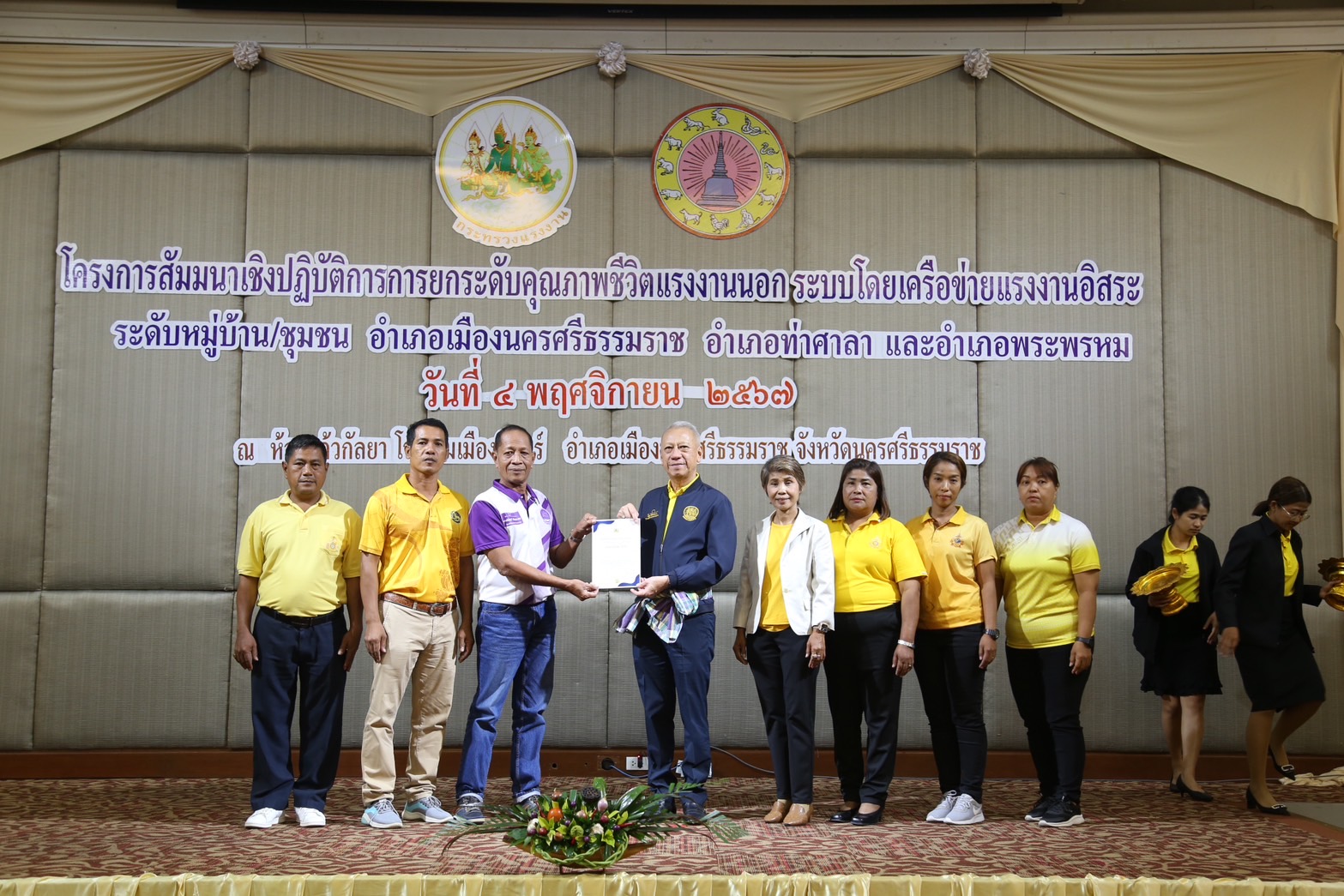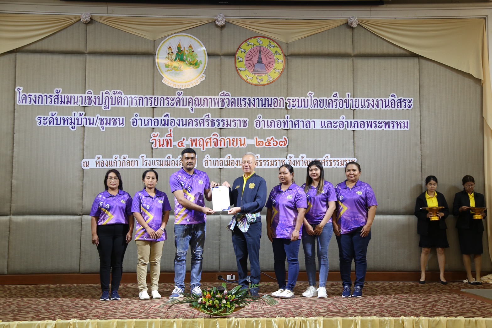 วันที่ 4 พฤศจิกายน 2567 เวลา 13.30 น.นายพิพัฒน์ รัชกิจประการ รัฐมนตรีว่าการกระทรวงแรงงาน เป็นประธานเปิดโครงการสัมมนาเชิงปฏิบัติการการยกระดับคุณภาพชีวิตแรงงานนอกระบบโดยเครือข่ายแรงงานอิสระระดับหมู่บ้าน ชุมชน อำเภอเมืองนครศรีธรรมราช อำเภอท่าศาลา และอำเภอพระพรหม โดยมี นางสาวบุปผา เรืองสุด อธิบดีกรมพัฒนาฝีมือแรงงาน รักษาราชการแทน รองปลัดกระทรวงแรงงาน กล่าวรายงาน พร้อมด้วยผู้บริหารกระทรวงแรงงาน ร่วมเป็นเกียรติ นายศรีธรรม ราชแก้ว รองผู้ว่าราชการจังหวัดนครศรีธรรมราช หัวหน้าส่วนราชการสังกัดกระทรวงแรงงานจังหวัดนครศรีธรรมราช นายอำเภอ ผู้นำชุมชน เครือข่ายแรงงานอิสระ ร่วมให้การต้อนรับ ณ ห้องประชุมแก้วกัลยา ชั้น 2 โรงแรมเมืองลิกอร์ อำเภอเมืองนครศรีธรรมราช จังหวัดนครศรีธรรมราช