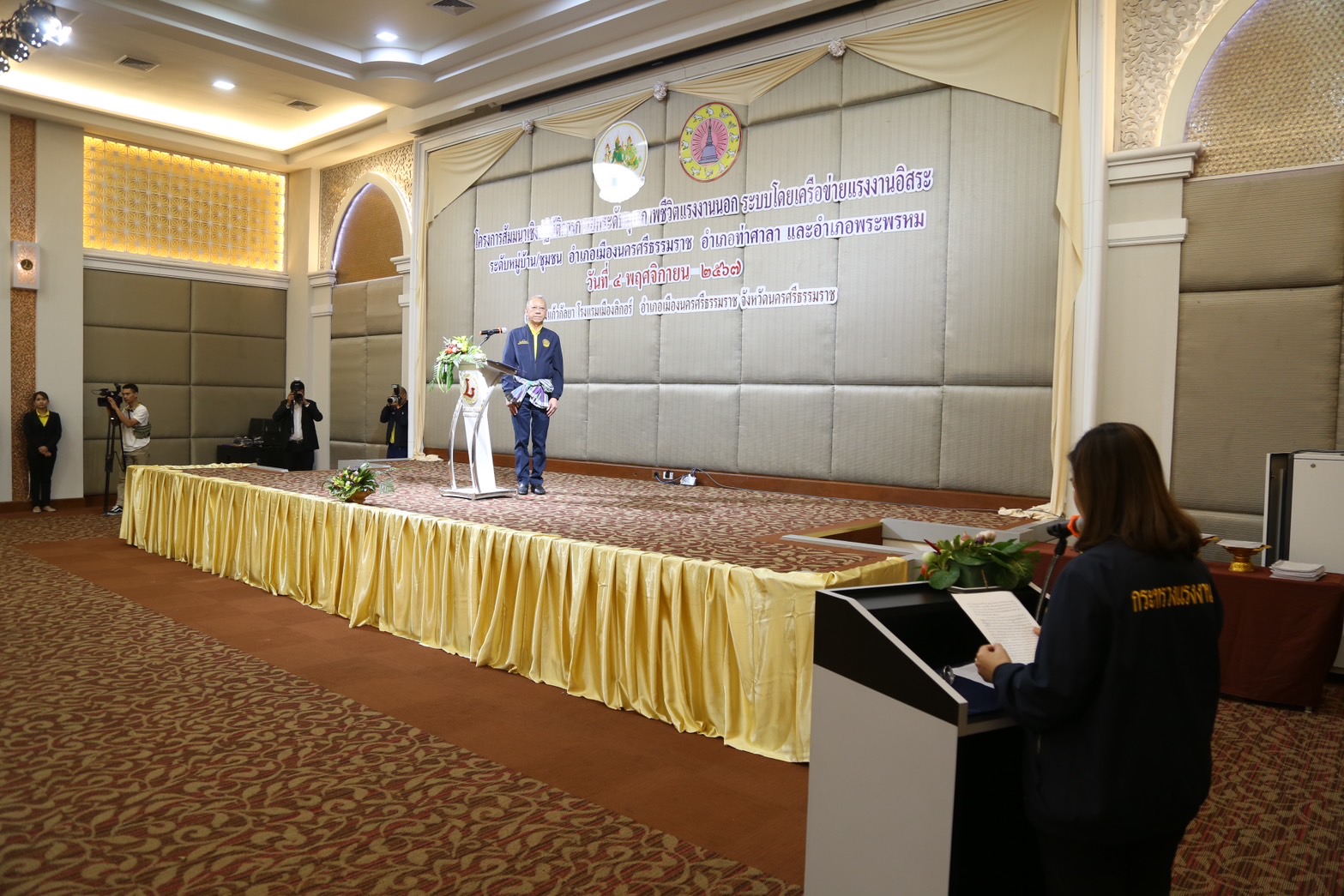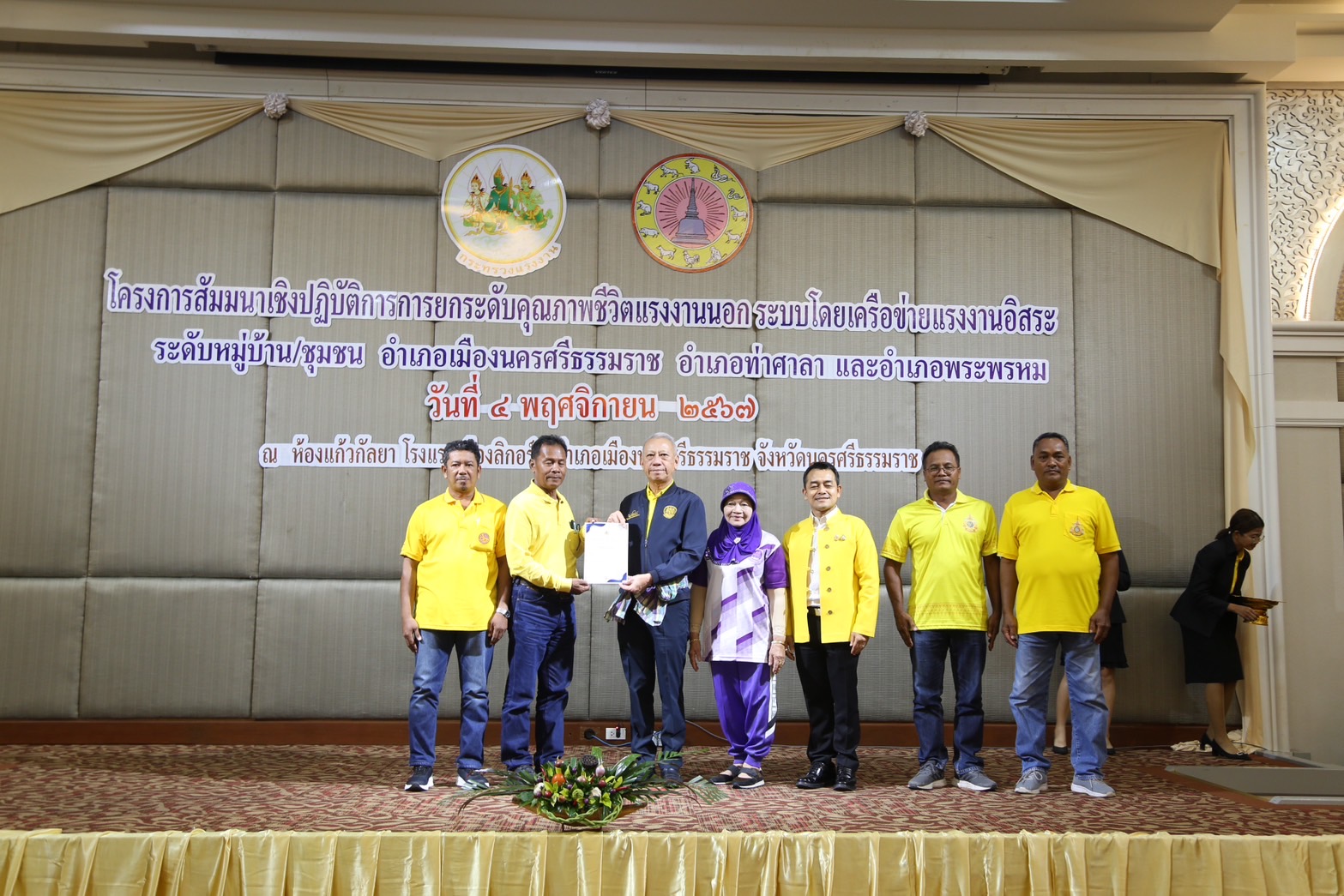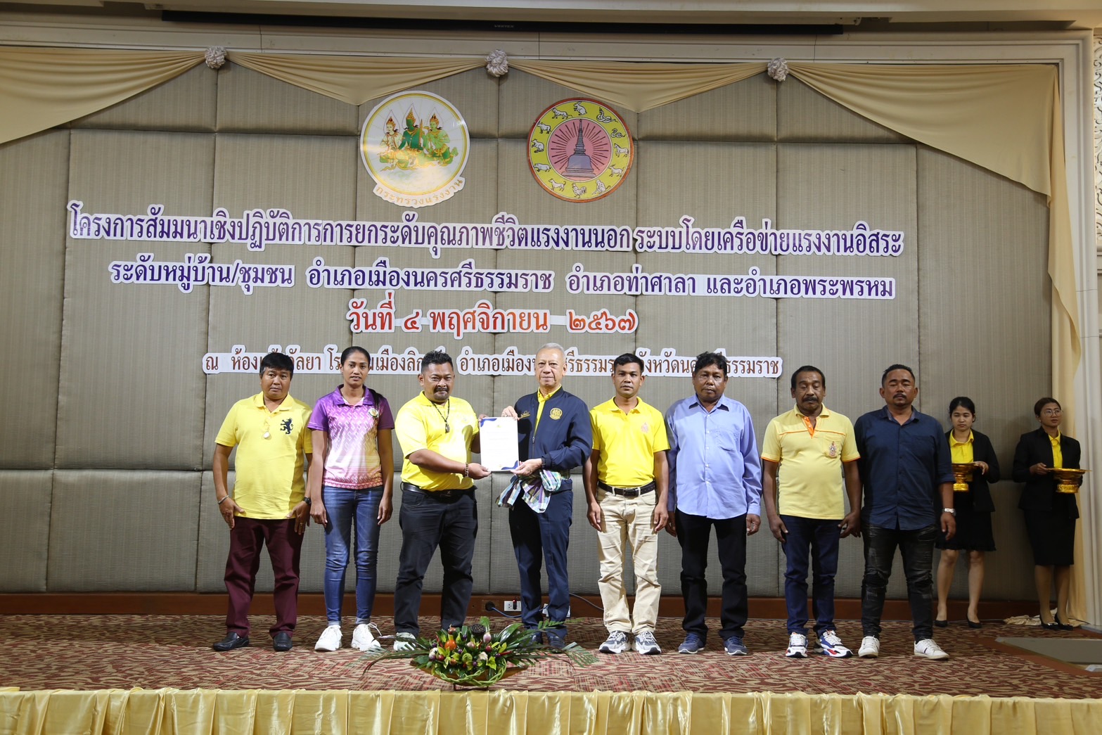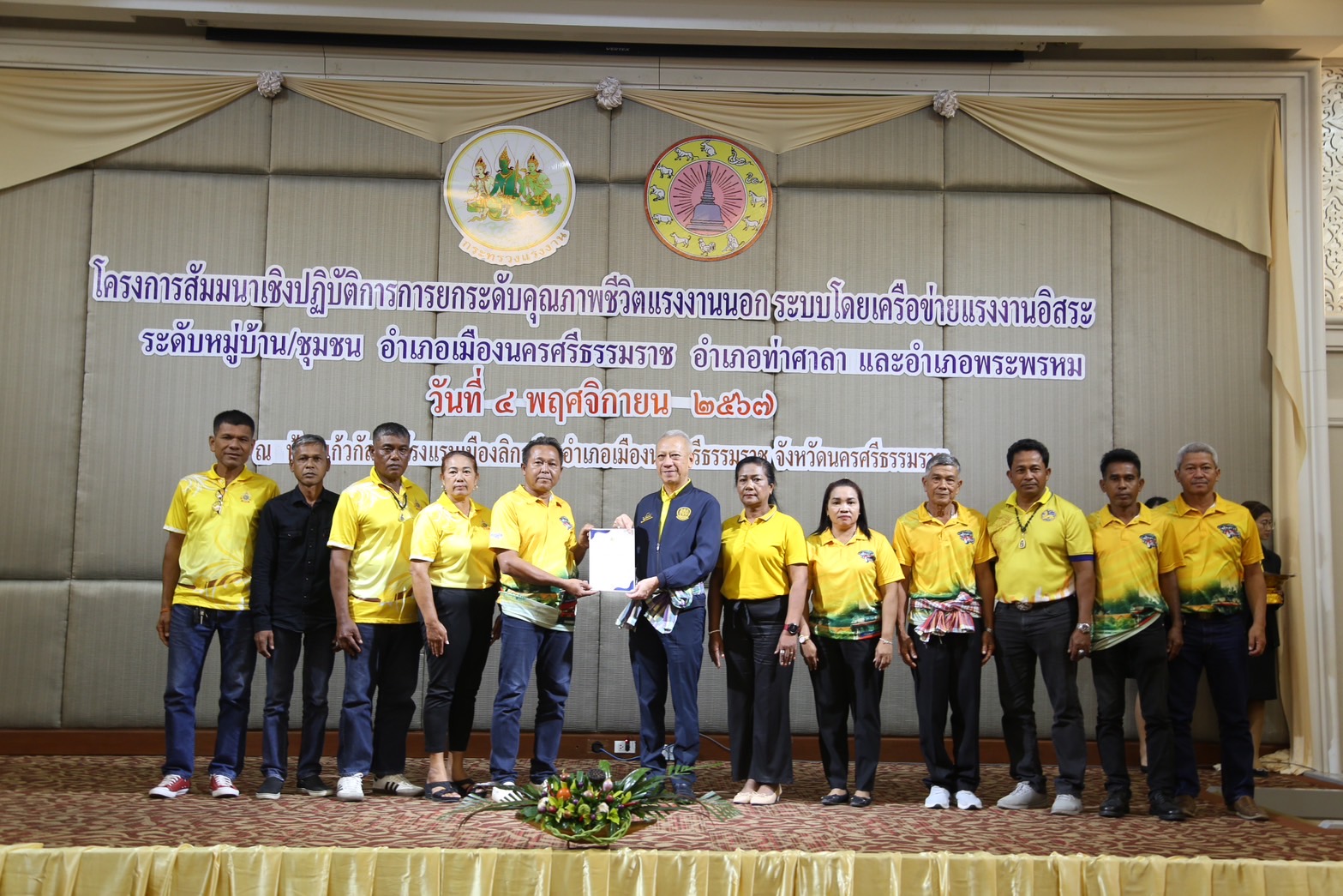 วันที่ 4 พฤศจิกายน 2567 เวลา 13.30 น.นายพิพัฒน์ รัชกิจประการ รัฐมนตรีว่าการกระทรวงแรงงาน เป็นประธานเปิดโครงการสัมมนาเชิงปฏิบัติการการยกระดับคุณภาพชีวิตแรงงานนอกระบบโดยเครือข่ายแรงงานอิสระระดับหมู่บ้าน ชุมชน อำเภอเมืองนครศรีธรรมราช อำเภอท่าศาลา และอำเภอพระพรหม โดยมี นางสาวบุปผา เรืองสุด อธิบดีกรมพัฒนาฝีมือแรงงาน รักษาราชการแทน รองปลัดกระทรวงแรงงาน กล่าวรายงาน พร้อมด้วยผู้บริหารกระทรวงแรงงาน ร่วมเป็นเกียรติ นายศรีธรรม ราชแก้ว รองผู้ว่าราชการจังหวัดนครศรีธรรมราช หัวหน้าส่วนราชการสังกัดกระทรวงแรงงานจังหวัดนครศรีธรรมราช นายอำเภอ ผู้นำชุมชน เครือข่ายแรงงานอิสระ ร่วมให้การต้อนรับ ณ ห้องประชุมแก้วกัลยา ชั้น 2 โรงแรมเมืองลิกอร์ อำเภอเมืองนครศรีธรรมราช จังหวัดนครศรีธรรมราช