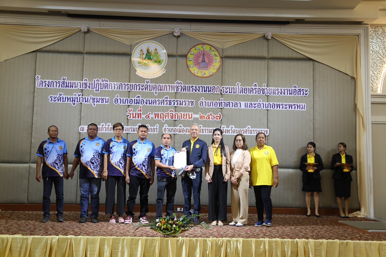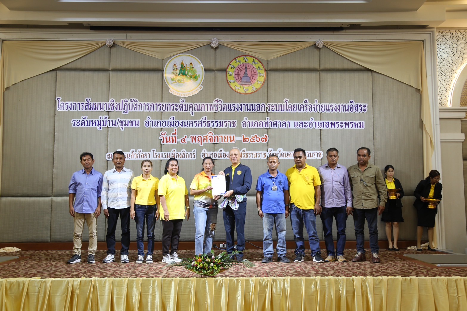 นายพิพัฒน์ กล่าวว่า การสัมมนาเชิงปฏิบัติการการยกระดับคุณภาพชีวิตแรงงานนอกระบบ โดยเครือข่ายแรงงานอิสระระดับหมู่บ้าน ชุมชน ที่ผ่านการอบรม ครู ข ในปีงบประมาณ พ.ศ. 2567 ในพื้นที่ 3 อำเภอของจังหวัดนครศรีธรรมราช ได้แก่ อำเภอเมือง พระพรหม และท่าศาลา รวมทั้งอาสาสมัครแรงงานและเครือข่ายแรงงานนอกระบบในวันนี้ โครงการนี้จะช่วยยกระดับคุณภาพชีวิตแรงงานนอกระบบ โดยเครือข่ายชุมชน ทำให้แรงงานอิสระได้รับการช่วยเหลือมีความมั่นคงด้านอาชีพ มีสวัสดิการที่เหมาะสม ซึ่งเครือข่ายแรงงานอิสระจังหวัดนครศรีธรรมราช มีทั้งสิ้น 23 อำเภอ จำนวน 1,552 หมู่บ้านๆ ละ 1 คน