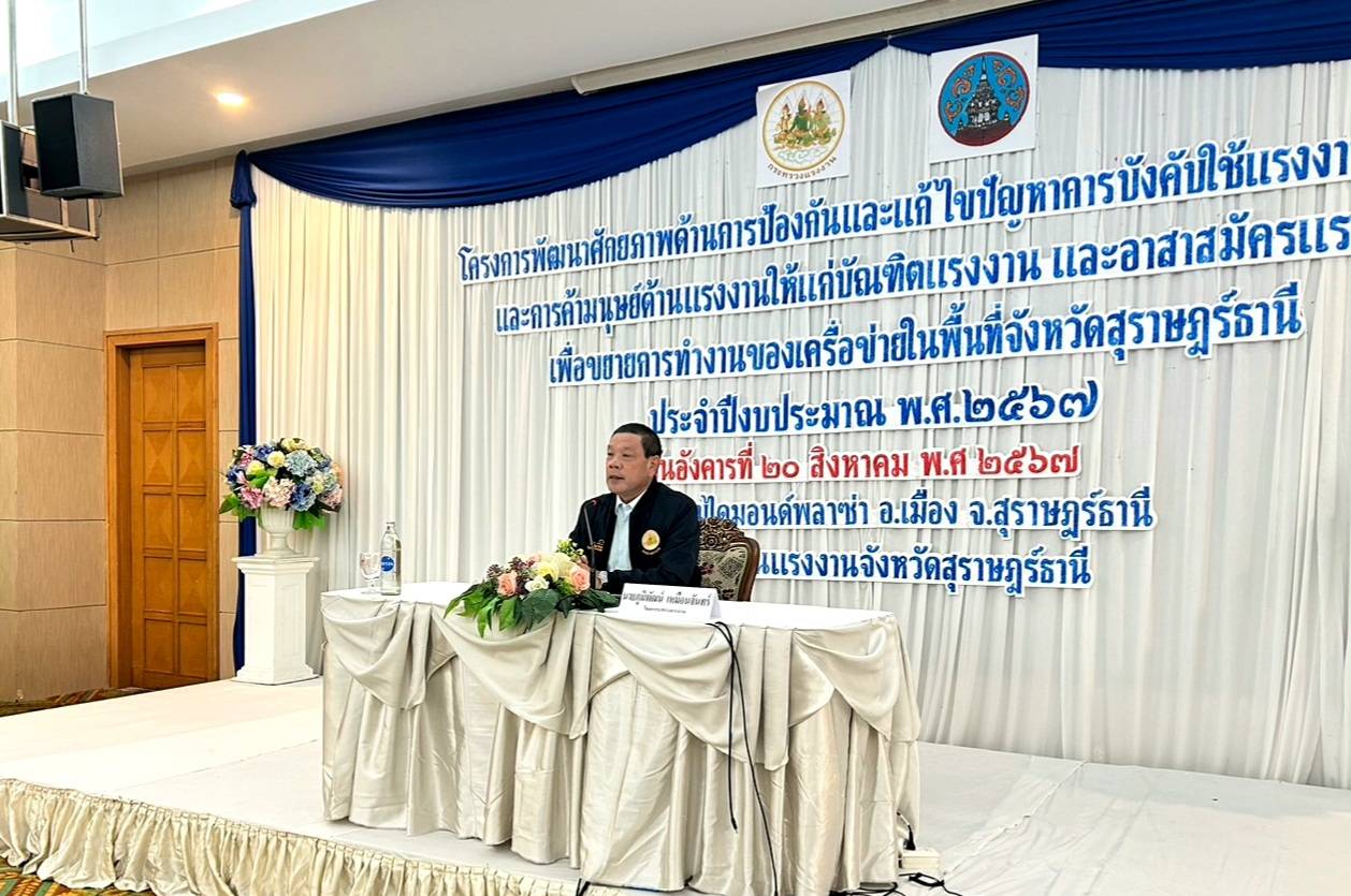 วันที่ 20 สิงหาคม 2567 นายภูมิพัฒน์ เหมือนจันทร์ โฆษกกระทรวงแรงงาน เปิดเผยว่า ท่านพิพัฒน์ รัชกิจประการ รัฐมนตรีว่าการกระทรวงแรงงาน ให้ความสำคัญในการยกระดับมาตรฐานการคุ้มครองดูแลและป้องกันไม่ให้แรงงานไทยและแรงงานต่างชาติตกเป็นผู้เสียหายจากการค้ามนุษย์ ในวันนี้จึงได้มอบหมายให้ผมมาเป็นประธานเปิดโครงการพัฒนาศักยภาพด้านการป้องกันและแก้ไขปัญหาการบังคับใช้แรงงานหรือบริการและการค้ามนุษย์ด้านแรงงานให้แก่บัณฑิตแรงงานและอาสาสมัครแรงงาน เพื่อขยายการทำงานของเครือข่ายในพื้นที่จังหวัดสุราษฎร์ธานี ประจำปีงบประมาณ พ.ศ.2567 โดยมี นางสาวอารีย์ การธิโรแรงงานจังหวัดสุราษฎร์ธานี กล่าวรายงาน นายพิชัย ชมพูพล สมาชิกสภาผู้แทนราษฎรจังหวัดสุราษฎร์ธานี หัวหน้าส่วนราชการหน่วยงานสังกัดกระทรวงแรงงานจังหวัดสุราษฎร์ธานี บัณฑิตแรงงานและอาสาสมัครแรงงานจังหวัดสุราษฎร์ธานี ผู้เข้ารับการอบรม ร่วมให้การต้อนรับ ณ โรงแรมไดมอนด์พลาซ่า อำเภอเมือง จังหวัดสุราษฎร์ธานี