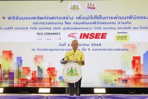 นายเดชา พฤกษ์พัฒนรักษ์ อธิบดีกรมพัฒนาฝีมือแรงงาน กล่าวต่อว่า ระยะเวลากว่า 20 ปีที่ผ่านมา กรมพัฒนาฝีมือแรงงาน และเครือข่ายพัฒนาฝีมือแรงงานทั้ง 3 แห่ง ได้ร่วมกันผลิตแรงงานด้านก่อสร้างมาแล้วกว่า 30,000 คน ในปี 2568 นี้มีเป้าหมายในการผลิตแรงงานช่างก่อสร้างอีกจำนวน 1,000 คน ซึ่งได้ให้การสนับสนุนผลิตภัณฑ์กระเบื้องเซรามิกปูพื้น ผลิตภัณฑ์ปูนกาว และปูนยาแนวกระเบื้อง จำนวน 2,231 ตารางเมตร มูลค่า 588,000 บาท และผลิตภัณฑ์ปูนซีเมนต์ จำนวน 105 ตัน มูลค่า 210,000 บาท เพื่อส่งต่อให้หน่วยงานของกรมพัฒนาฝีมือแรงงานใน 20 จังหวัด ได้แก่ สมุทรปราการ สุพรรณบุรี นครราชสีมา ขอนแก่น นครสวรรค์ ลำปาง อุดรธานี เชียงราย ภูเก็ต นครศรีธรรมราช นนทบุรี จันทบุรี กาญจนบุรี บุรีรัมย์ กาฬสินธุ์ กำแพงเพชร เพชรบูรณ์ ลำพูน อำนาจเจริญ และอ่างทอง นำไปใช้จัดฝึกอบรมในหลักสูตรต่าง ๆ เช่น ช่างปูกระเบื้อง ช่างก่ออิฐ ช่างฉาบปูน การสร้างพื้นคอนกรีตเสริมเหล็ก ช่างคอนกรีตเสริมเหล็กเป็นต้น และฝึกภาคปฏิบัติเพื่อสร้างสาธารณประโยชน์ เช่น โรงเรียน วัด เรือนจำ ศูนย์การเรียนรู้ สำนักสงฆ์ เป็นต้น แรงงานที่ต้องการฝึกอบรมในหลักสูตรดังกล่าว ต้องมีอายุ 18 ปีบริบูรณ์ขึ้นไปมีพื้นฐานทางช่างก่อสร้างหรือเป็นช่างชุมชนหรือผู้ที่สนใจจะประกอบอาชีพช่างก่อสร้างสามารถติดต่อสอบถามได้ที่สถาบัน และสำนักงานพัฒนาฝีมือแรงงานใน 20 จังหวัดที่กล่าวข้างต้น หรือสอบถามเพิ่มเติมได้ที่เว็ปไซต์กรมพัฒนาฝีมือแรงงาน www.dsd.go.th ขอขอบคุณบริษัท เอสซีจี เซรามิกส์ จำกัด (มหาชน) บริษัท ปูนซีเมนต์นครหลวง จำกัด (มหาชน) และบริษัท แซง-โกแบ็ง เวเบอร์ จำกัด ที่ให้ความสำคัญแก่แรงงานในครั้งนี้เป็นอย่างยิ่ง อธิบดีกล่าวทิ้งท้าย