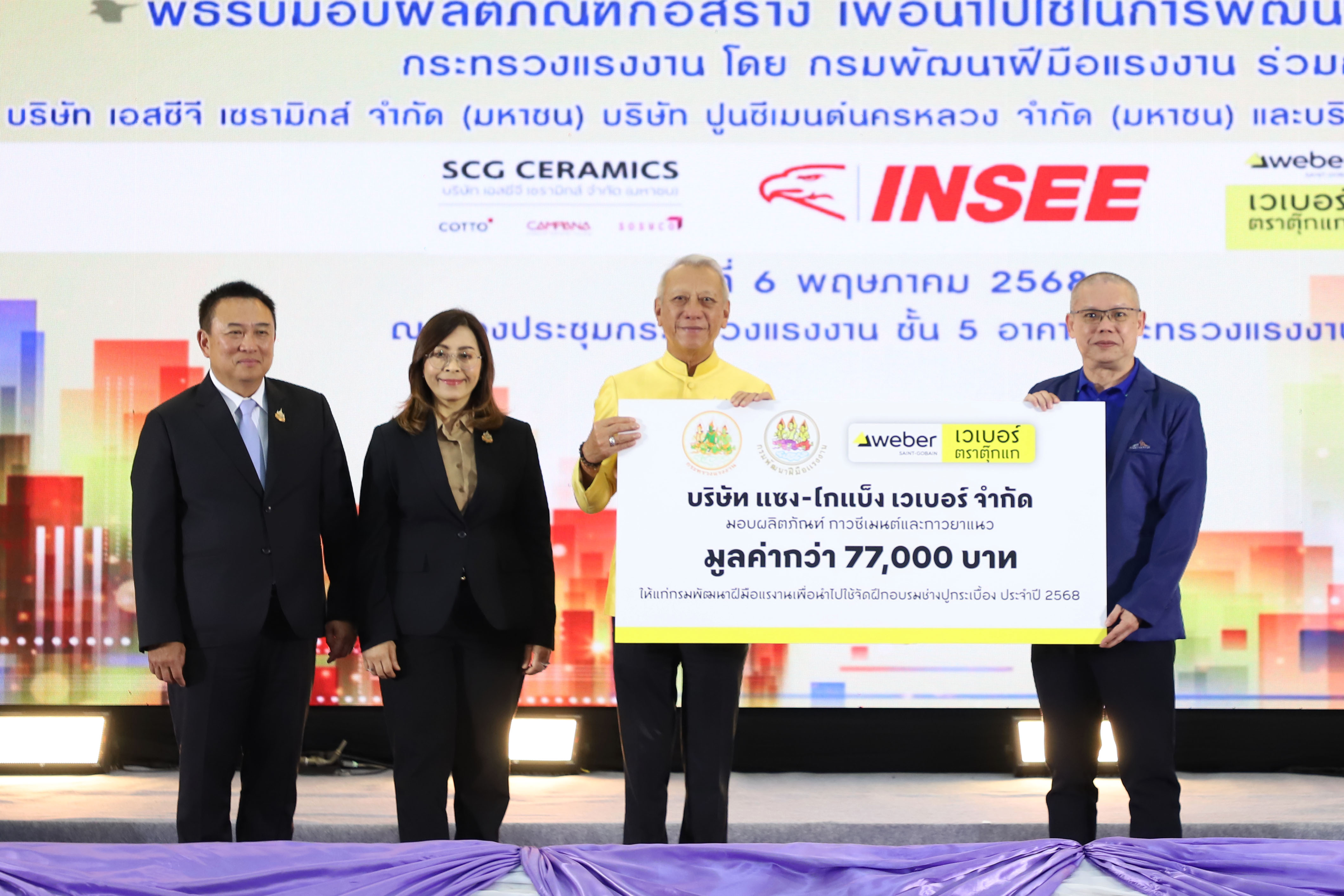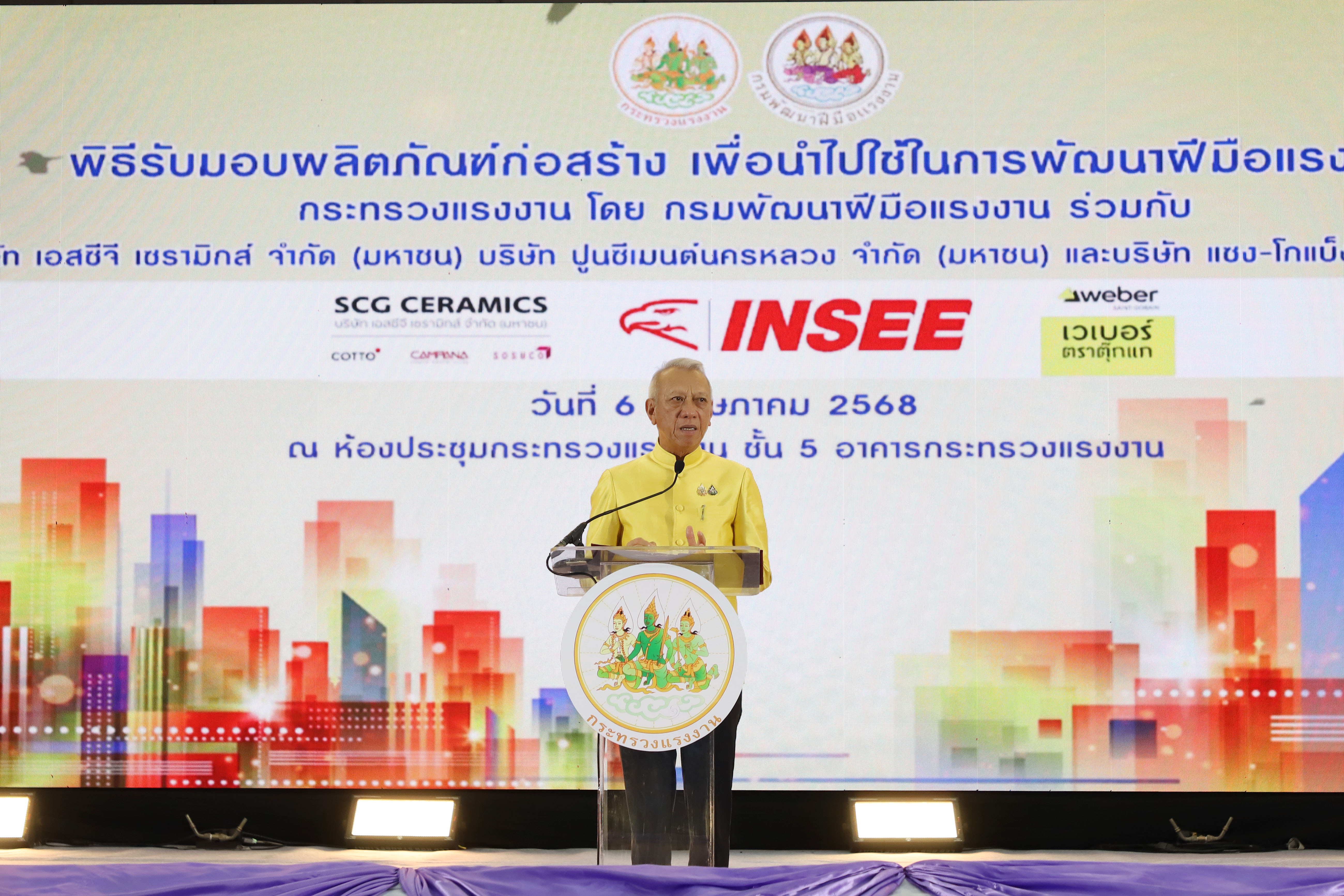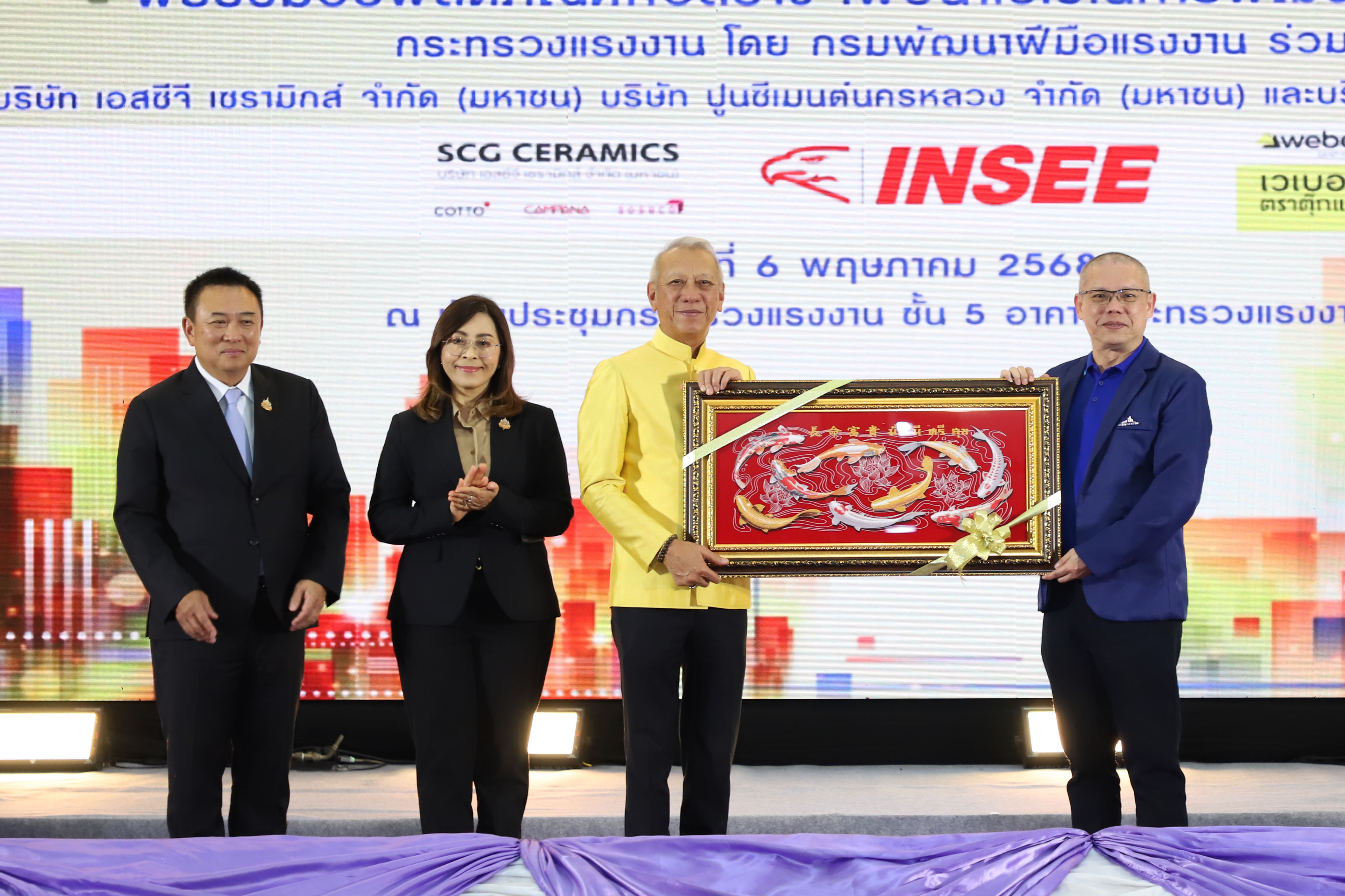 นายพิพัฒน์ รัชกิจประการ รัฐมนตรีว่าการกระทรวงแรงงาน เปิดเผยว่า การจัดงานในวันนี้ เป็นความร่วมมือระหว่างกระทรวงแรงงาน โดยกรมพัฒนาฝีมือแรงงาน บริษัท เอสซีจี เซรามิกส์ จำกัด (มหาชน) บริษัท ปูนซีเมนต์นครหลวง จำกัด (มหาชน) และบริษัท แซง-โกแบ็ง เวเบอร์ จำกัด ที่ร่วมมือกันมาเป็นเวลากว่า 20 ปี ในการส่งเสริมให้แรงงานที่ประกอบอาชีพด้านก่อสร้าง เช่น ช่างก่อสร้าง ช่างปูกระเบื้อง ได้รับการพัฒนาฝีมือแรงงาน เนื่องจากอุตสาหกรรมก่อสร้างเป็นอุตสาหกรรมหนึ่งที่มีบทบาทสำคัญต่อการพัฒนาประเทศ ทั้งในด้านเศรษฐกิจและสังคม เป็นอุตสาหกรรมที่สร้างโครงสร้างพื้นฐานที่จำเป็นต่อการพัฒนาประเทศ และสร้างรายได้ให้แก่แรงงานจำนวนมาก เป็นแหล่งการจ้างงานที่สำคัญ ทั้งในรูปแบบแรงงานฝีมือ และแรงงานทั่วไป ให้มีประสิทธิภาพ และมาตรฐานในการทำงาน ซึ่งกำลังขาดแคลนแรงงานเป็นจำนวนมาก ประกอบกับในยุคปัจจุบันมีการนำเทคโนโลยีต่าง ๆ เข้ามา วัสดุอุปกรณ์ในการก่อสร้างทันสมัยมากขึ้น ช่างฝีมือจึงต้องได้รับการพัฒนาให้มีความรู้ความสามารถให้เท่าทันเทคโนโลยีในปัจจุบัน ดังนั้น การที่ภาคเอกชนที่เป็นบริษัทชั้นนำระดับประเทศ มีความเชี่ยวชาญด้านงานก่อสร้าง มีวัสดุอุปกรณ์ที่ดี และทันสมัย ร่วมมือกับภาครัฐ นับเป็นโอกาสดีของแรงงานไทยอย่างยิ่ง