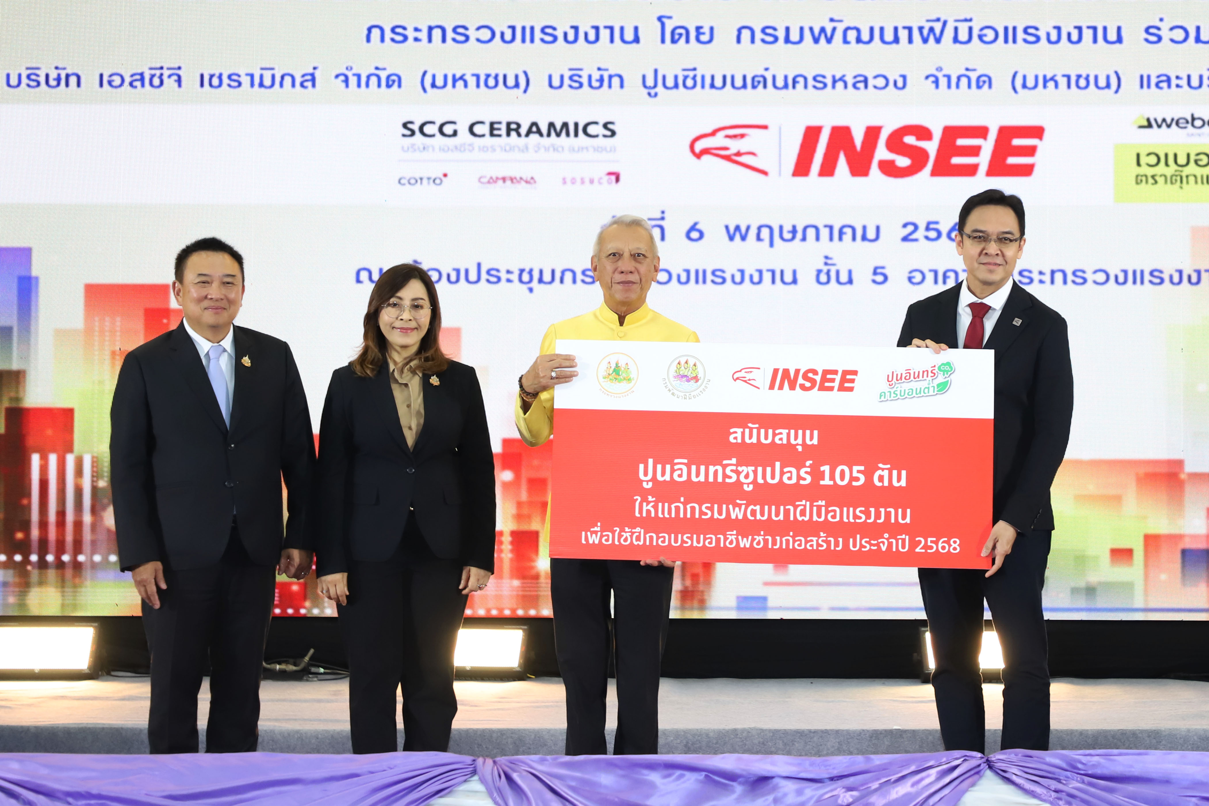 วันที่ 6 พฤษภาคม 2568 นายพิพัฒน์ รัชกิจประการ รัฐมนตรีว่าการกระทรวงแรงงาน เป็นประธานรับมอบผลิตภัณฑ์ก่อสร้างจาก 3 บริษัทชั้นนำ ได้แก่ บริษัท ปูนซีเมนต์นครหลวง จำกัด (มหาชน) บริษัท เอสซีจี เซรามิกส์ จำกัด (มหาชน) และบริษัท แซง-โกแบ็ง เวเบอร์ จำกัด โดยมี นายภุชงค์ วรศรี ประจำสำนักเลขาธิการนายกรัฐมนตรี ปฏิบัติหน้าที่ประจำกระทรวงแรงงาน นายภูมิพัฒน์ เหมือนจันทร์ โฆษกกระทรวงแรงงาน นาวาอากาศเอก อธิคุณ คงมี คณะที่ปรึกษารัฐมนตรีด้านการบริหารจัดการแรงงานผิดกฎหมาย นางสาวบุปผา เรืองสุด รองปลัดกระทรวงแรงงาน พร้อมผู้บริหารกระทรวงแรงงาน เข้าร่วมด้วย ณ ห้องประชุมกระทรวงแรงงาน ชั้น 5 อาคารกระทรวงแรงงาน