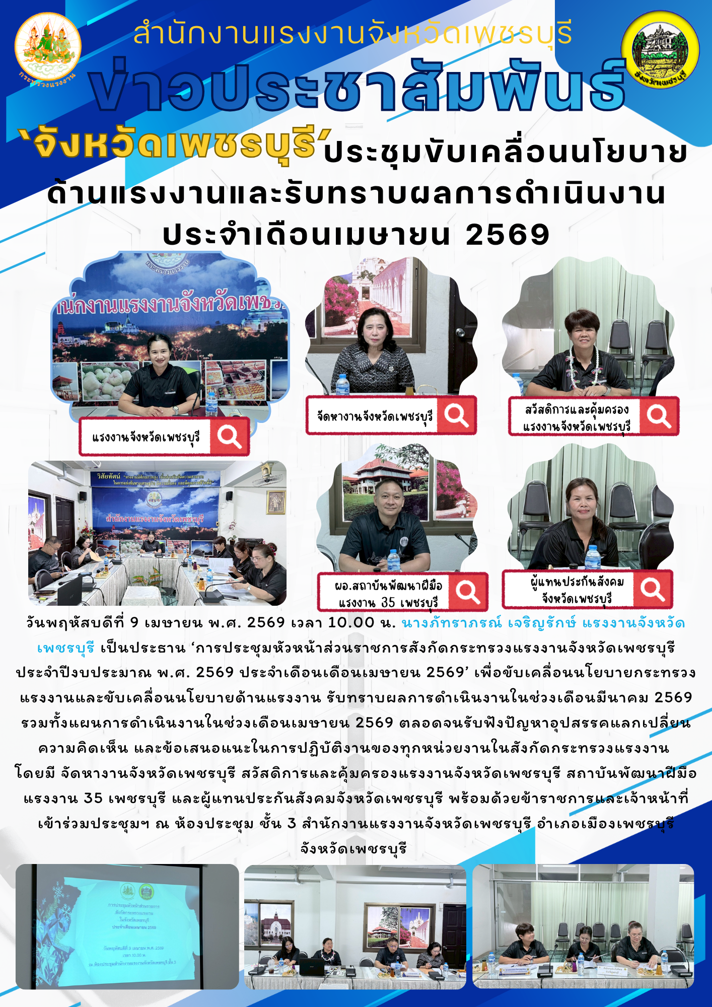 ‘จังหวัดเพชรบุรี’ ประชุมขับเคลื่อนนโยบายด้านแรงงาน และรับทราบผลการดำเนินงาน ประจำเดือนเมษายน 2569