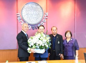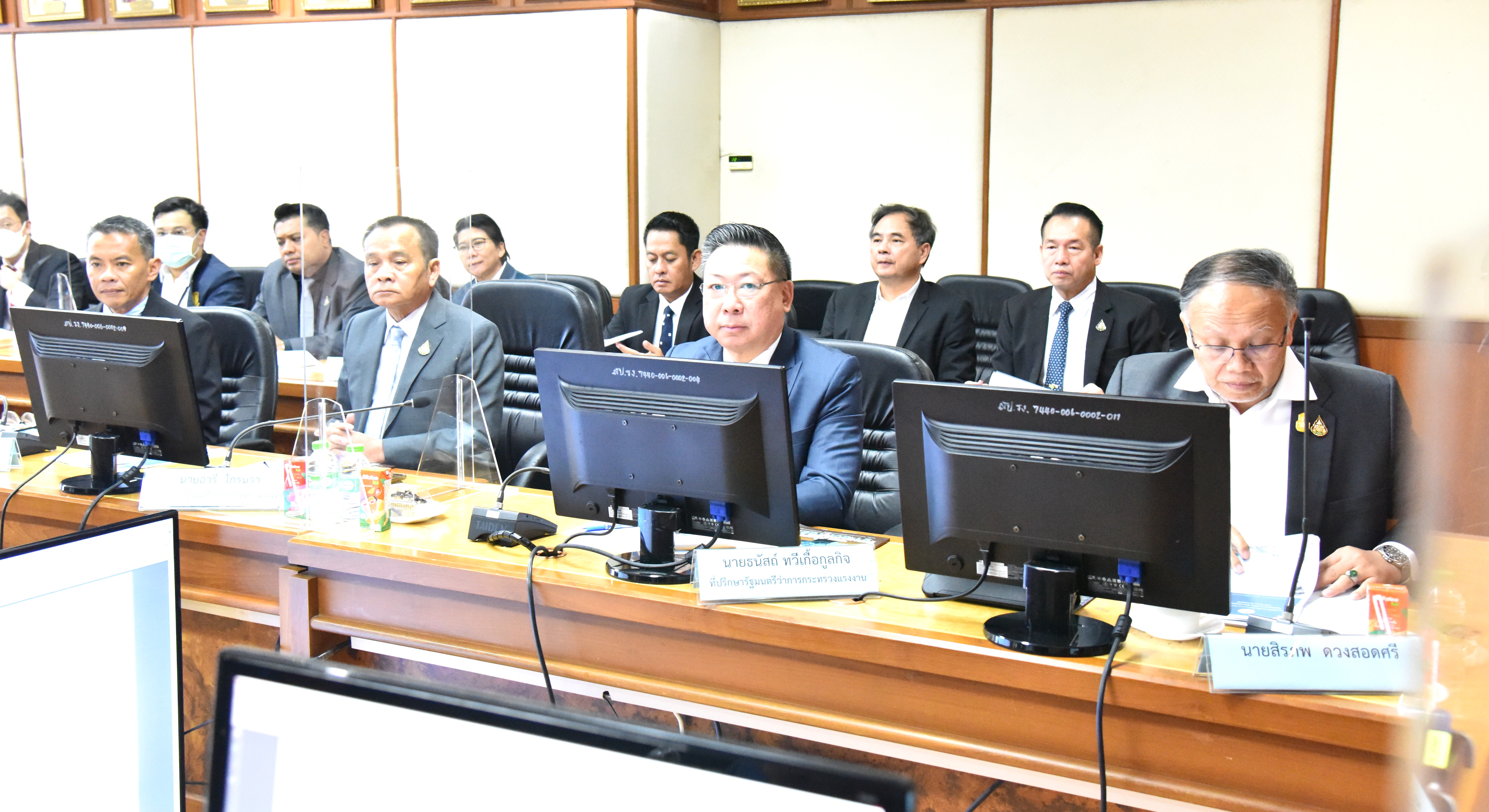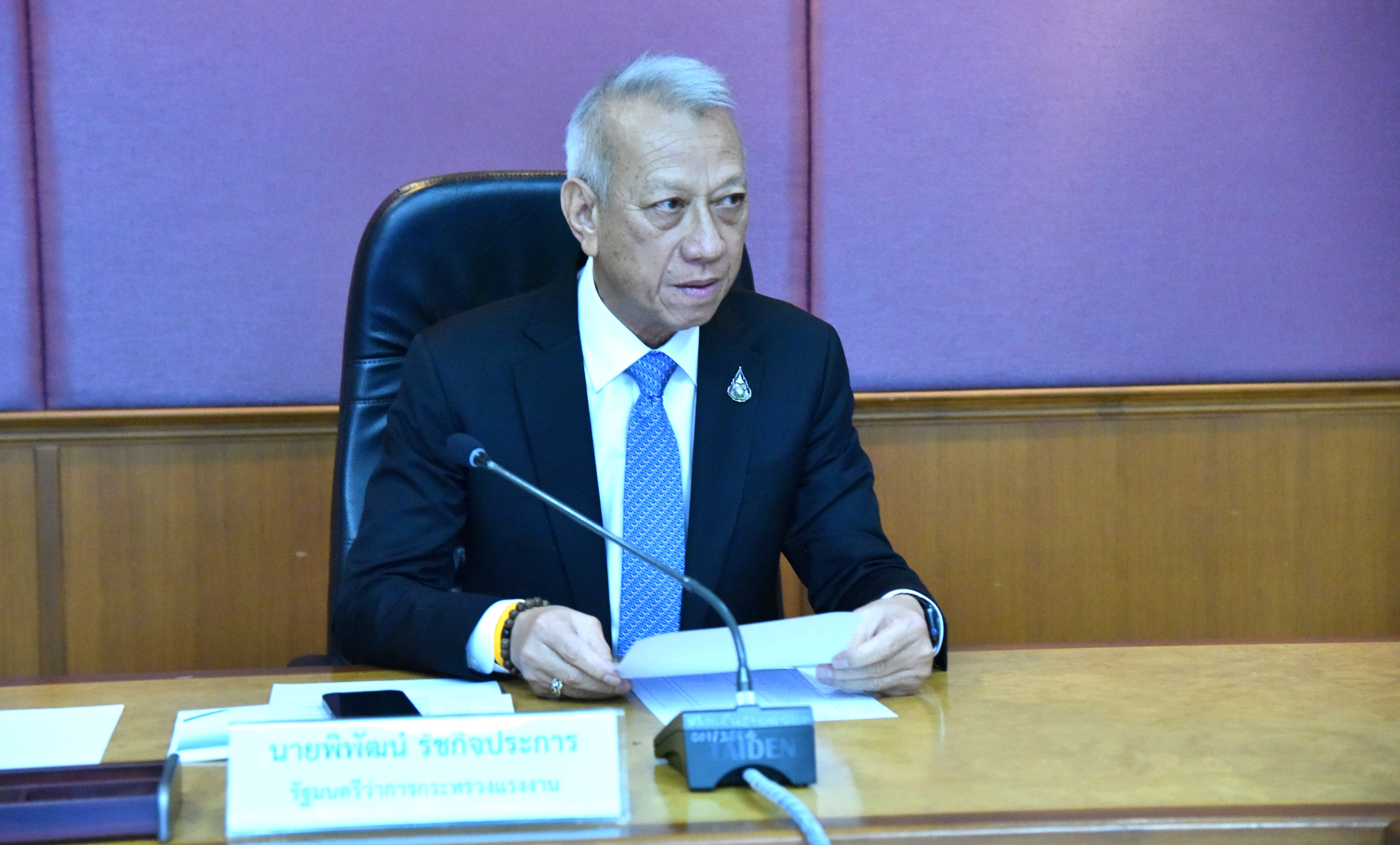 On September 20, 2023, at 13.30 hours, the Labour Minister, Mr. Phiphat Ratchakitprakarn, welcomed the Chairman of the 20th National Labour Development Advisory Council, Dr. Thanit Sorat, and delegation to congratulate him on assuming the position of Labour Minister. He also presented an action plan and study report on the future of the labour market under transition. The occasion took place at the Prasong Rananant meeting room, 5th floor, Ministry of Labour.