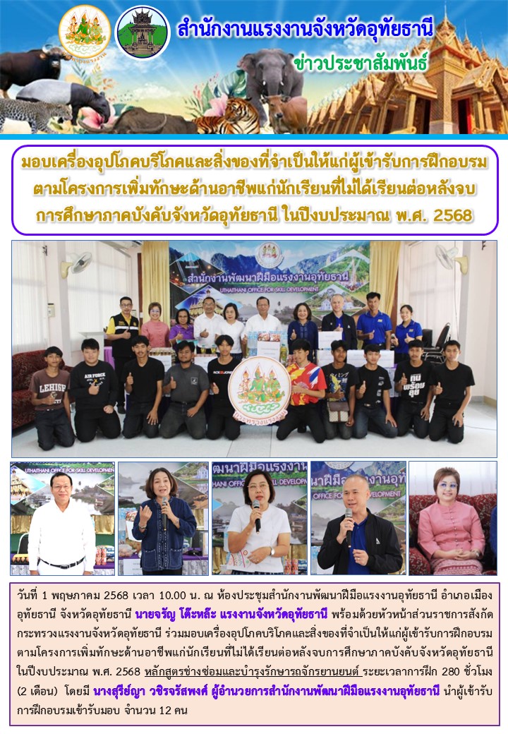 มอบเครื่องอุปโภคบริโภคและสิ่งของที่จำเป็นให้แก่ผู้เข้ารับการฝึกอบรมตามโครงการเพิ่มทักษะด้านอาชีพแก่นักเรียนที่ไม่ได้เรียนต่อหลังจบการศึกษาภาคบังคับจังหวัดอุทัยธานี ในปีงบประมาณ พ.ศ. 2568