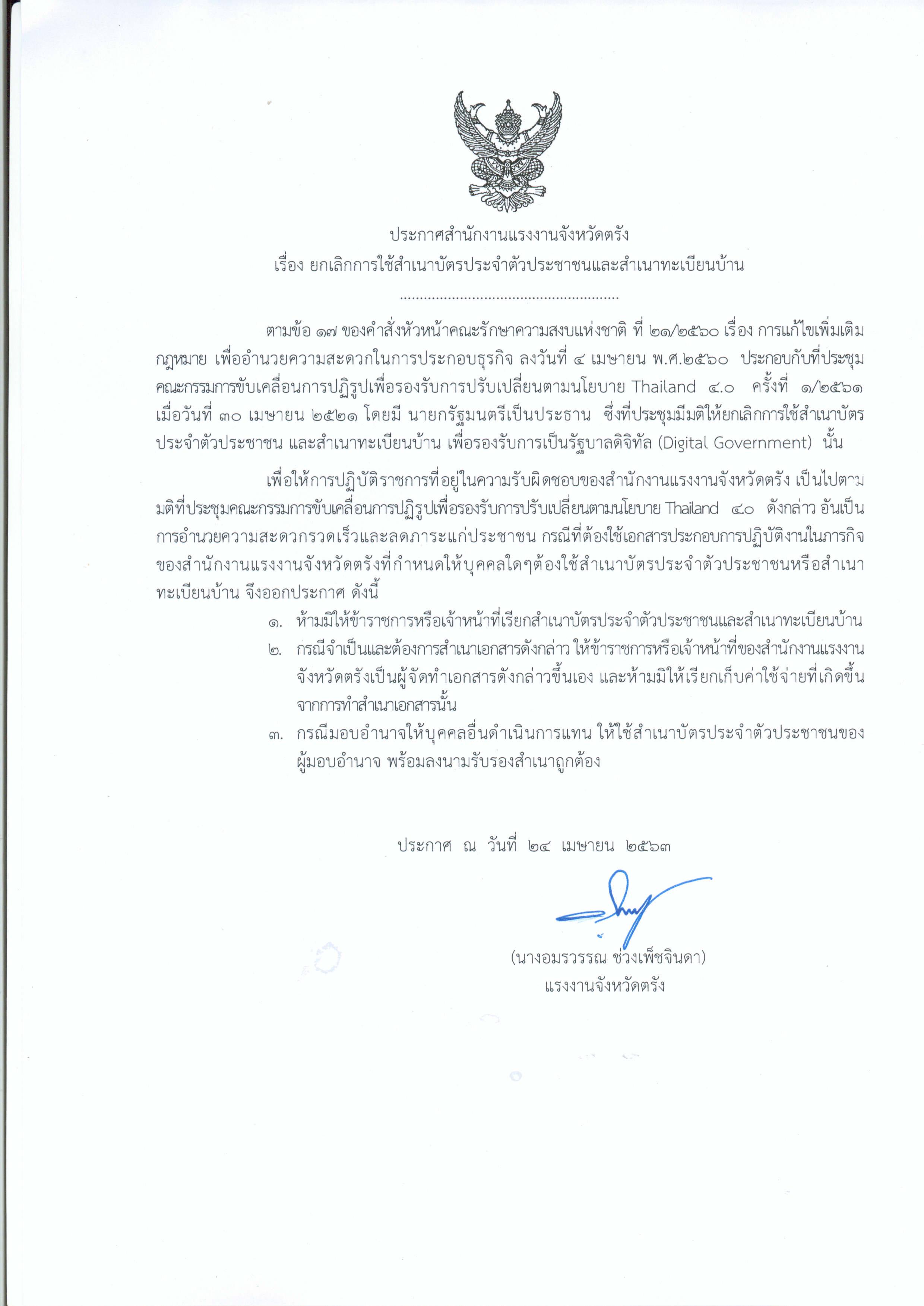สำนักงานแรงงานจังหวัดตรัง ประกาศยกเลิการใช้สำเนาบัตรประจำตัวประชาชนและสำเนาทะเบียนบ้าน