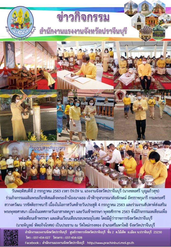 วันพฤหัสบดีที่ 2 กรกฎาคม 2563 เวลา 09.09 น. แรงงานจังหวัดปราจีนบุรี (นางชลอศรี บุญแก้วสุข) ร่วมกิจกรรมเฉลิมพระเกียรติสมเด็จพระเจ้าน้องนางเธอ เจ้าฟ้าจุฬาภรณวลัยลักษณ์ อัครราชกุมารี กรมพระศรีสวางควัฒน วรขัตติยราชนารี เนื่องในโอกาสวันคล้ายวันประสูติ 4 กรกฎาคม 2563 และร่วมงานสัปดาห์ส่งเสริมพระพุทธศาสนา เนื่องในเทศกาลวันอาสาฬหบูชา และวันเข้าพรรษา พุทธศักราช 2563 ซึ่งมีกิจกรรมเทเทียนเพื่อหล่อเทียนเข้าพรรษา และเดินเวียนเทียนรอบพระอุโบสถ โดยมี ผู้ว่าราชการจังหวัดปราจีนบุรี (นายพิบูลย์ หัตถกิจโกศล) เป็นประธาน ณ วัดใหม่กรงทอง อำเภอศรีมหาโพธิ จังหวัดปราจีนบุรี