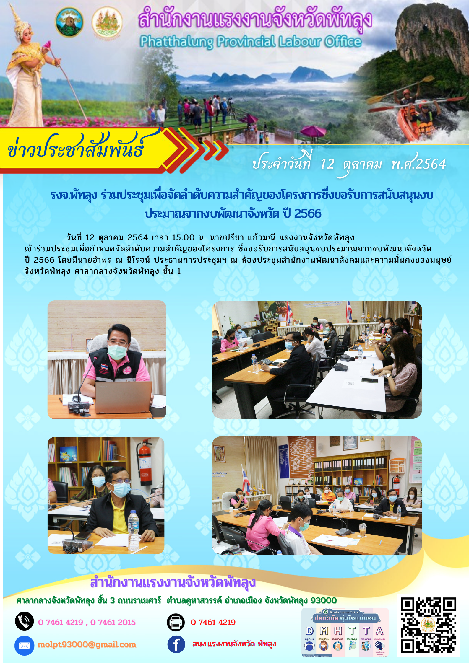 วันที่ 12 ตุลาคม 2564 เวลา 15.00 น. นายปรีชา แก้วมณี แรงงานจังหวัดพัทลุง เข้าร่วมประชุมเพื่อกำหนดจัดลำดับความสำคัญของโครงการ ซึ่งขอรับการสนับสนุนงบประมาณจากงบพัฒนาจังหวัดปี 2566 โดยมีนายอำพร ณ นิโรจน์ ประธานการประชุมฯ ณ ห้องประชุมสำนักงานพัฒนาสังคมและความมั่นคงของมนุษย์จังหวัดพัทลุง ศาลากลางจังหวัดพัทลุง ชั้น 1