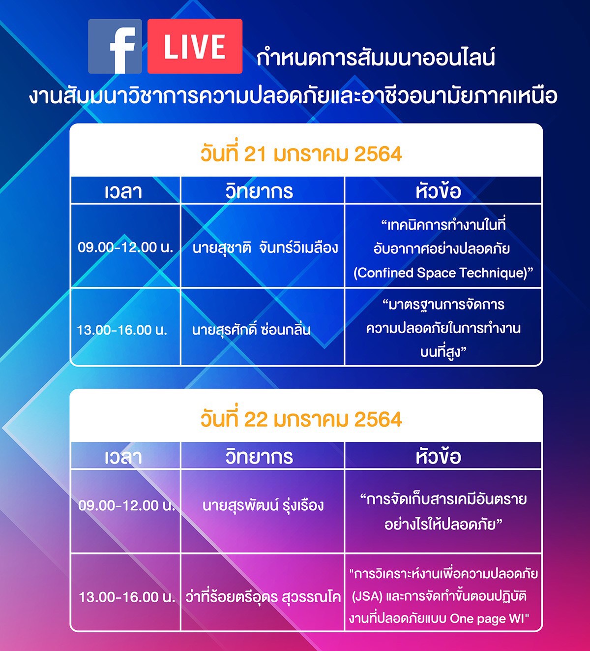 วันที่ 18 มกราคม 2564 ศาสตราจารย์ นฤมล ภิญโญสินวัฒน์ รัฐมนตรีช่วยว่าการกระทรวงแรงงาน เปิดเผยว่า เนื่องด้วยปัจจุบันสถานการณ์การแพร่ระบาดของโควิด-19 ยังคงทวีความรุนแรง สถาบันส่งเสริมความปลอดภัย และอาชีวอนามัย และสภาพแวดล้อมในการทำงาน (องค์การมหาชน) หรือ สสปท. มีความห่วงใยต่อผู้ที่ต้องการเข้าร่วมสัมมนาวิชาการความปลอดภัยและอาชีวอนามัย จึงได้ร่วมเป็นส่วนหนึ่งในการส่งเสริมให้ประชาชนใช้ชีวิตตามวิถีใหม่ หรือ New normal โดยปรับรูปแบบจัดฝึกอบรมผ่านทาง Facebook Live (Facebook Fanpage: สสปท-TOSH) เพื่อเปิดโอกาสให้สถานประกอบกิจการได้มีโอกาสเข้ารับการอบรม นำไปสู่การพัฒนาศักยภาพขององค์กรอย่างต่อเนื่อง