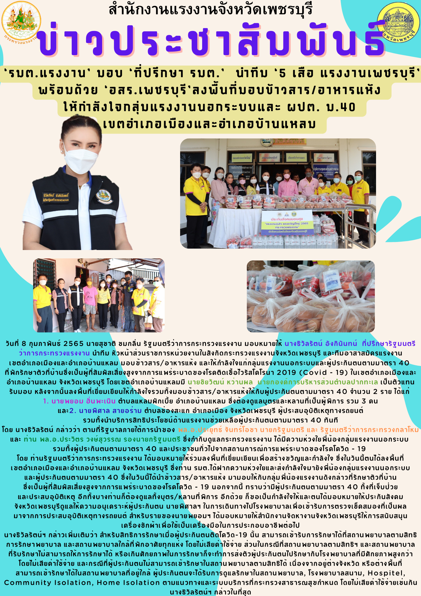 วันที่ 8 กุมภาพันธ์ 2565 นายสุชาติ ชมกลิ่น รัฐมนตรีว่าการกระทรวงแรงงาน มอบหมายให้ นางธิวัลรัตน์ อังกินันทน์ ที่ปรึกษารัฐมนตรีว่าการกระทรวงแรงงาน นำทีม หัวหน้าส่วนราชการหน่วยงานในสังกัดกระทรวงแรงงานจังหวัดเพชรบุรี และทีมอาสาสมัครแรงงานเขตอำเภอเมืองและอำเภอบ้านแหลม มอบข้าวสาร/อาหารแห้ง และให้กำลังใจแก่กลุ่มแรงงานนอกระบบและผู้ประกันตนตามมาตรา 40 ที่พักรักษาตัวที่บ้านซึ่งเป็นผู้ที่สัมผัสเสี่ยงสูงจากการแพร่ระบาดของโรคติดเชื้อไวรัสโคโรนา 2019 (Covid – 19) ในเขตอำเภอเมืองและอำเภอบ้านแหลม จังหวัดเพชรบุรี โดยเขตอำเภอบ้านแหลมมี นายชัยวัฒน์ หว่านผล นายกองค์การบริหารส่วนตำบลปากทะเล เป็นตัวแทนรับมอบ หลังจากนั้นลงพื้นที่เยี่ยมเยียนให้กำลังใจรวมทั้งมอบข้าวสาร/อาหารแห้งให้กับผู้ประกันตนตามมาตรา 40 จำนวน 2 ราย ได้แก่ 1. นายพยอม ฮั่นพะเนิน ตำบลแหลมผักเบี้ย อำเภอบ้านแหลม ซึ่งต้องดูแลบุตรและหลานที่เป็นผู้พิการ รวม 3 คน และ 2. นายพิศาล สายอร่าม ตำบลช่องสะแก อำเภอเมือง จังหวัดเพชรบุรี ผู้ประสบอุบัติเหตุทางรถยนต์ รวมทั้งนำบริการสิทธิประโยชน์ด้านแรงงานช่วยเหลือผู้ประกันตนตามมาตรา 40 ทันที