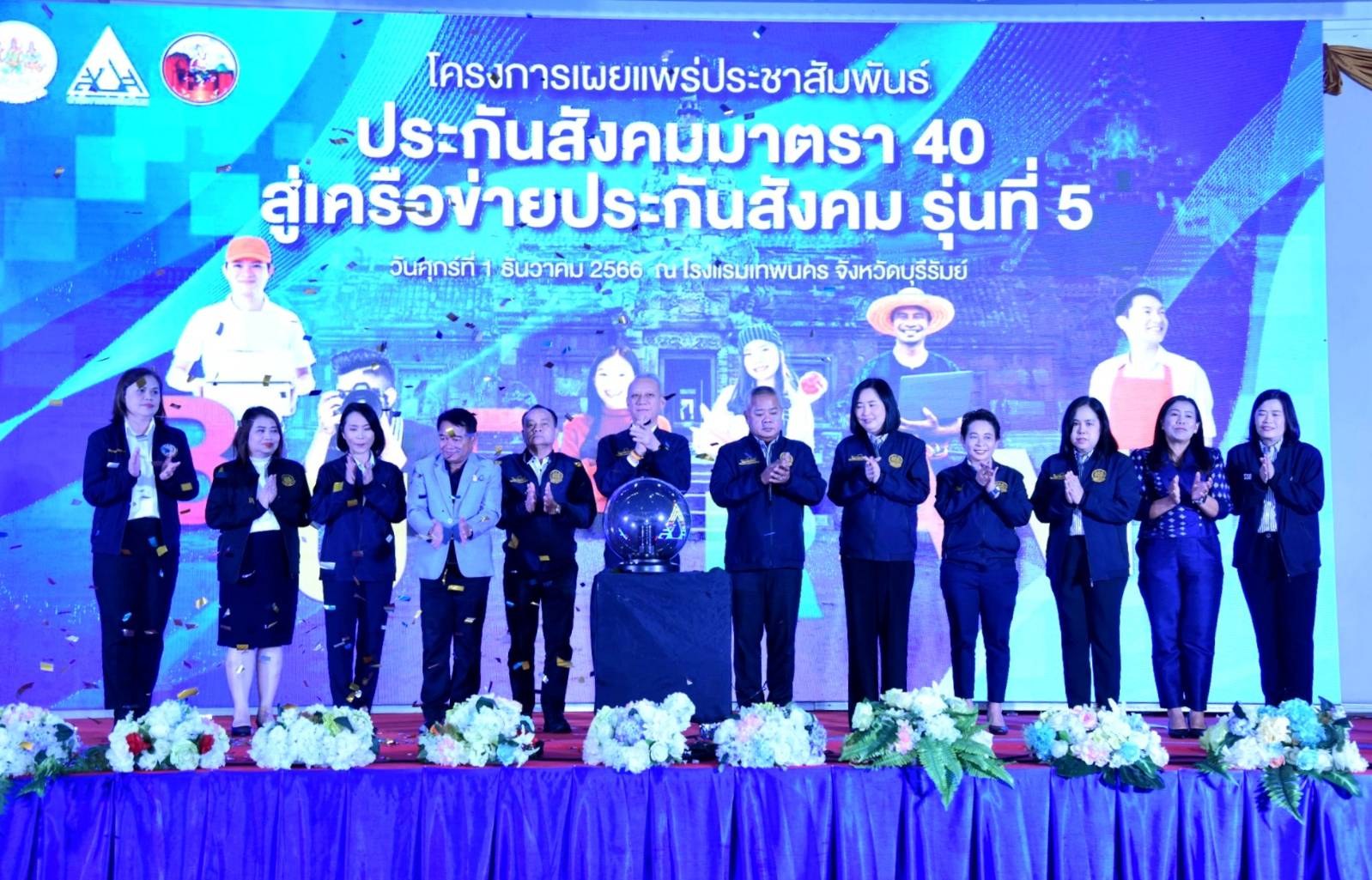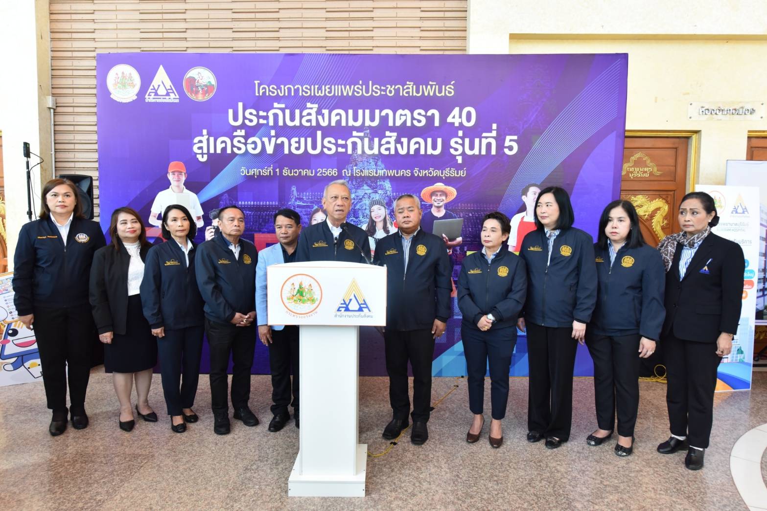 เมื่อวันที่ 1 ธันวาคม 2566 เวลา 10.00 น. นายพิพัฒน์ รัชกิจประการ รัฐมนตรีว่าการกระทรวงแรงงาน เป็นประธานเปิดโครงการเผยแพร่ประชาสัมพันธ์ประกันสังคมมาตรา 40 สู่เครือข่ายประกันสังคม รุ่นที่ 5 โดยมี นายอารี ไกรนรา เลขานุการรัฐมนตรีว่าการกระทรวงแรงงาน นายจําเริญ แหวนเพ็ชร รองผู้ว่าราชการจังหวัดบุรีรัมย์ กล่าวต้อนรับ นายบุญสงค์ ทัพชัยยุทธ์ เลขาธิการสำนักงานประกันสังคม กล่าวรายงานวัตถุประสงค์การจัดงาน พร้อมด้วย ผู้บริหารระดับสูงกระทรวงแรงงาน หัวหน้าส่วนราชการหน่วยงานในสังกัดกระทรวงแรงงานจังหวัดบุรีรัมย์ เครือข่ายประกันสังคม และผู้ประกันตนในพื้นที่ เข้าร่วมกิจกรรมในครั้งนี้ ณ โรงแรมเทพนคร จังหวัดบุรีรัมย์