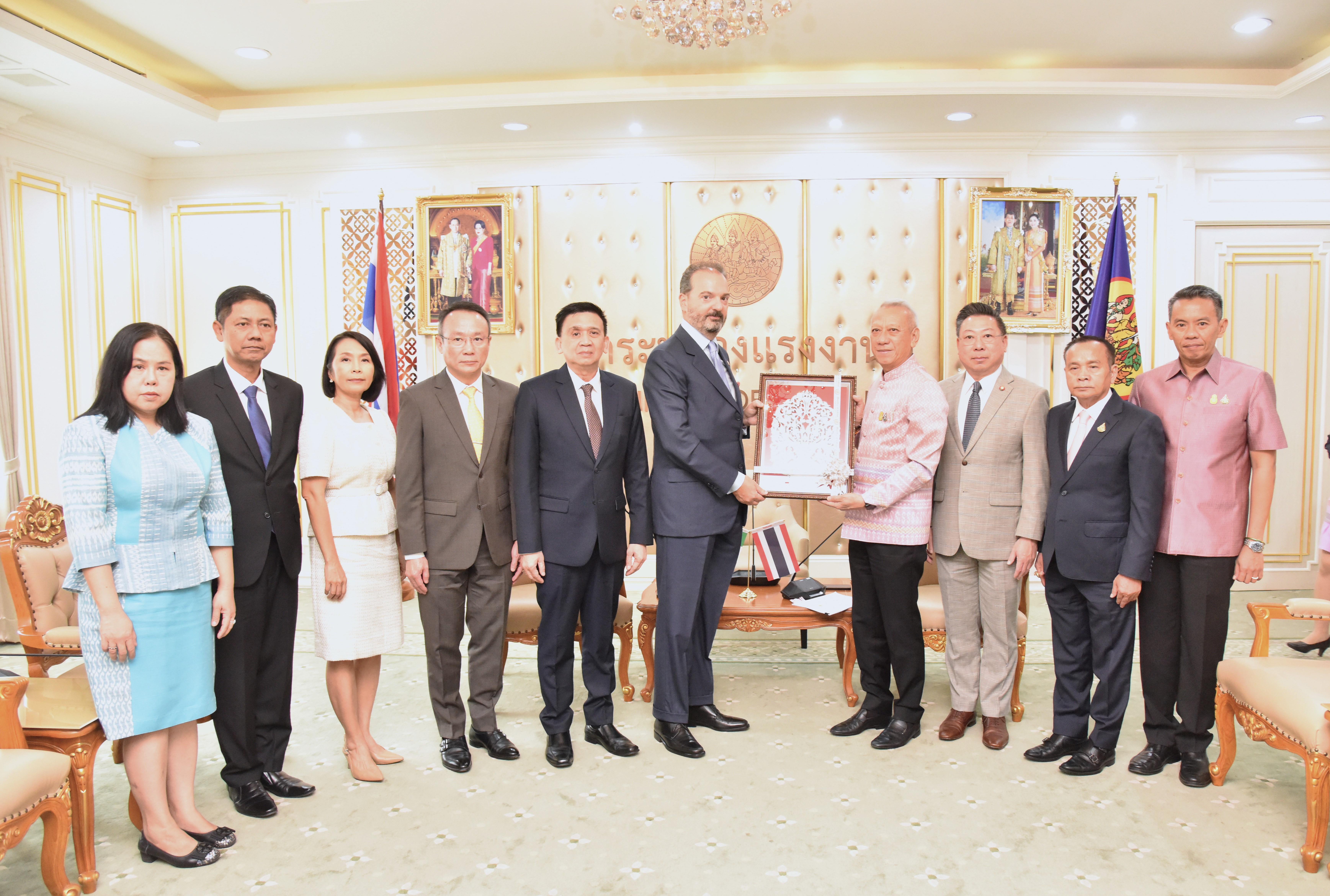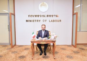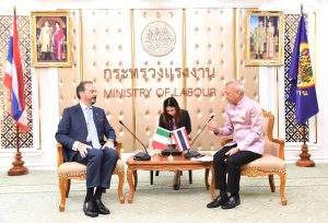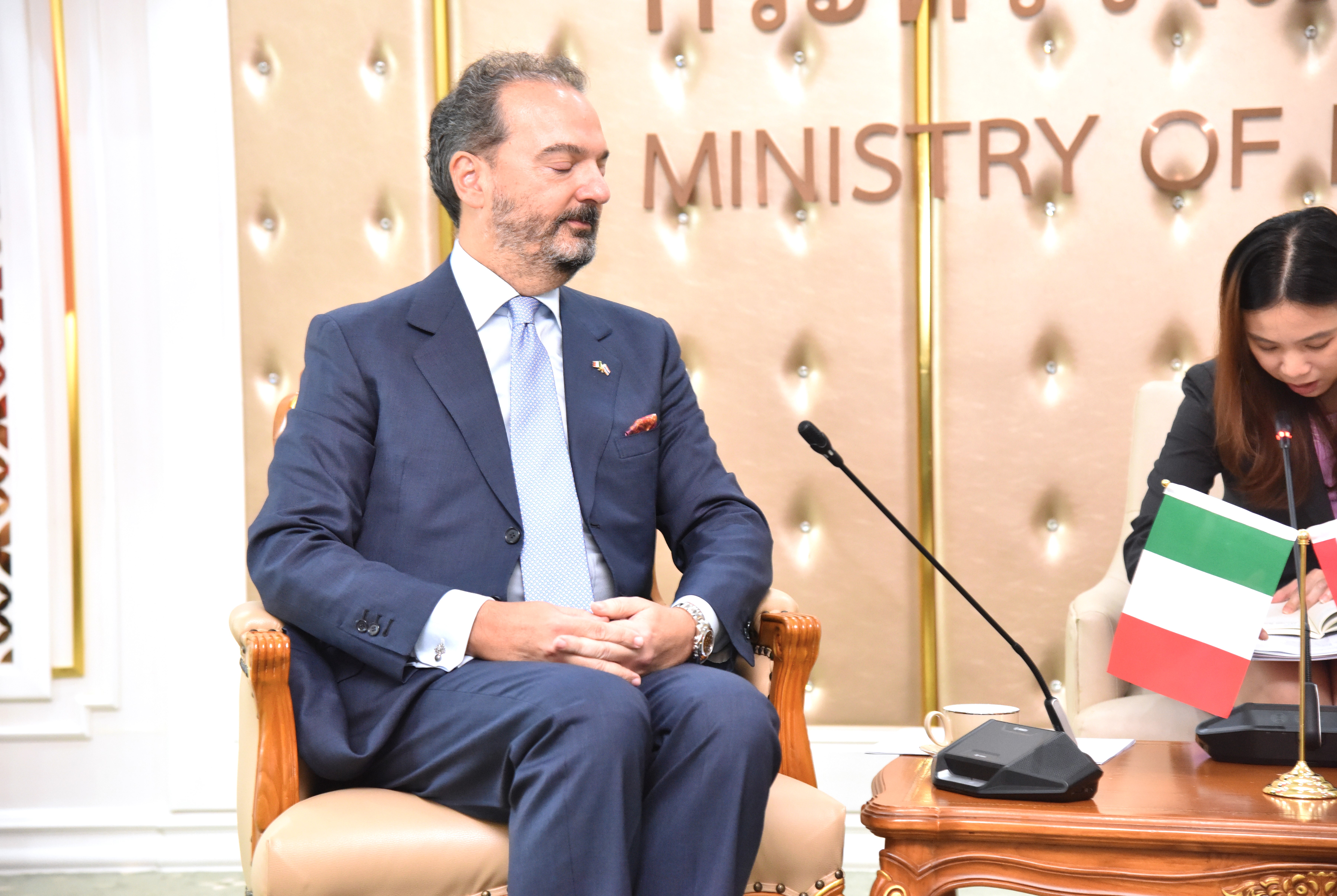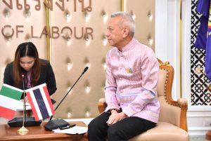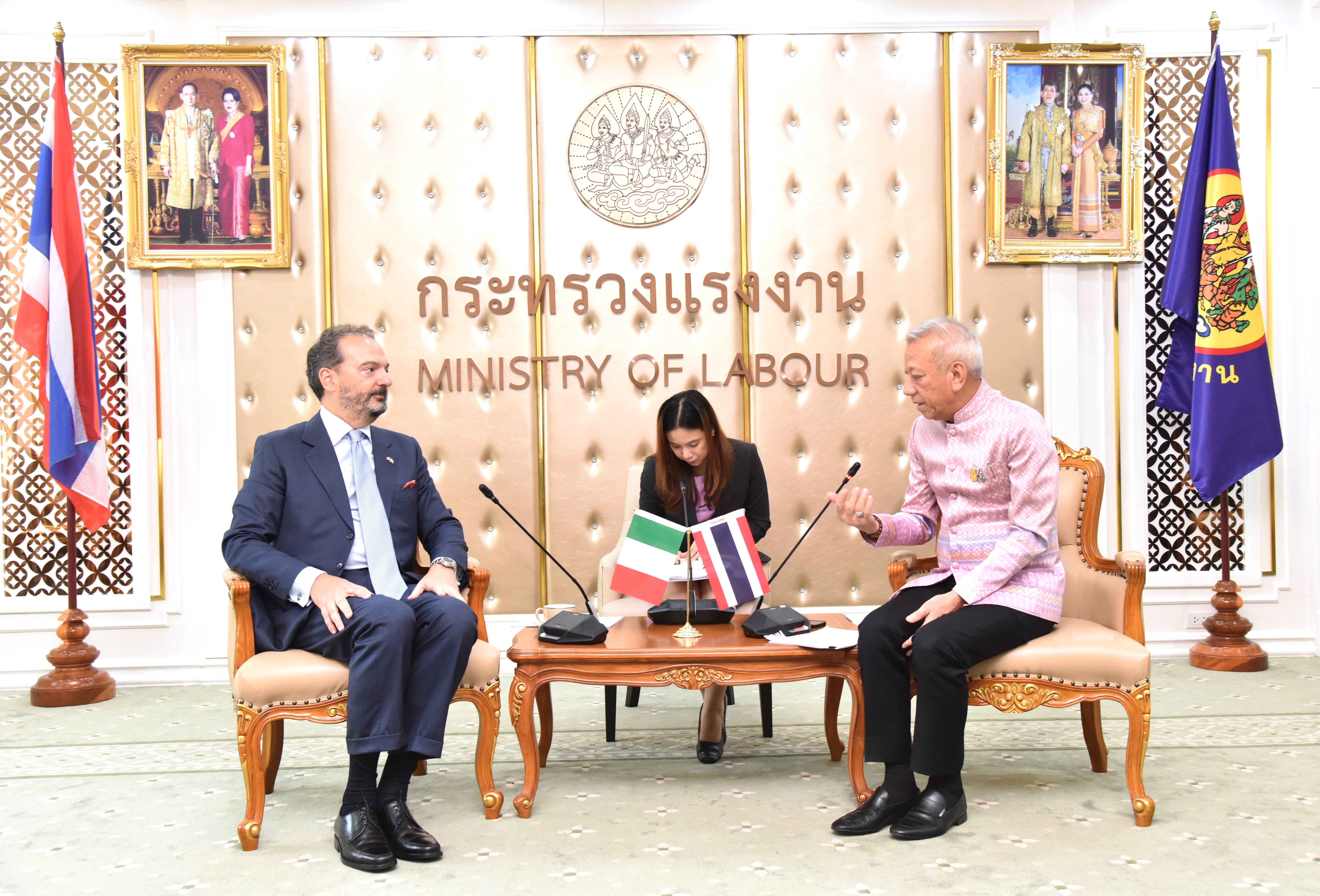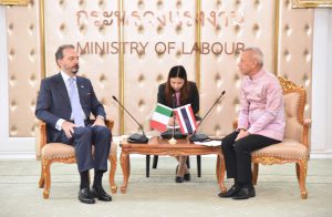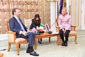 On November 21, 2023, at 13.30 hours, the Labour Minister, Mr. Phiphat Ratchakitprakarn, the Labour Minister’s Advisor, Mr. Thanat Thaweekueakulkit, the Secretariat to the Labour Minister, Mr. Aree Krainara, from the Prime Minister’s Secretariat’s Office, performing duties for the Ministry of Labour, Mr. Phuchong Worasri, the Permanent Secretary of Labour, Mr. Phairoj Chotikasatian, and the Ministry of Labour’s executives, welcomed the Ambassador Extraordinary and Plenipotentiary of Italy to Thailand, Mr. Paolo Dionisi. The occasion took place at the Chatumongkol Room, 6th floor, Ministry of Labour. The meeting was on the occasion of a courtesy call to discuss expanding the Thai labour market in Italy, especially in the agricultural and service sectors.