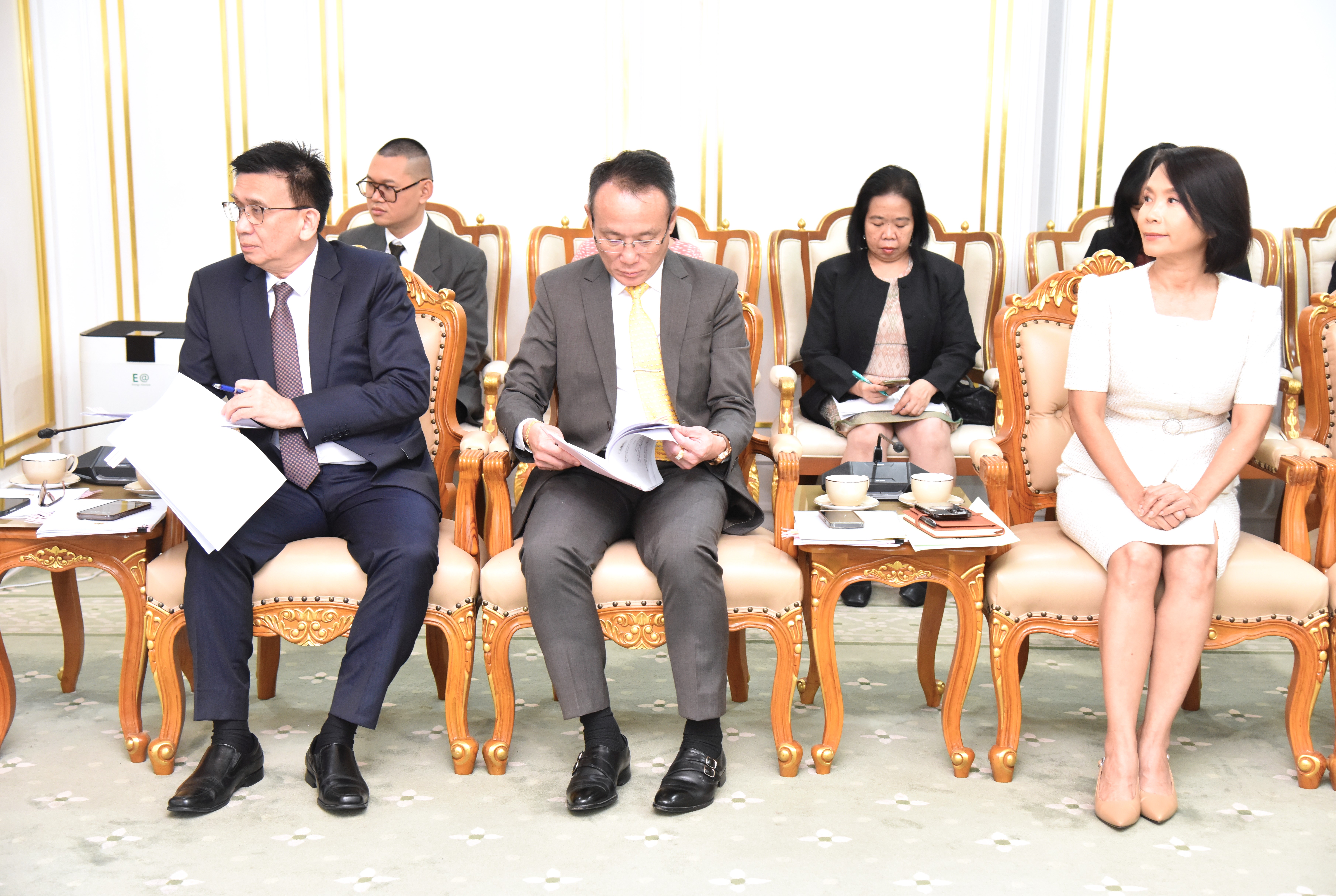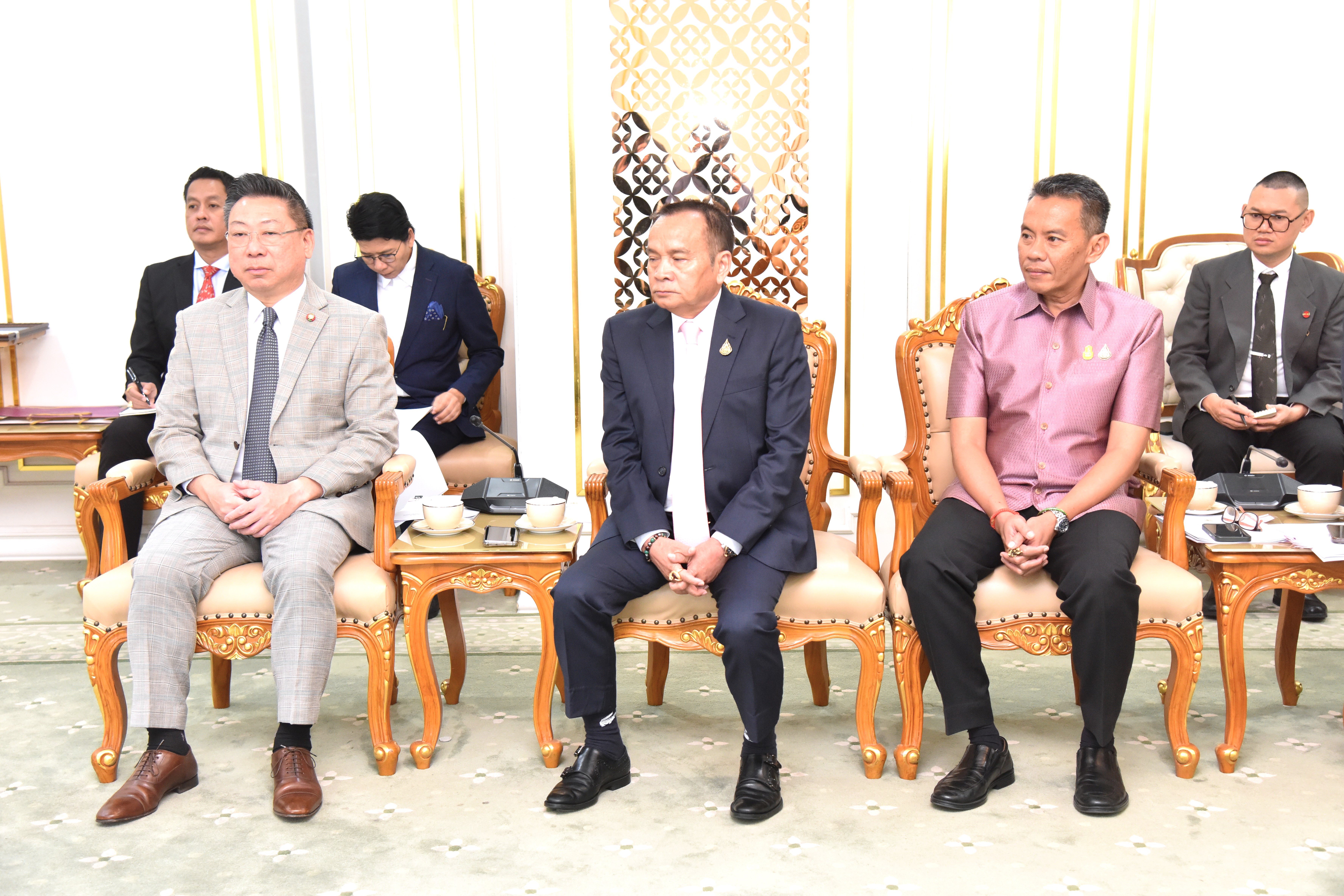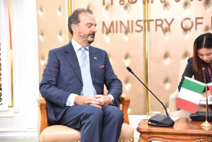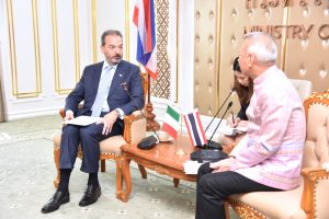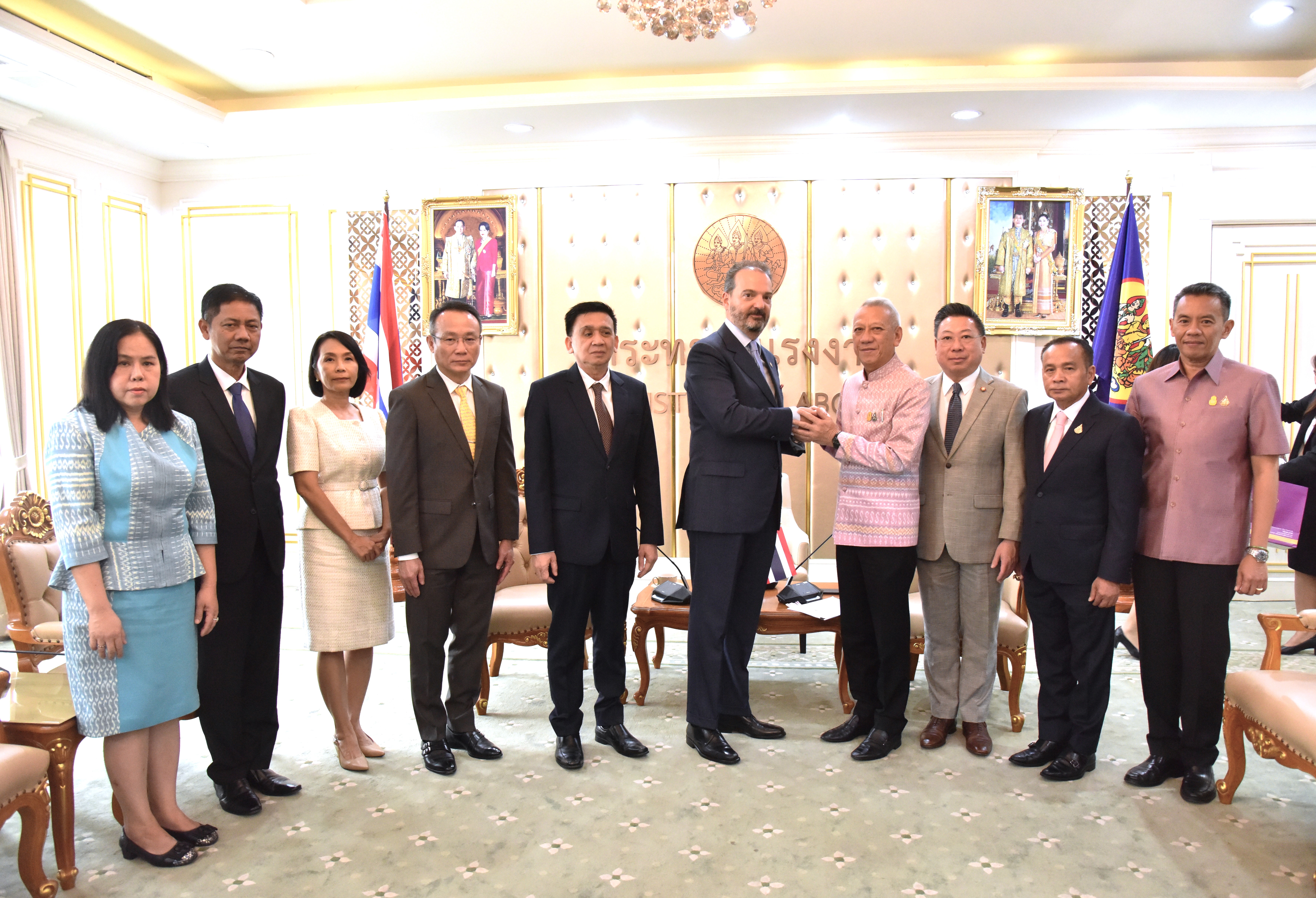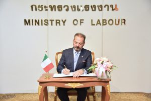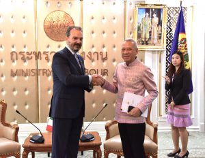 On November 21, 2023, at 13.30 hours, the Labour Minister, Mr. Phiphat Ratchakitprakarn, the Labour Minister’s Advisor, Mr. Thanat Thaweekueakulkit, the Secretariat to the Labour Minister, Mr. Aree Krainara, from the Prime Minister’s Secretariat’s Office, performing duties for the Ministry of Labour, Mr. Phuchong Worasri, the Permanent Secretary of Labour, Mr. Phairoj Chotikasatian, and the Ministry of Labour’s executives, welcomed the Ambassador Extraordinary and Plenipotentiary of Italy to Thailand, Mr. Paolo Dionisi. The occasion took place at the Chatumongkol Room, 6th floor, Ministry of Labour. The meeting was on the occasion of a courtesy call to discuss expanding the Thai labour market in Italy, especially in the agricultural and service sectors.
