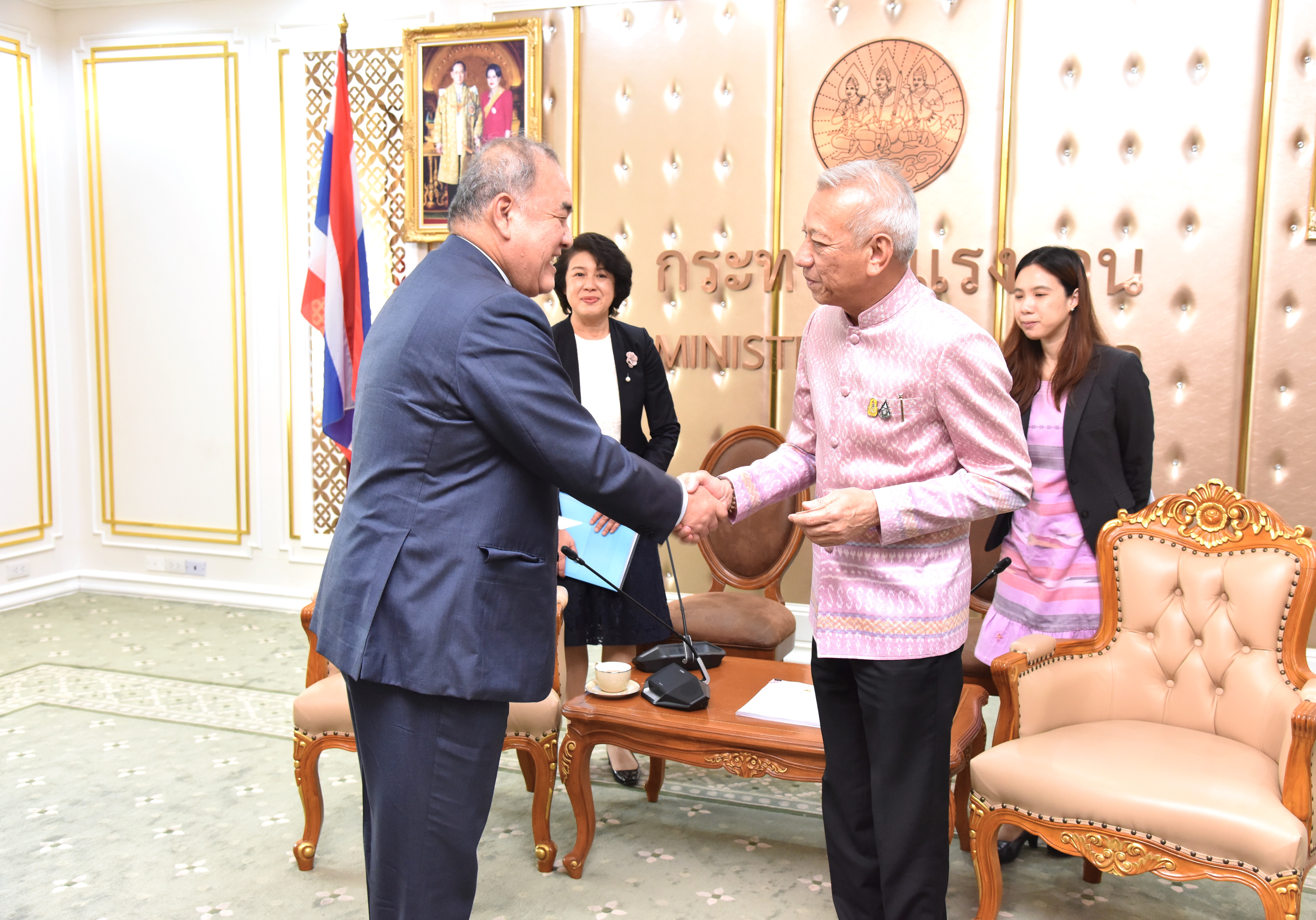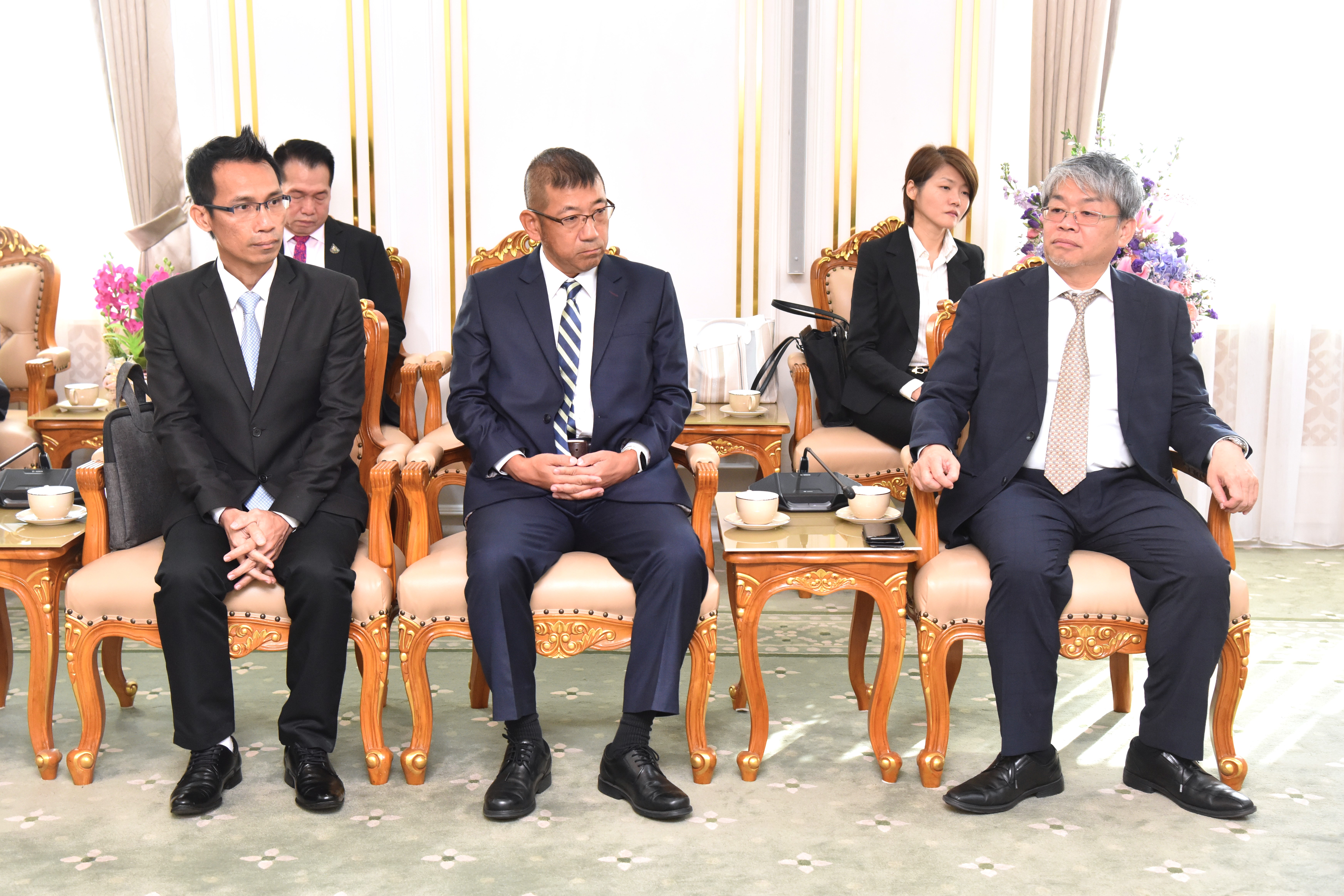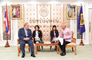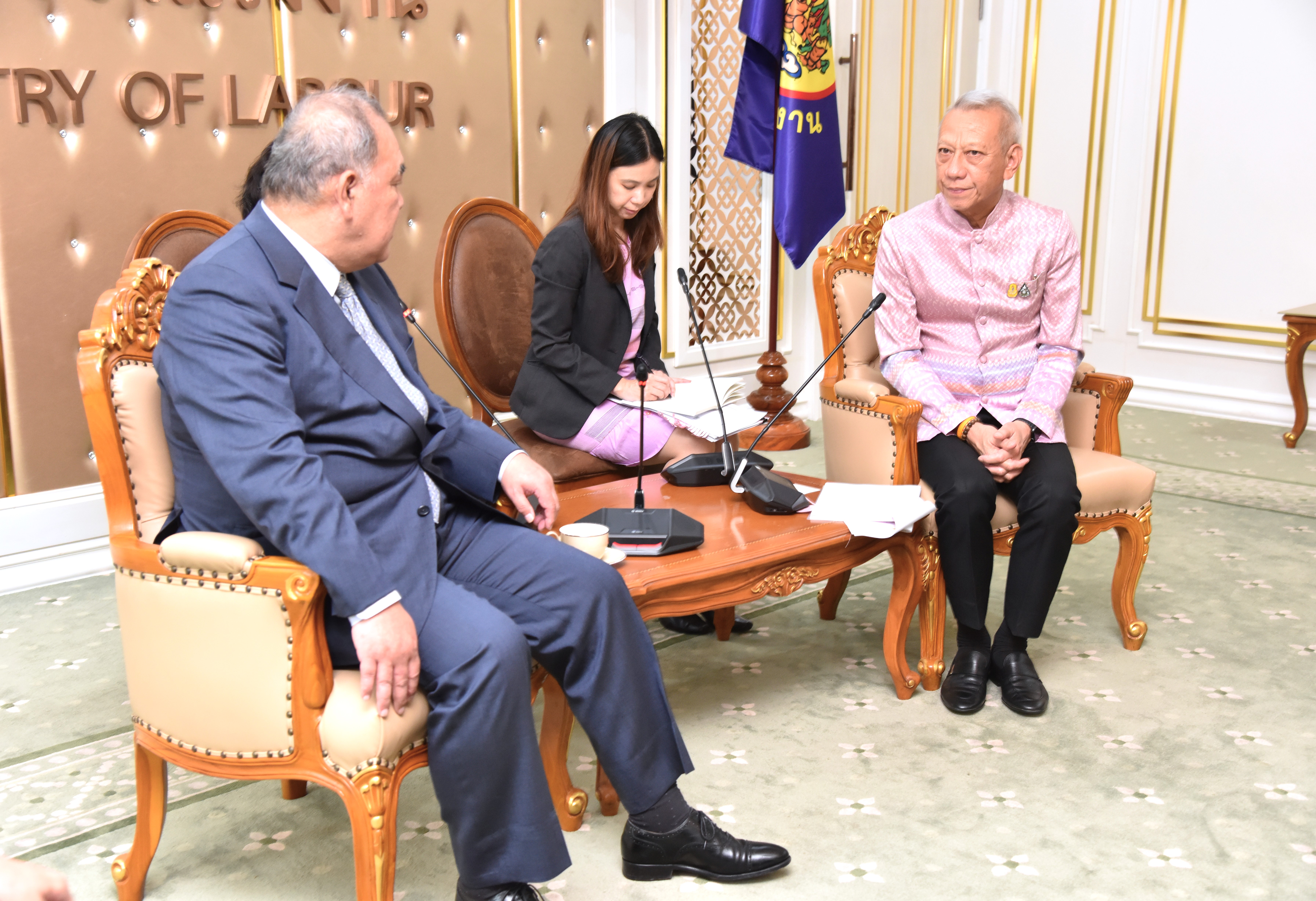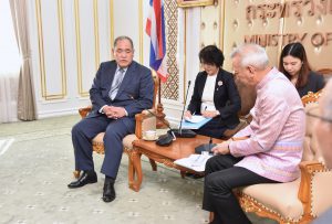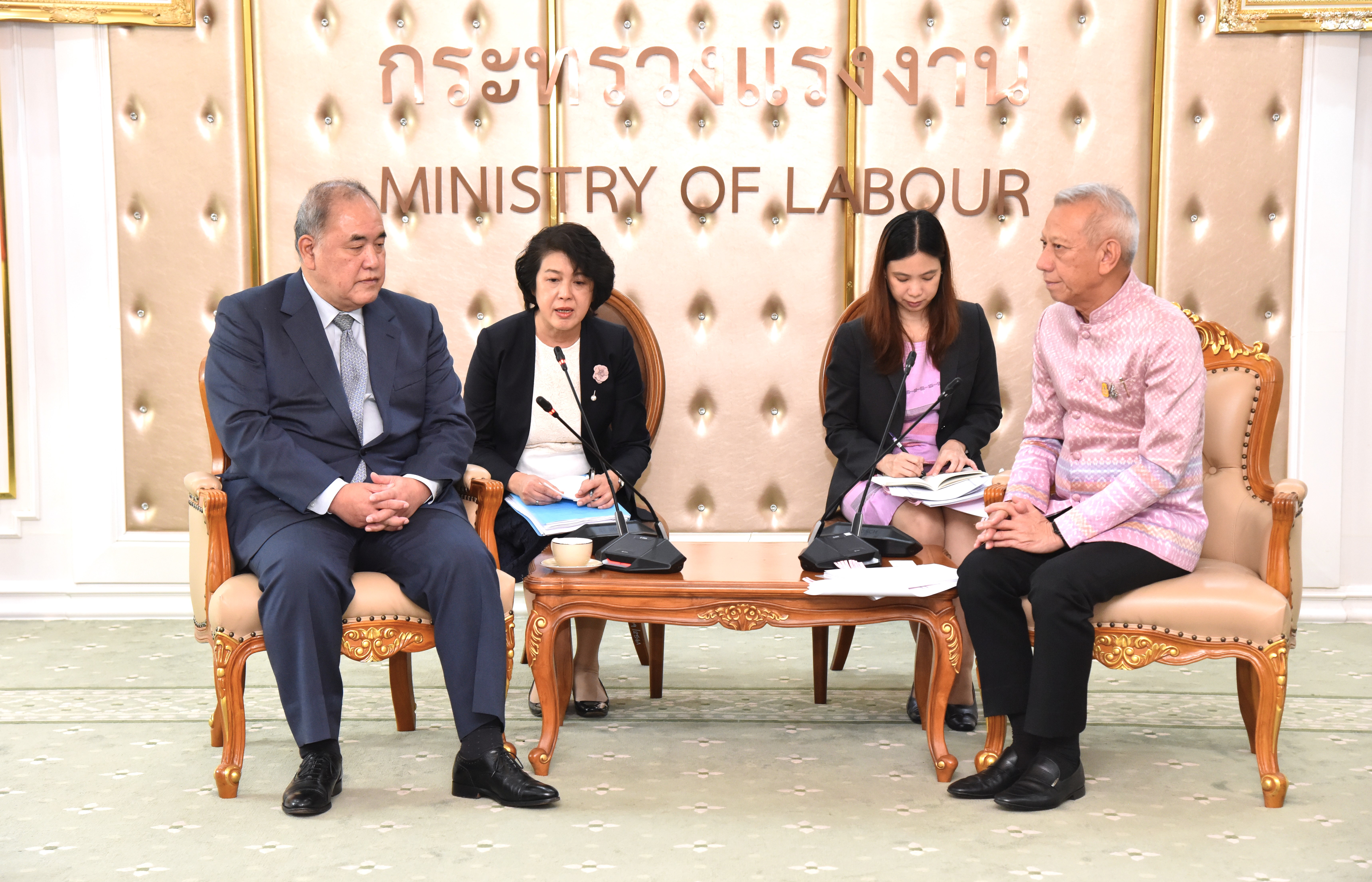 On November 21, 2023, at 15.00 hours, the Labour Minister, Mr. Phiphat Ratchakitprakarn, the Assistant to the Labour Minister, Mr. Siraphop Duangsodsri, the Labour Minister’s Advisor, Mr. Thanat Thaweekueakulkit, the Secretariat to the Labour Minister, Mr. Aree Krainara, from the Prime Minister’s Secretariat’s Office, performing duties for the Ministry of Labour, Mr. Phuchong Worasri, the Permanent Secretary of Labour, Mr. P้airoj Chotik้asatian, and the Ministry of Labour’s senior executives, joined in welcoming the President of IM Japan, on the occasion of a courtesy call and to discuss signing a Memorandum of Understanding to recruit Thai workers to work as skilled workers in Japan and a study tour and training before traveling to be a technical intern at the Skill Development Institute 14 in Pathum Thani. They also introduced three graduates of the IM Japan internship. The occasion took place at the Chatumongkol Room, 6th floor, Ministry of Labour.