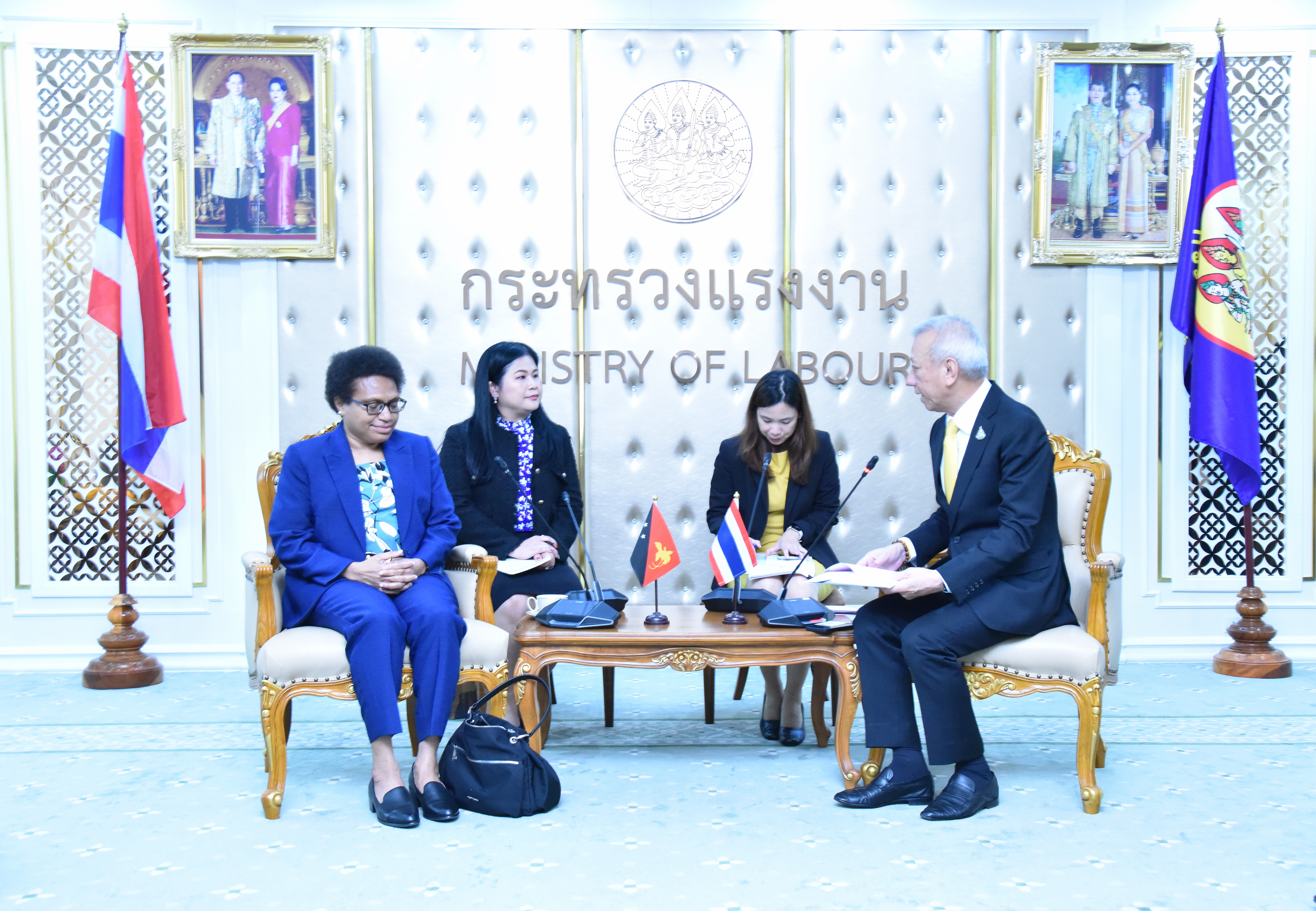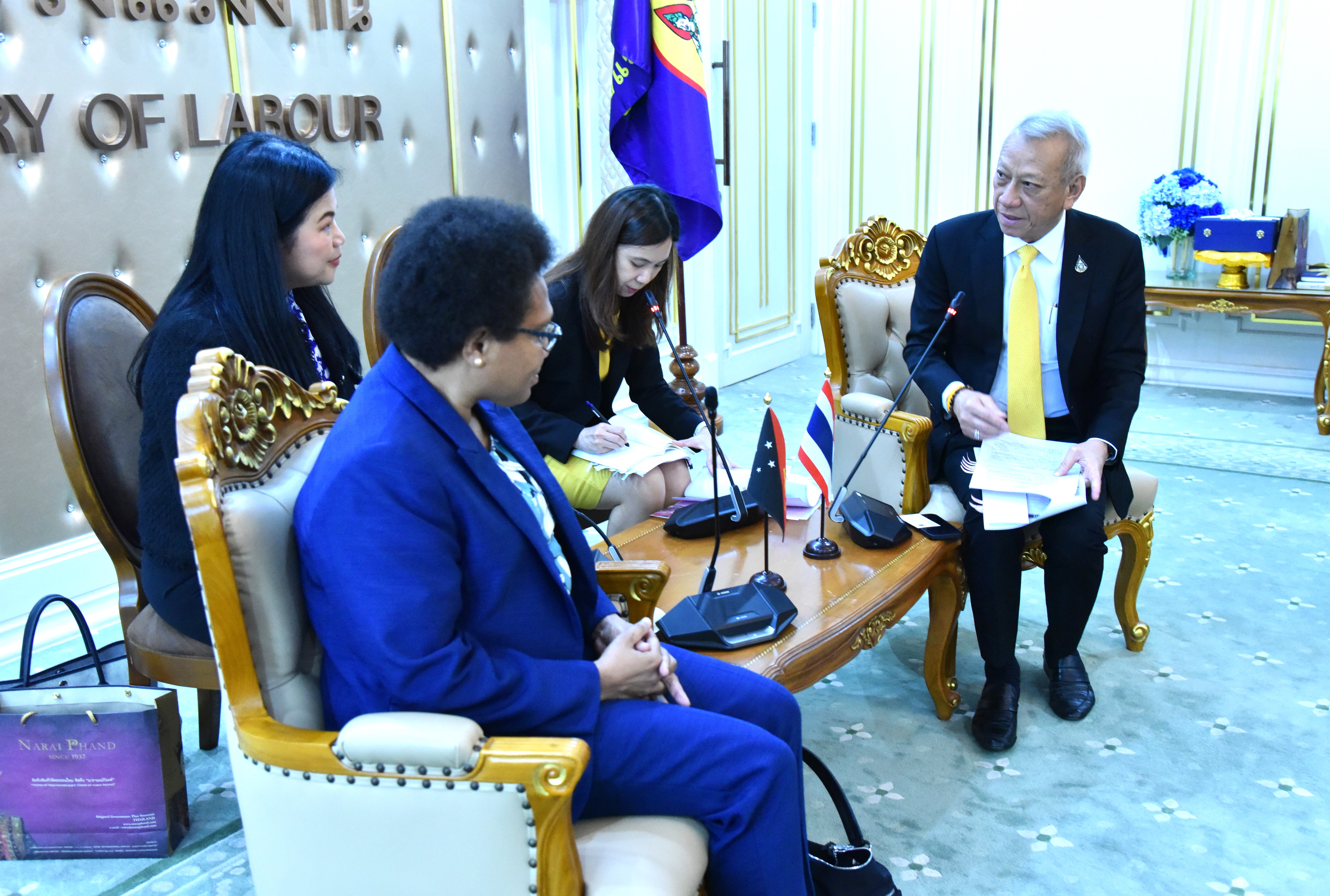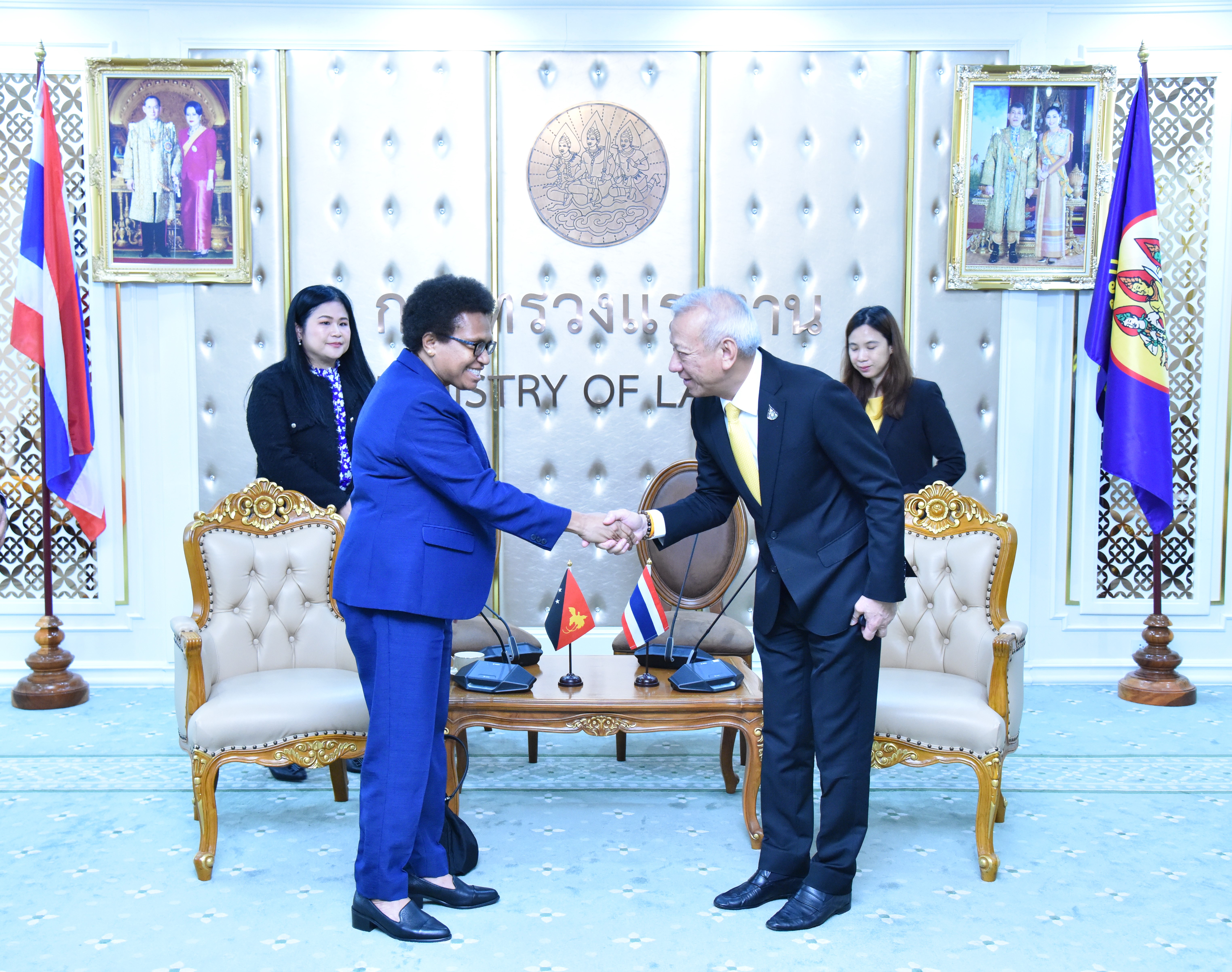 On September 25, 2023, the Labour Minister, Mr. Phiphat Ratchakitprakarn, welcomed Papua New Guinea’s Minister for Labour and Employment, H.E. Ms. Kessy Sawang, and delegation, on paying a courtesy call to the Labour Minister after taking office, and to discuss enhancing labour cooperation. Assistant to the Labour Minister, Mr. Siraphop Duangsodsri, from the Prime Minister’s Secretariat’s Office, performing duties for the Ministry of Labour, Mr. Phuchong Worasri, Secretariat to the Labour Minister, Mr. Aree Krainara, the Department of Employment’s Director-General, Mr. Pairoj Chotiksetian, and the Ministry of Labour’s executives, joined the occasion at the Chatumongkol meeting room, 6th floor, Ministry of Labour.