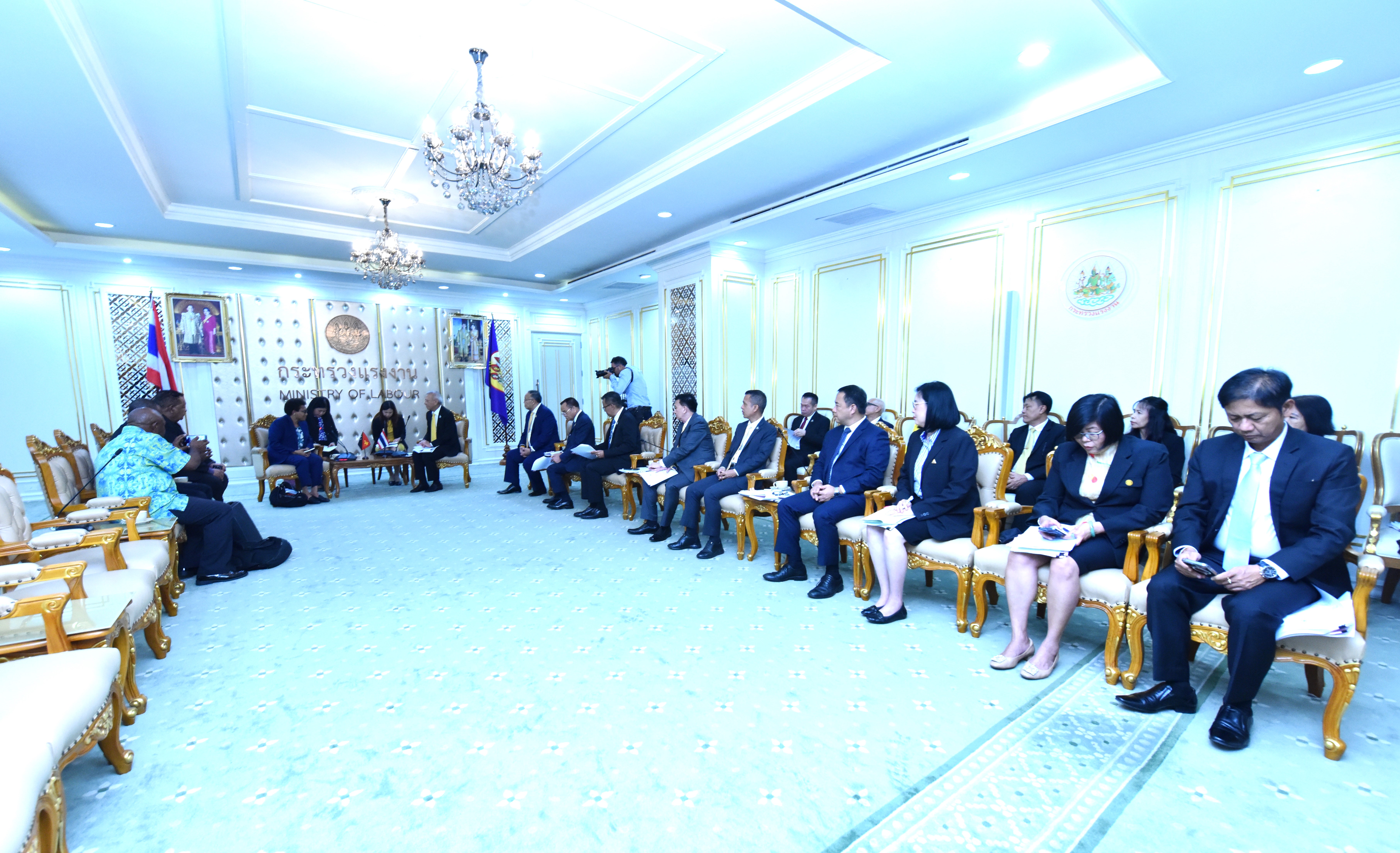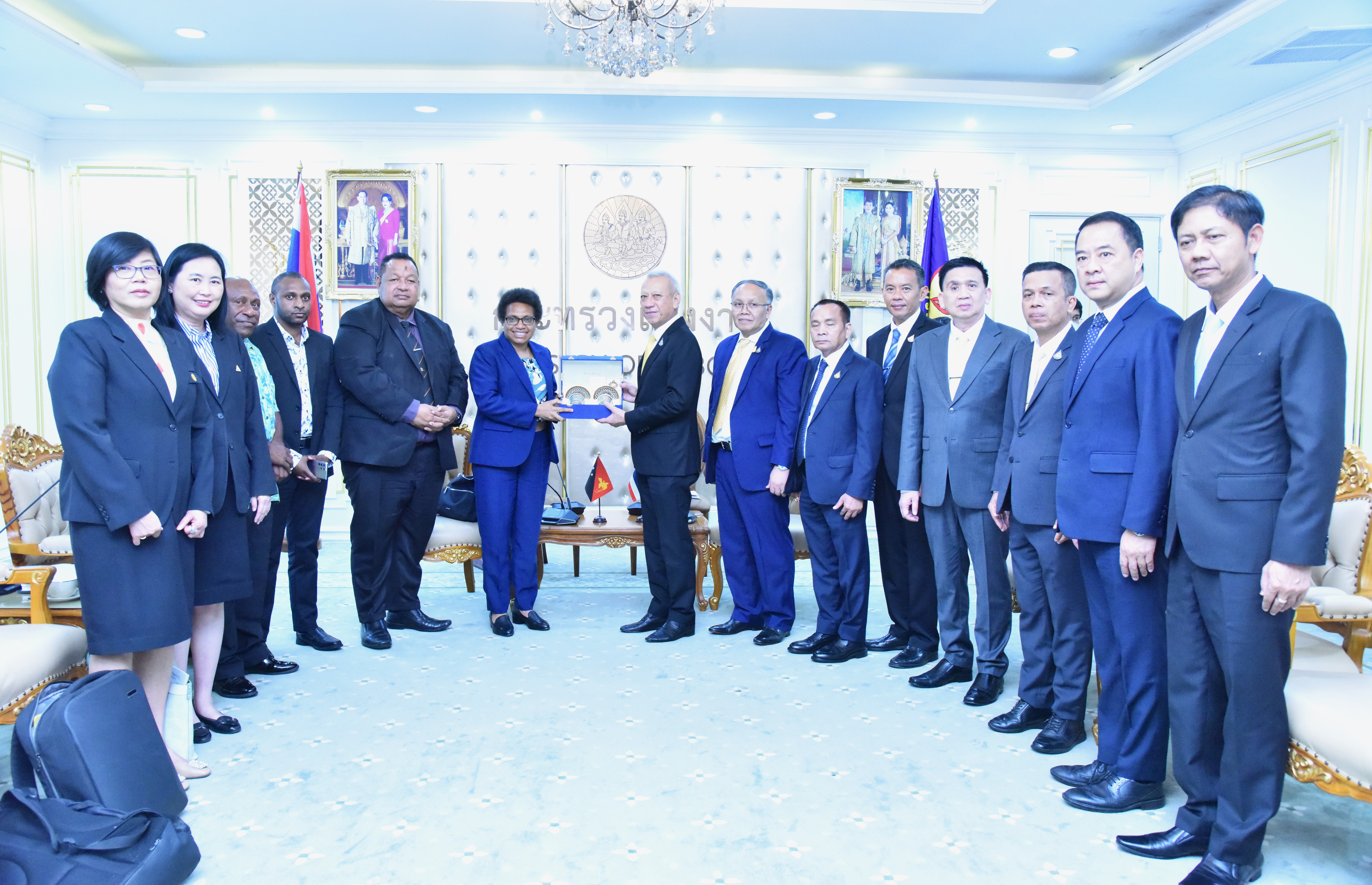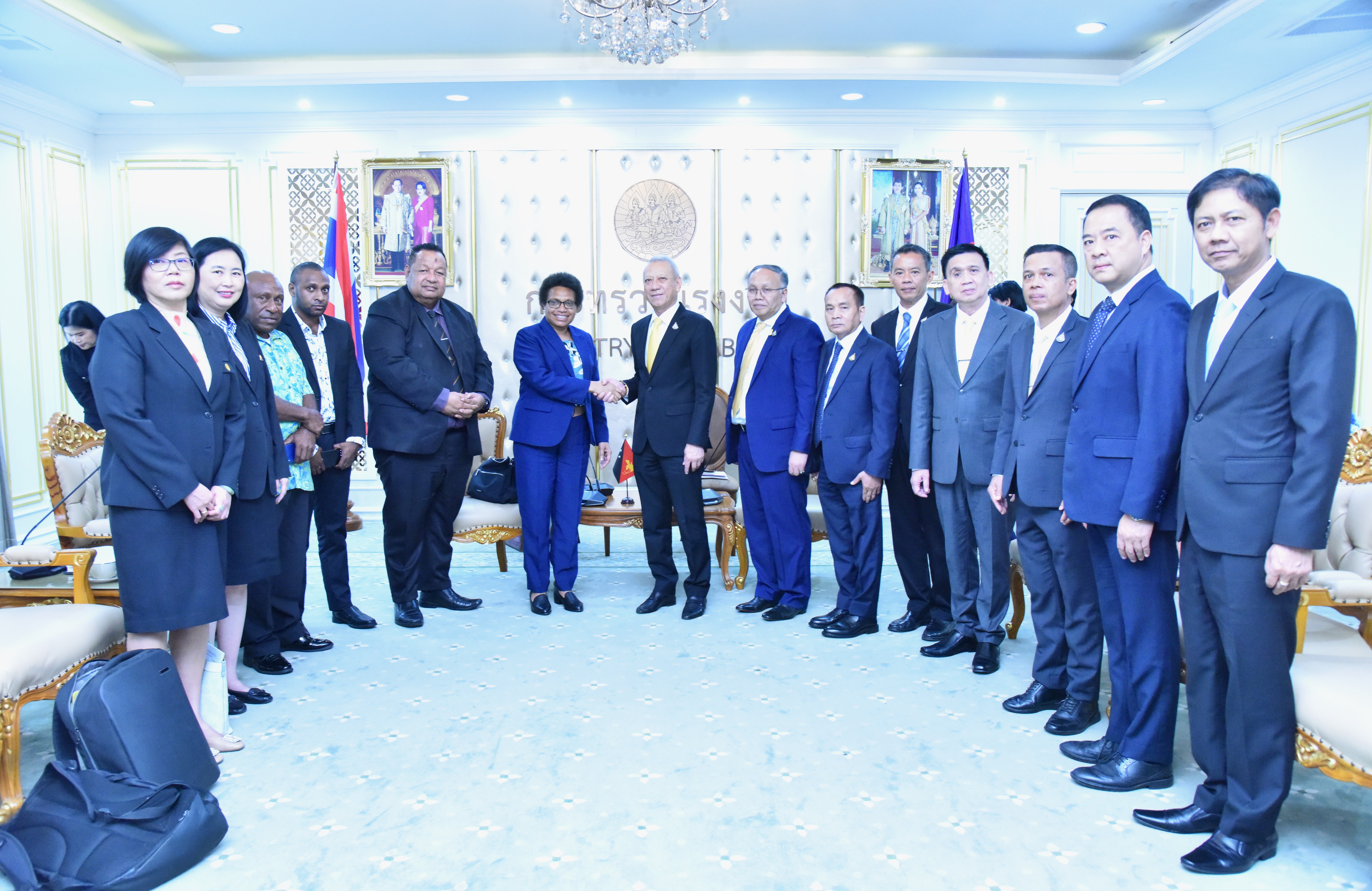 On September 25, 2023, the Labour Minister, Mr. Phiphat Ratchakitprakarn, welcomed Papua New Guinea’s Minister for Labour and Employment, H.E. Ms. Kessy Sawang, and delegation, on paying a courtesy call to the Labour Minister after taking office, and to discuss enhancing labour cooperation. Assistant to the Labour Minister, Mr. Siraphop Duangsodsri, from the Prime Minister’s Secretariat’s Office, performing duties for the Ministry of Labour, Mr. Phuchong Worasri, Secretariat to the Labour Minister, Mr. Aree Krainara, the Department of Employment’s Director-General, Mr. Pairoj Chotiksetian, and the Ministry of Labour’s executives, joined the occasion at the Chatumongkol meeting room, 6th floor, Ministry of Labour.