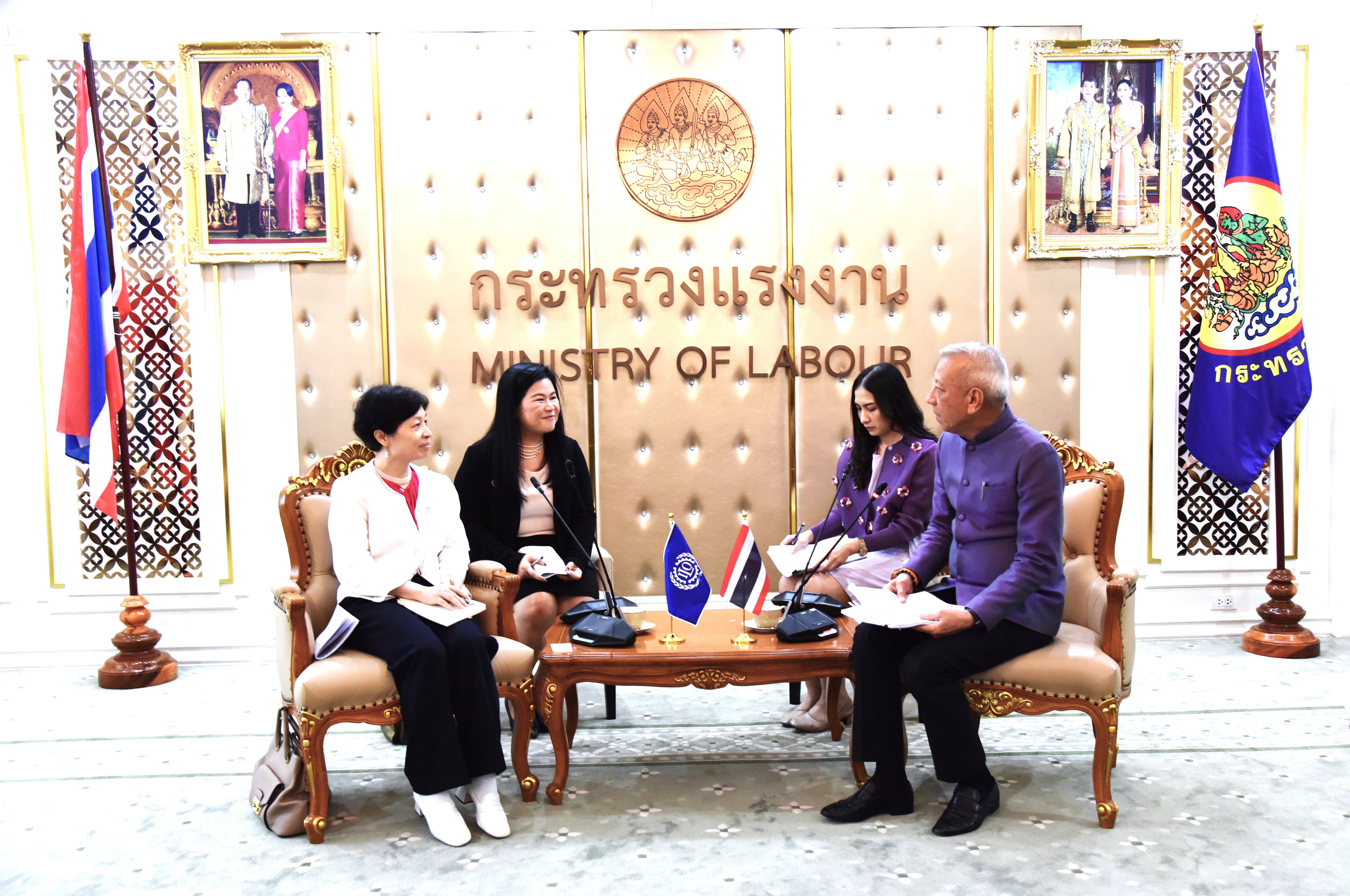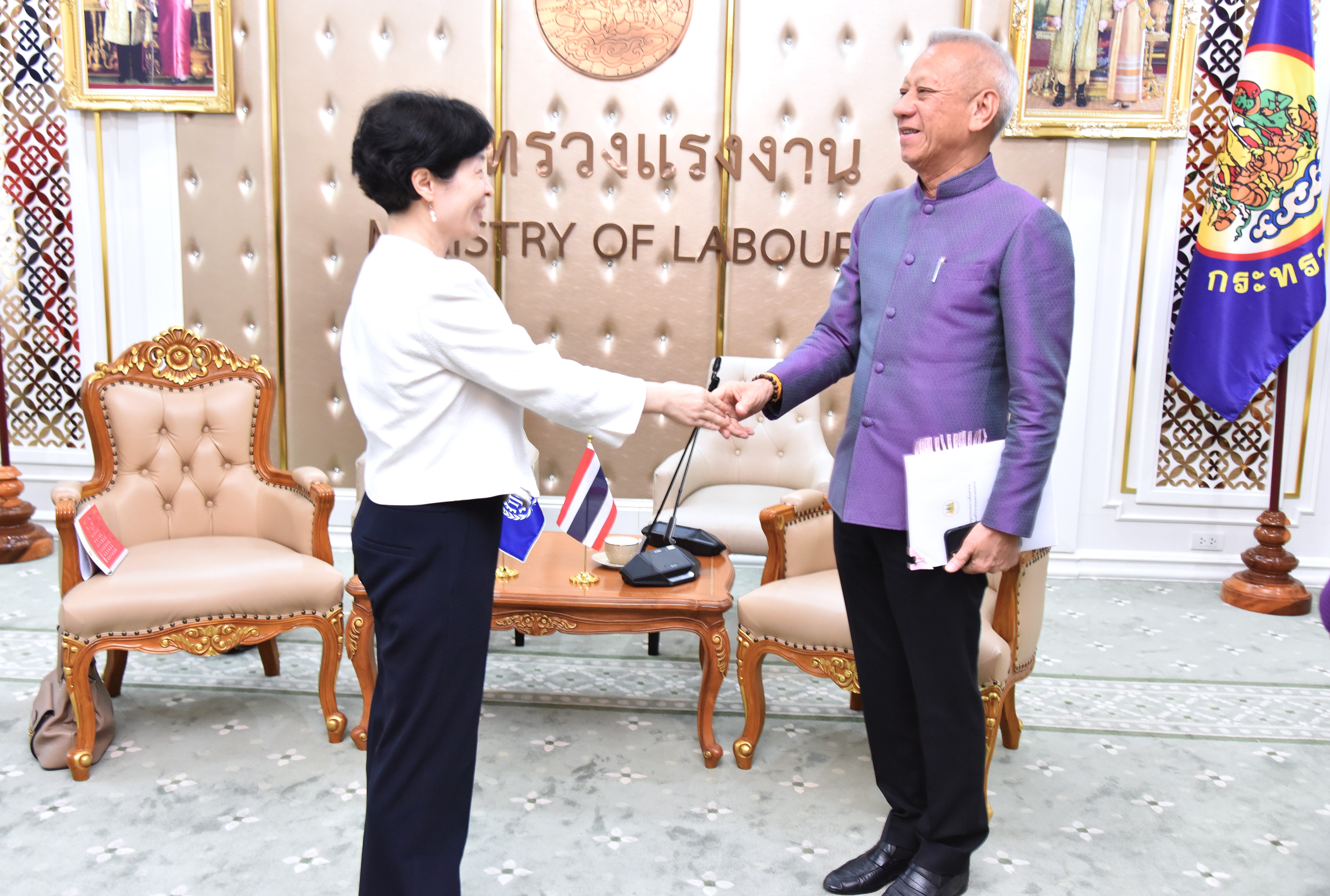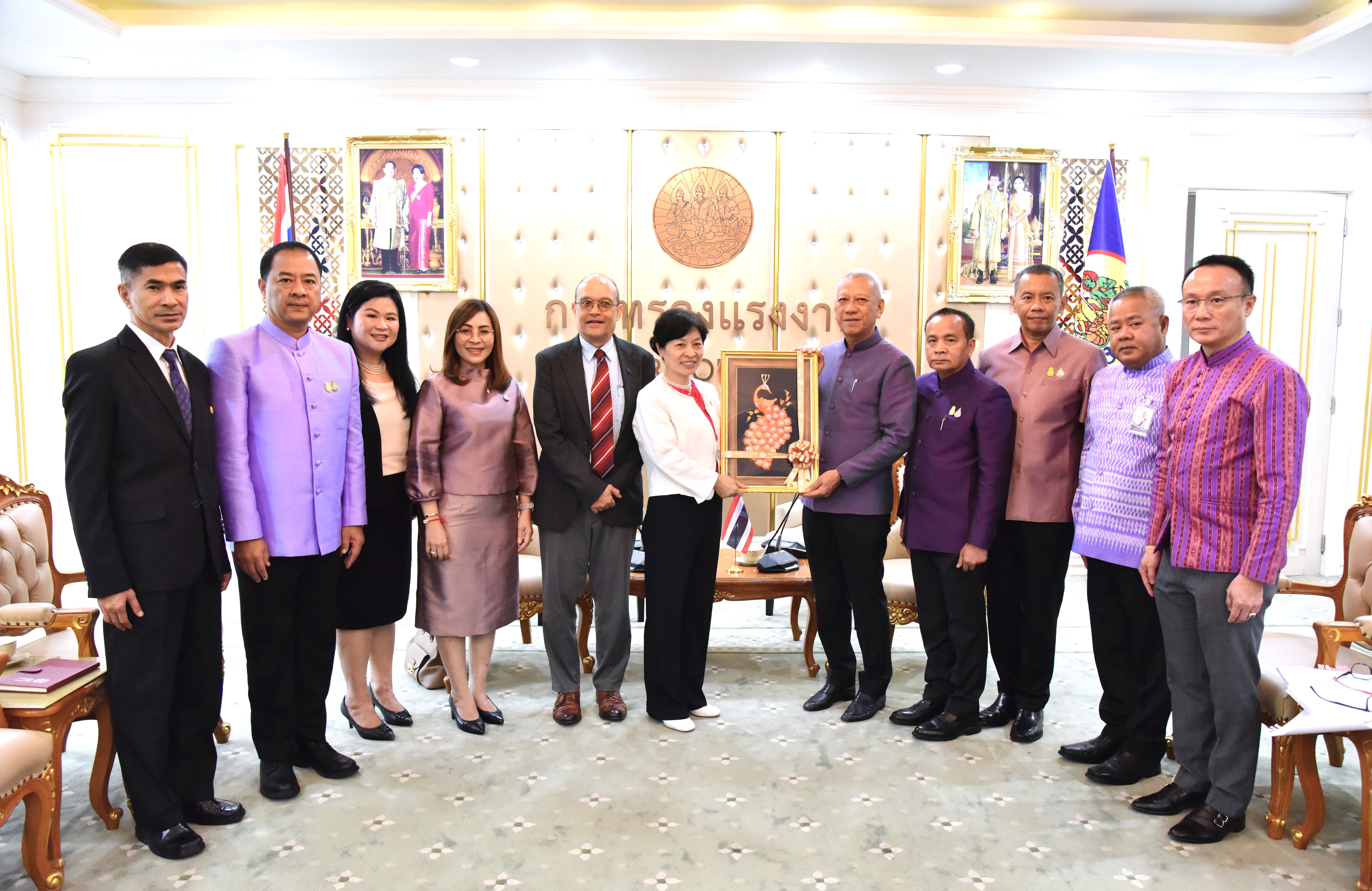 On April 2, 2024, at 13.30 hours, the Labour Minister, Mr. Phiphat Ratchakitprakarn, welcomed the Director of the International Labour Office for Thailand, Cambodia, and Laos, Ms. Xiaoyan Qian, and the delegation on the occasion of her taking up the position. They also discussed cooperation in labour and society, as well as mutual benefits between the Ministry of Labour and the International Labour Office For Thailand, Cambodia and Laos. The Secretariat to the Labour Minister, Mr. Aree Krainara, from the Prime Minister’s Secretariat’s Office, performing duties for the Ministry of Labour, Mr. Phuchong Worasri, the Ministry of Labour’s Inspector-General, Mr. Samat Pattamasukon, and the Ministry of Labour’s executives also joined the welcoming at the Chatumongkol Room, 6th floor, Ministry of Labour.
