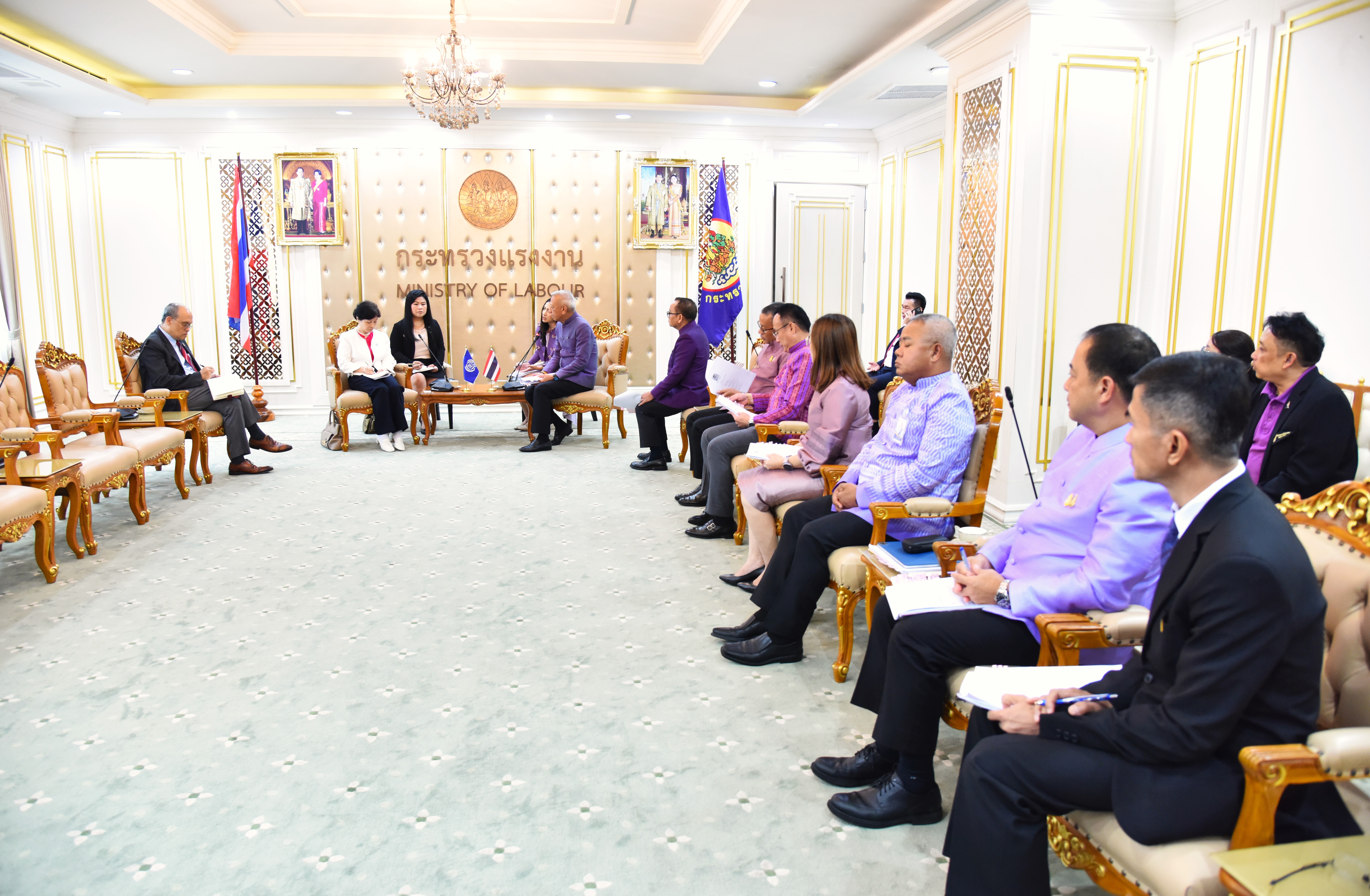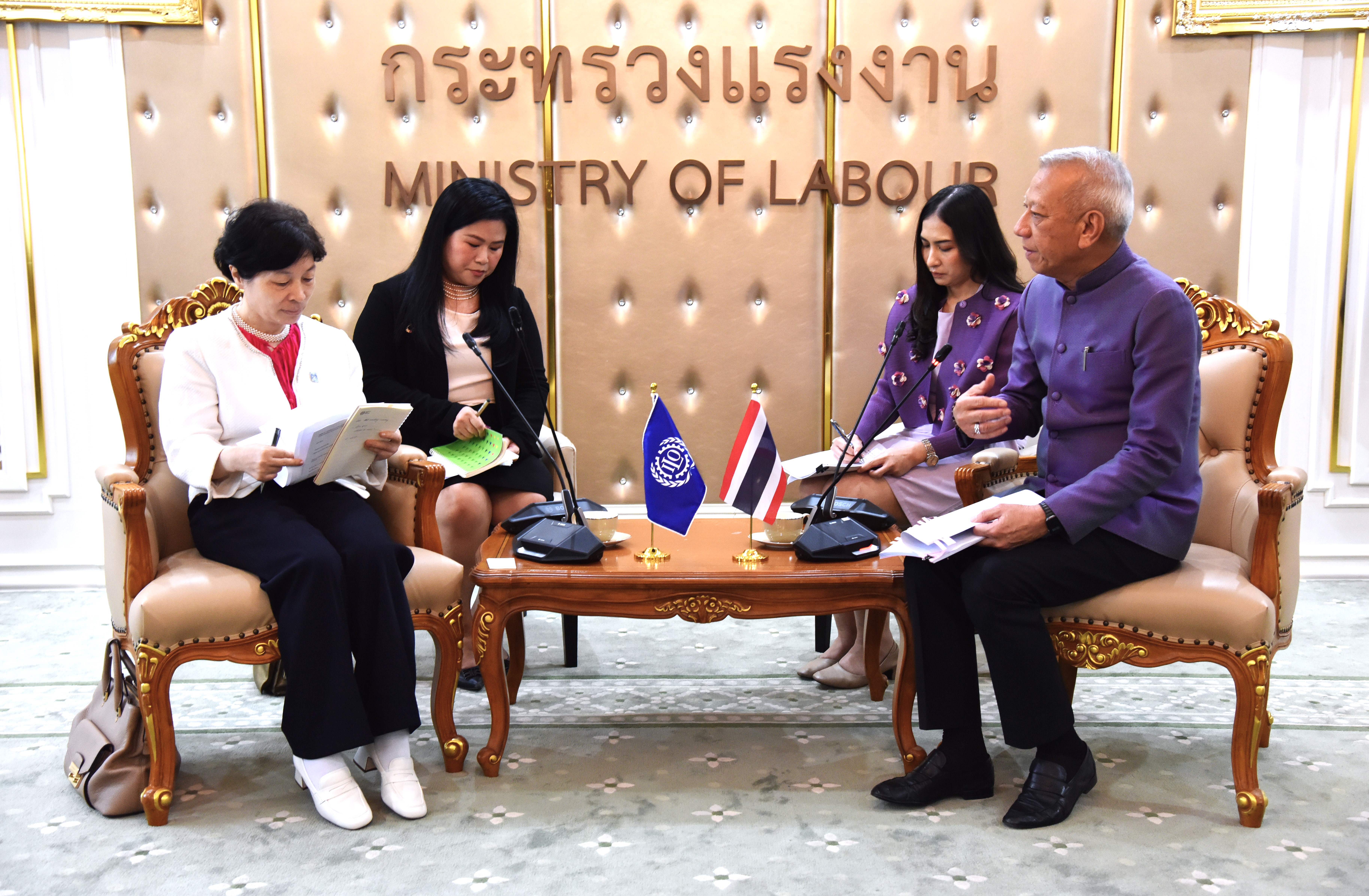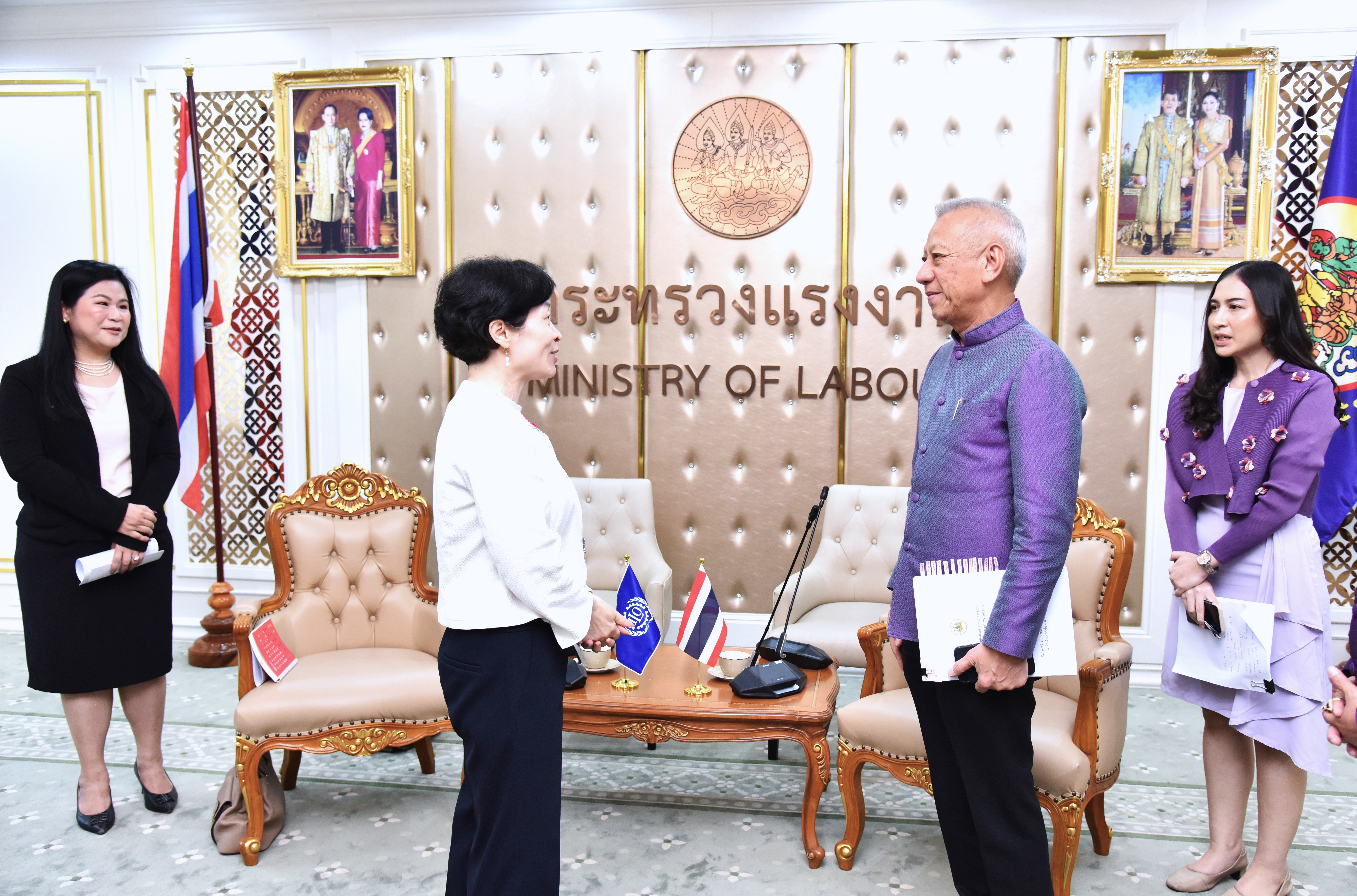 On April 2, 2024, at 13.30 hours, the Labour Minister, Mr. Phiphat Ratchakitprakarn, welcomed the Director of the International Labour Office for Thailand, Cambodia, and Laos, Ms. Xiaoyan Qian, and the delegation on the occasion of her taking up the position. They also discussed cooperation in labour and society, as well as mutual benefits between the Ministry of Labour and the International Labour Office For Thailand, Cambodia and Laos. The Secretariat to the Labour Minister, Mr. Aree Krainara, from the Prime Minister’s Secretariat’s Office, performing duties for the Ministry of Labour, Mr. Phuchong Worasri, the Ministry of Labour’s Inspector-General, Mr. Samat Pattamasukon, and the Ministry of Labour’s executives also joined the welcoming at the Chatumongkol Room, 6th floor, Ministry of Labour.