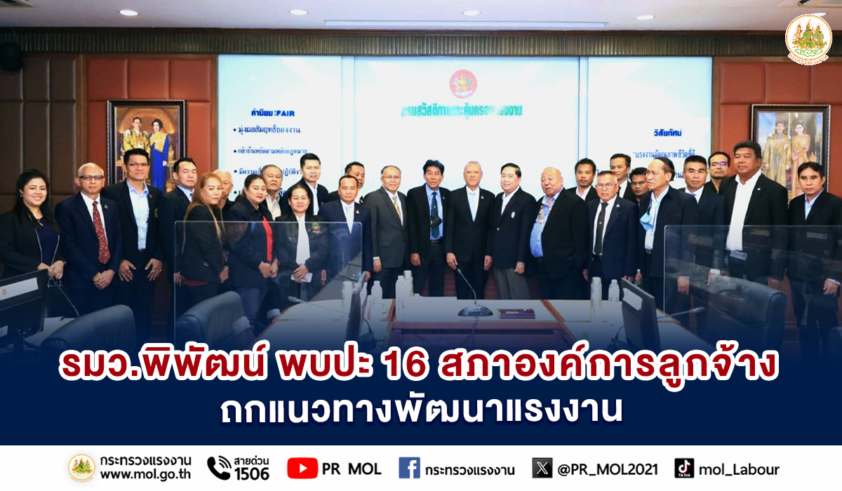 วันที่ 8 กันยายน 2566 นายพิพัฒน์ รัชกิจประการ รัฐมนตรีว่าการกระทรวงแรงงาน เป็นประธานการประชุมเพื่อนำเสนอแนวทางการพัฒนาด้านแรงงานกลุ่มสภาองค์การลูกจ้างต่อรัฐมนตรีว่าการกระทรวงแรงงาน โดยมี นายบุญชอบ สุทธมนัสวงษ์ ปลัดกระทรวงแรงงาน ผู้บริหารระดับสูงกระทรวงแรงงาน พร้อมด้วย ประธานสภาองค์การลูกจ้าง 16 สภา และประธานสหภาพแรงงาน 8 สหภาพ เข้าร่วมด้วย ณ ห้องประชุม ศ.นิคม จันทรวิทุร ชั้น 5 อาคารกระทรวงแรงงาน
