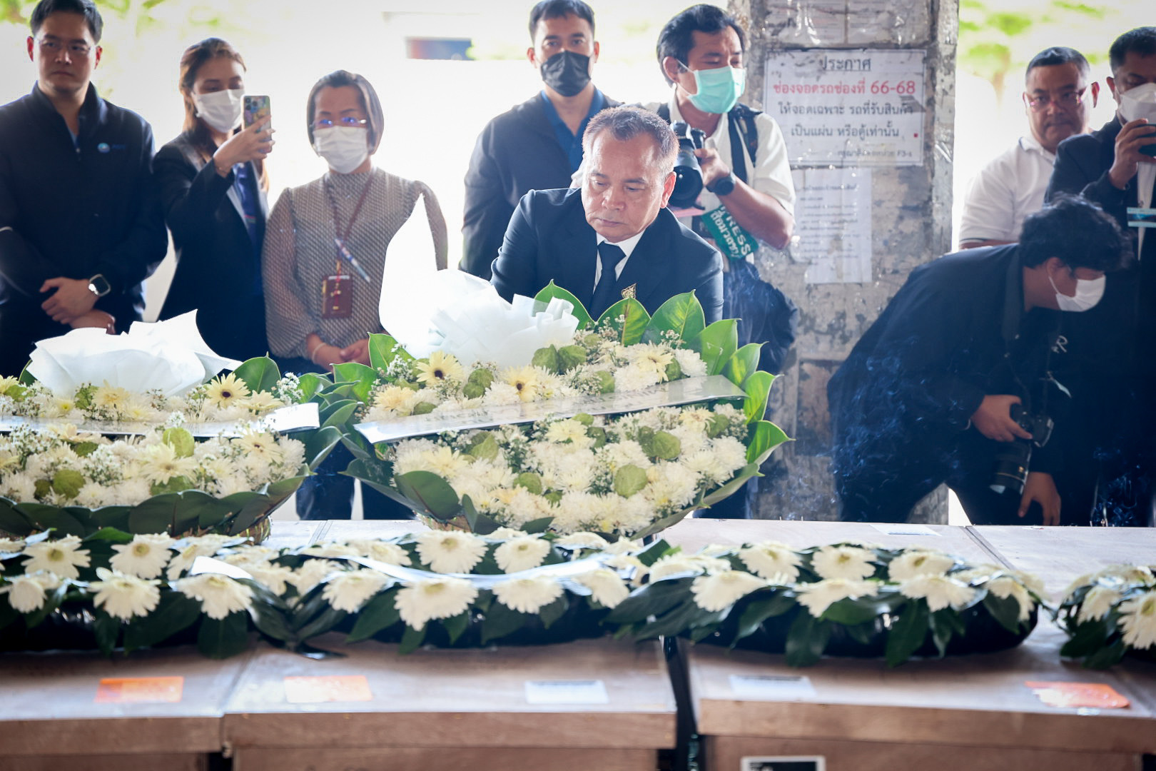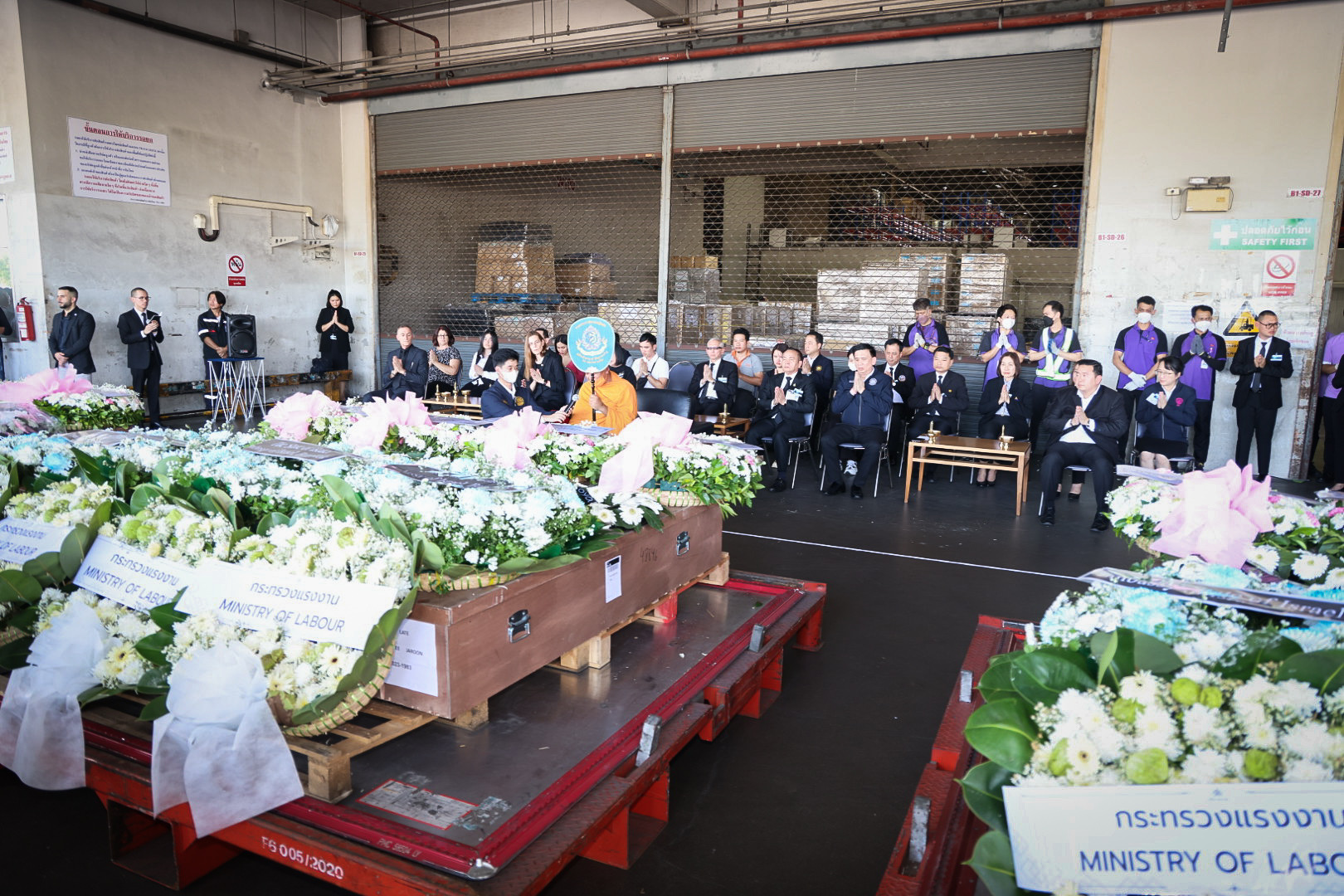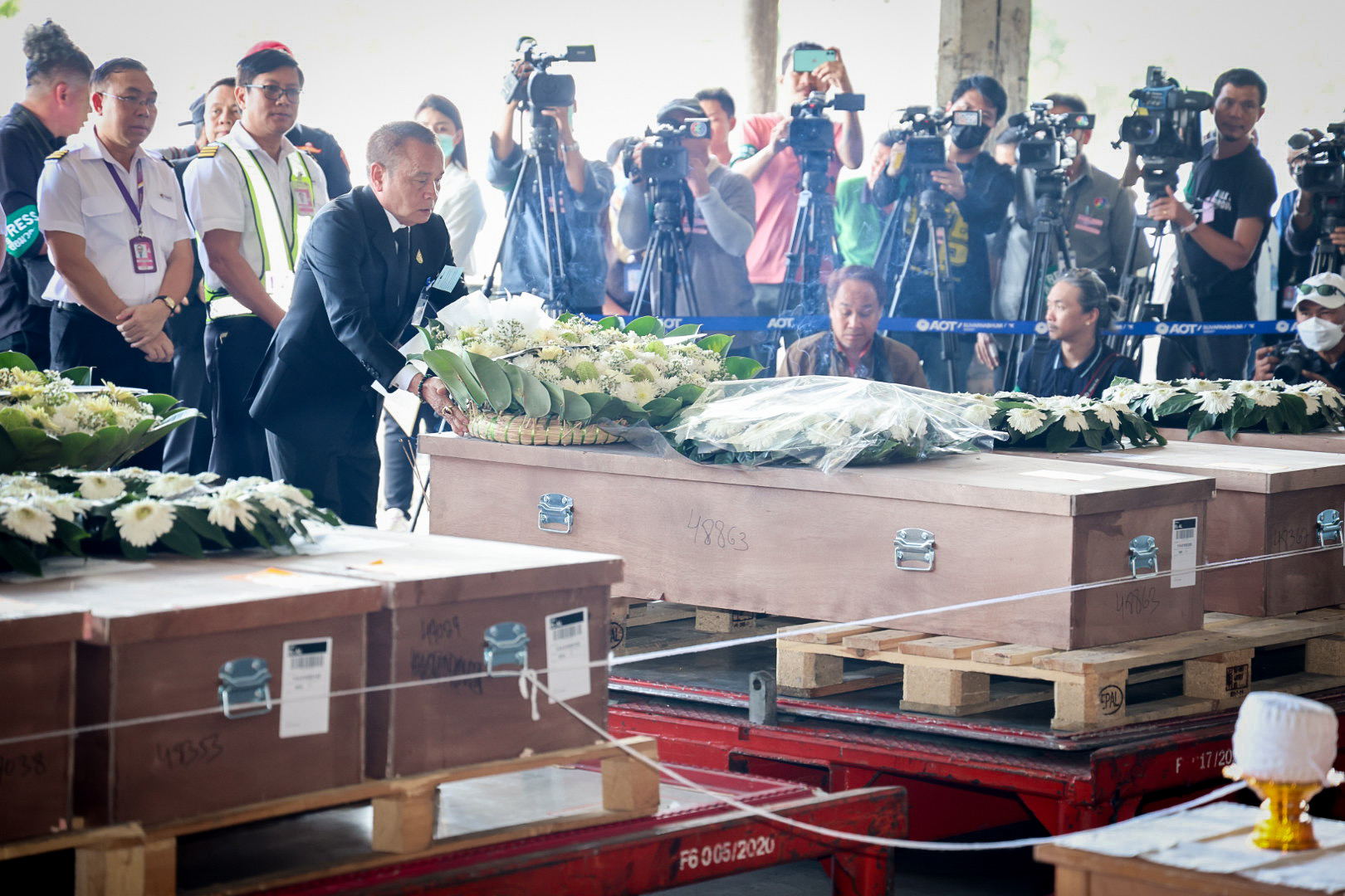 On November 1, 2023, at 12.40 hours, the Labour Minister, Mr. Phiphat Ratchakitprakarn, assigned the Secretariat to the Labour Minister, Mr. Aree Krainara, and the Permanent Secretary of Labour, Mr. P้airoj Chotikasatian, to represent the Ministry of Labour in receiving the bodies of eleven Thai workers who died from the unrest in Israel, laying wreaths to express their condolences. The Director of the Nationality and Legal Affairs Division, Department of Consular Affairs, Ms. Chaowani Tangwongprasert, represented the Ministry of Foreign Affairs. The Ambassador of Israel to Thailand, Mrs. Orna Sagiv, the Ministry of Labour’s Inspector-General, Mr. Samat Pattamasukon, and the Ministry of Labour’s executives from all subordinate agencies joined in the ceremony at the warehouse building area, Suvarnabhumi Airport, Samut Prakan Province.