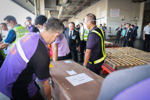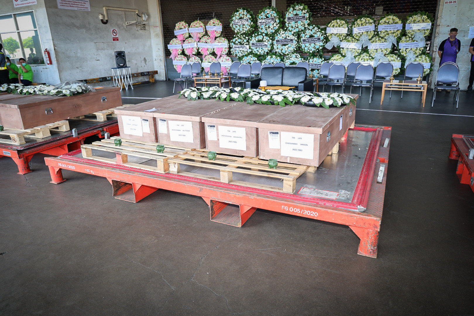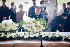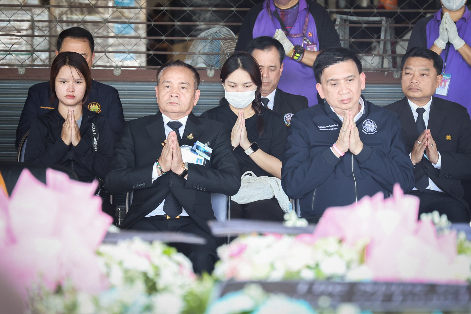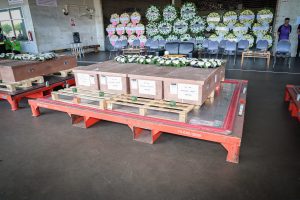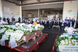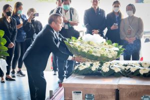 On November 1, 2023, at 12.40 hours, the Labour Minister, Mr. Phiphat Ratchakitprakarn, assigned the Secretariat to the Labour Minister, Mr. Aree Krainara, and the Permanent Secretary of Labour, Mr. P้airoj Chotikasatian, to represent the Ministry of Labour in receiving the bodies of eleven Thai workers who died from the unrest in Israel, laying wreaths to express their condolences. The Director of the Nationality and Legal Affairs Division, Department of Consular Affairs, Ms. Chaowani Tangwongprasert, represented the Ministry of Foreign Affairs. The Ambassador of Israel to Thailand, Mrs. Orna Sagiv, the Ministry of Labour’s Inspector-General, Mr. Samat Pattamasukon, and the Ministry of Labour’s executives from all subordinate agencies joined in the ceremony at the warehouse building area, Suvarnabhumi Airport, Samut Prakan Province.