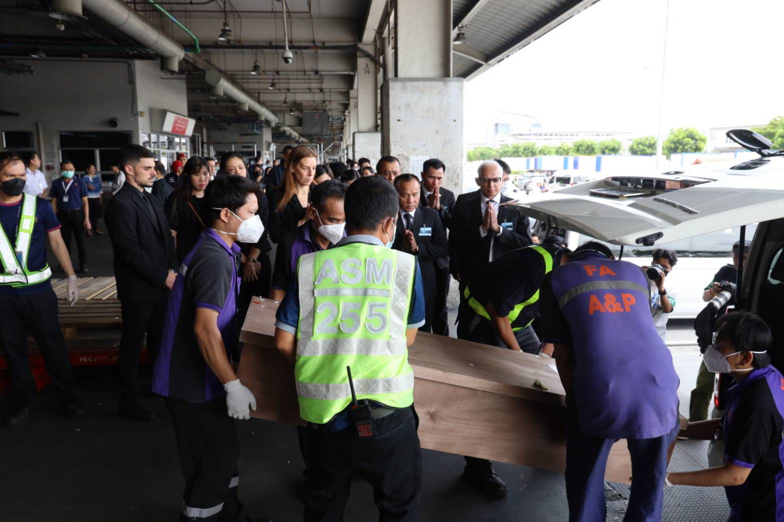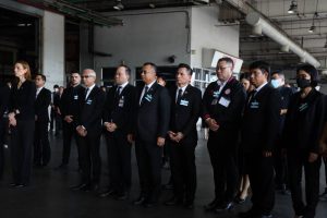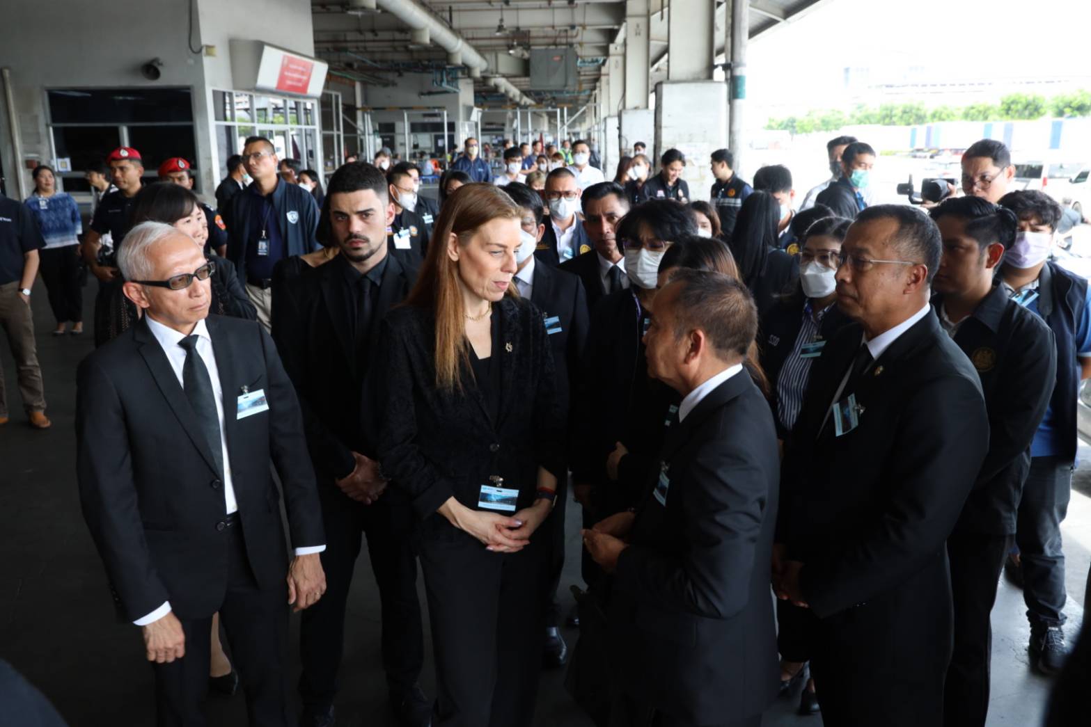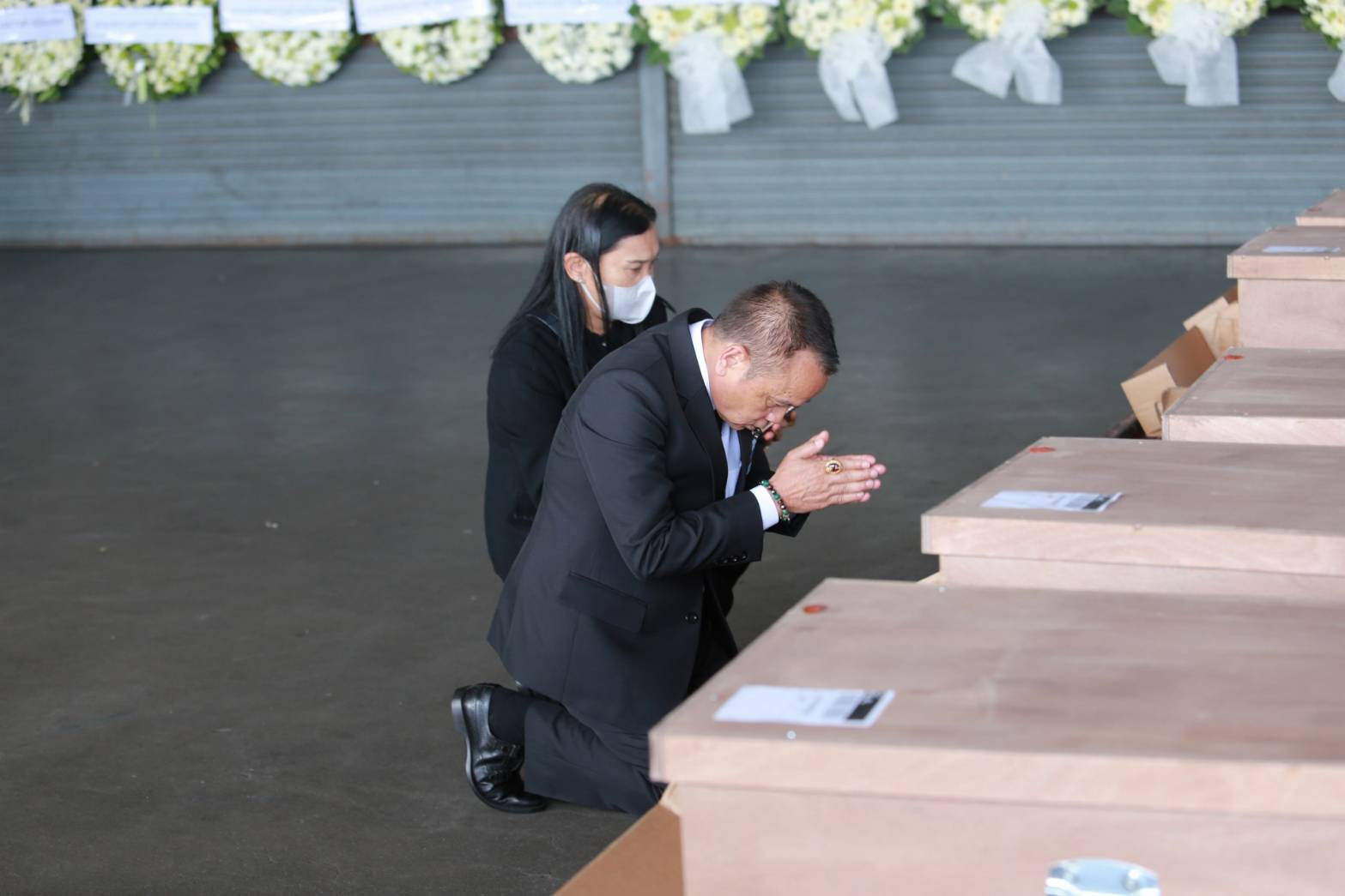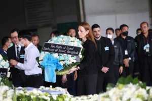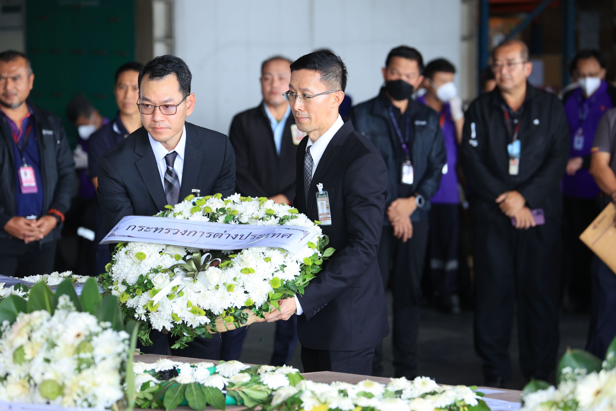 On October 26, 2023, the Labour Minister, Mr. Phiphat Ratchakitprakarn, assigned the Secretariat to the Labour Minister, Mr. Aree Krainara, and the Deputy Permanent Secretary of Labour, Mr. Wannarat Srisuksai, to represent the Ministry of Labour in receiving the bodies of seven Thai workers who died from the unrest in Israel, laying wreaths to express their condolences. The Deputy Minister of Foreign Affairs, Mr. Jakkapong Sangmanee, the Ambassador of Israel to Thailand, Mrs. Orna Sagiv, and the Ministry of Labour’s executives joined in the ceremony at the warehouse building area, Suvarnabhumi Airport, Samut Prakan Province.