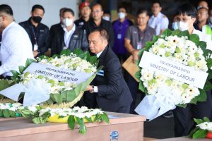 The Secretariat to the Labour Minister, Mr. Aree Krainara, said that today, the Labour Minister, Mr. Phiphat Ratchakitprakarn assigned him, the Deputy Permanent Secretary of Labour, and the Ministry of Labour’s Inspector-General to represent the Ministry of Labour in receiving the bodies of Thai workers who died from the unrest in Israel. The Embassy sent back the bodies of seven Thai workers today, along with 268 Thai workers, on EL AL Airlines, flight LY 083. They arrived at Suvarnabhumi Airport at 10.35 hours. The representatives participated in laying the wreaths of the Labour Minister to express condolences.