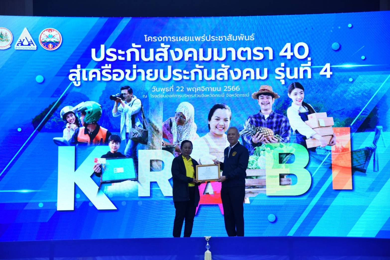 ด้าน นายบุญสงค์ ทัพชัยยุทธ์ เลขาธิการสำนักงานประกันสังคม กระทรวงแรงงาน เปิดเผยว่า สำนักงานประกันสังคมได้จัดโครงการเผยแพร่ประชาสัมพันธ์ประกันสังคมมาตรา 40 สู่เครือข่ายประกันสังคม ขึ้นจำนวน 4 รุ่น โดยรุ่นที่ 1 จัดที่จังหวัดนครศรีธรรมราช รุ่นที่ 2 จัดที่จังหวัดนราธิวาส รุ่นที่ 3 จัดที่จังหวัดสงขลา และรุ่นที่ 4 จัดขึ้นในวันนี้ ที่จังหวัดกระบี่ โดยได้รับความสนใจจาก ผู้ประกอบอาชีพอิสระ เครือข่ายประกันสังคม อาสาสมัครแรงงาน ผู้นำชุมชน กำนัน ผู้ใหญ่บ้าน รวมทั้ง 4 รุ่น จำนวน 1,600 คน ทั้งนี้ภายในงานยังมีกิจกรรมต่างๆ ที่มีประโยชน์ต่อผู้เข้าร่วมโครงการ เช่น การให้บริการรับสมัครผู้ประกันตนตามมาตรา 40 การอภิปรายร่วมแลกเปลี่ยนความรู้ด้านการประกันสังคม การให้บริการฉีดวัคซีนไข้หวัดใหญ่ รวมถึงการจัดนิทรรศการต่างๆ ของหน่วยงานในสังกัดกระทรวงแรงงาน การออกร้านจำหน่ายสินค้าของและกิจกรรมต่างๆ ของภาคีเครือข่ายอีกด้วย
